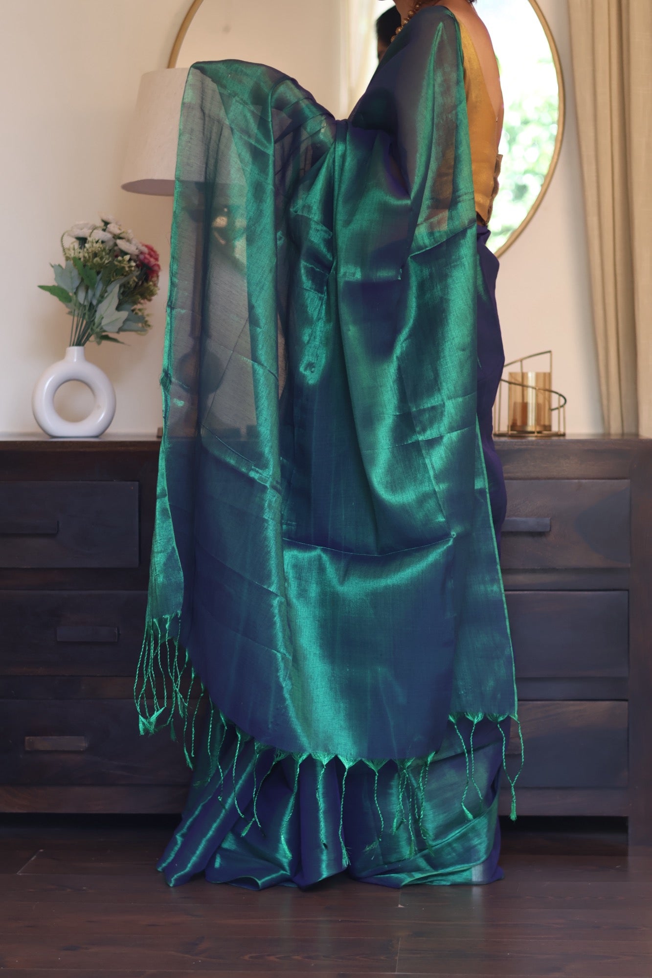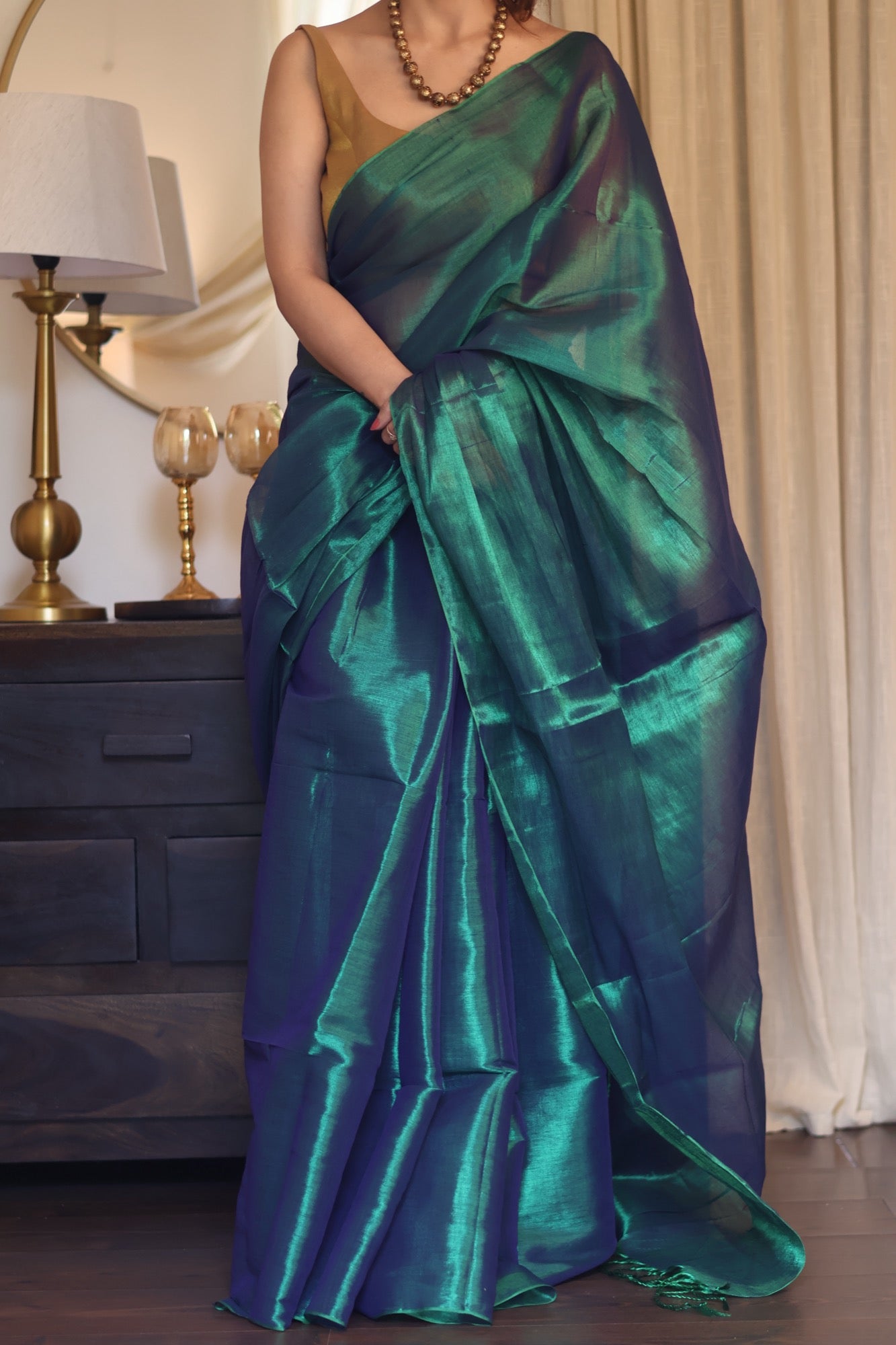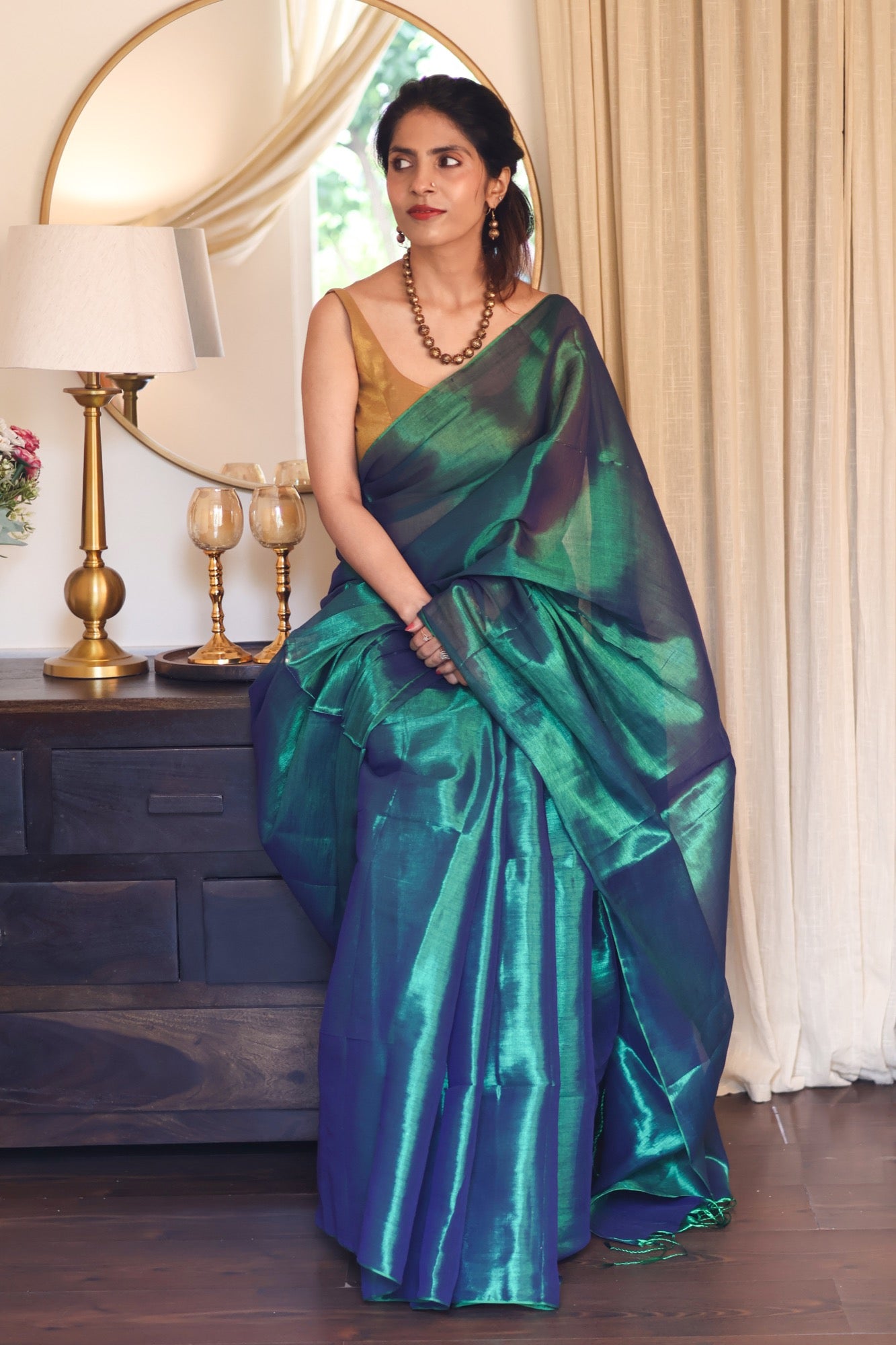 Deep teal merges into ocean green in Aira a saree that feels like fluid light in motion. With its metallic lustre and effortless fall, this piece speaks of quiet sophistication. Ideal for evenings when you want your presence to shimmer.
