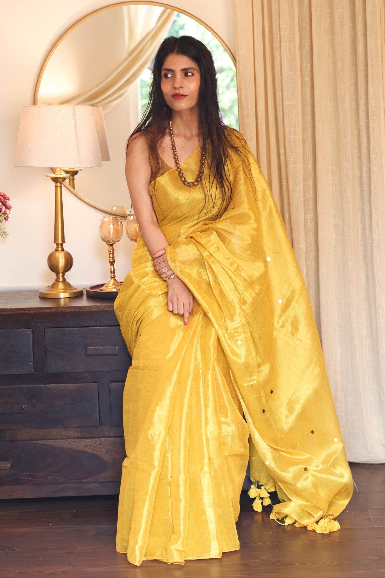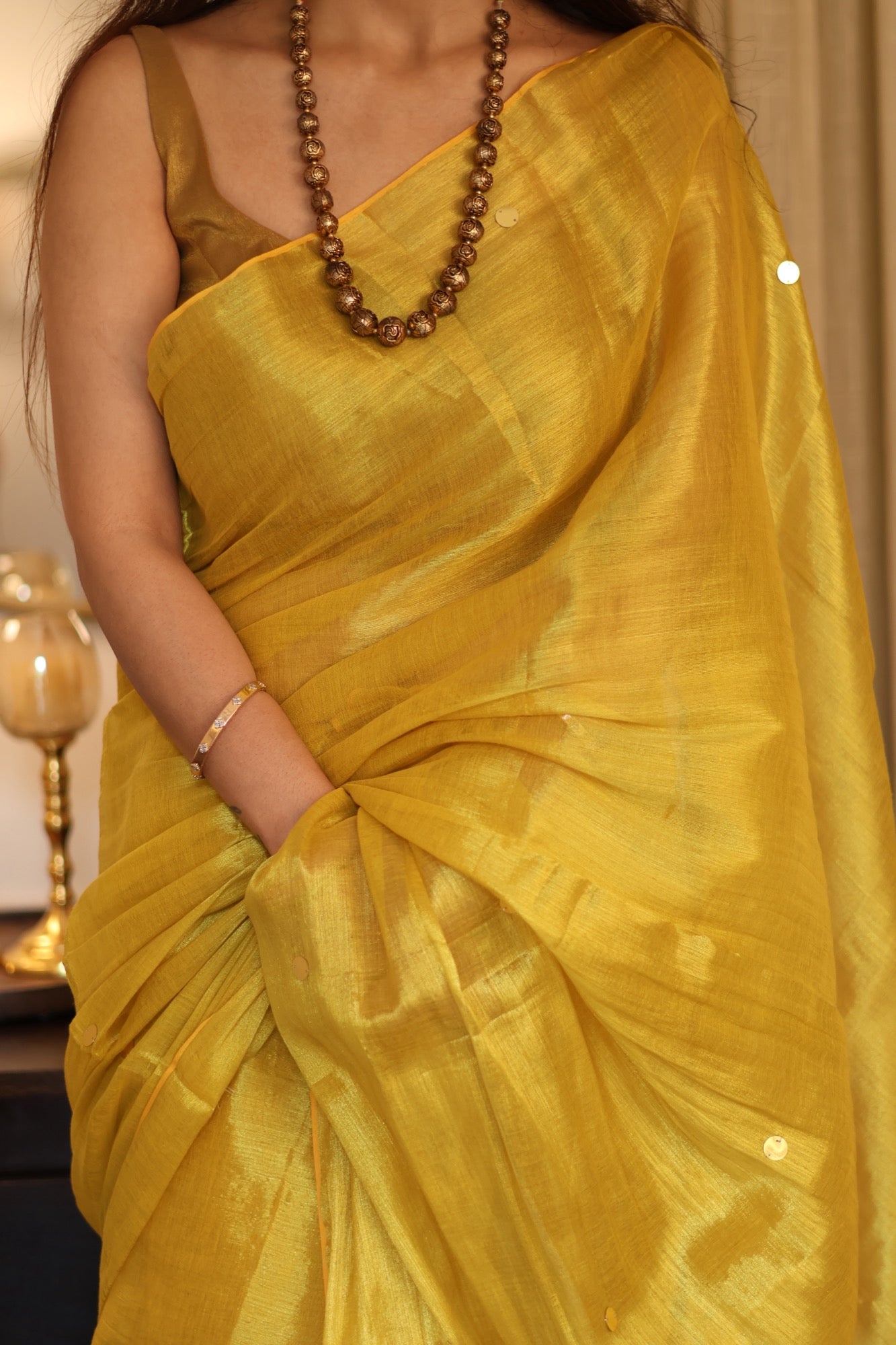 Glowing like the golden blossoms of summer, Amaltas is a khadi tissue saree that pairs traditional texture with modern whimsy. Tiny circular motifs add a touch of playfulness to its rich golden drape perfect for daytime festivities, haldi mornings, or slow, sunlit celebrations.