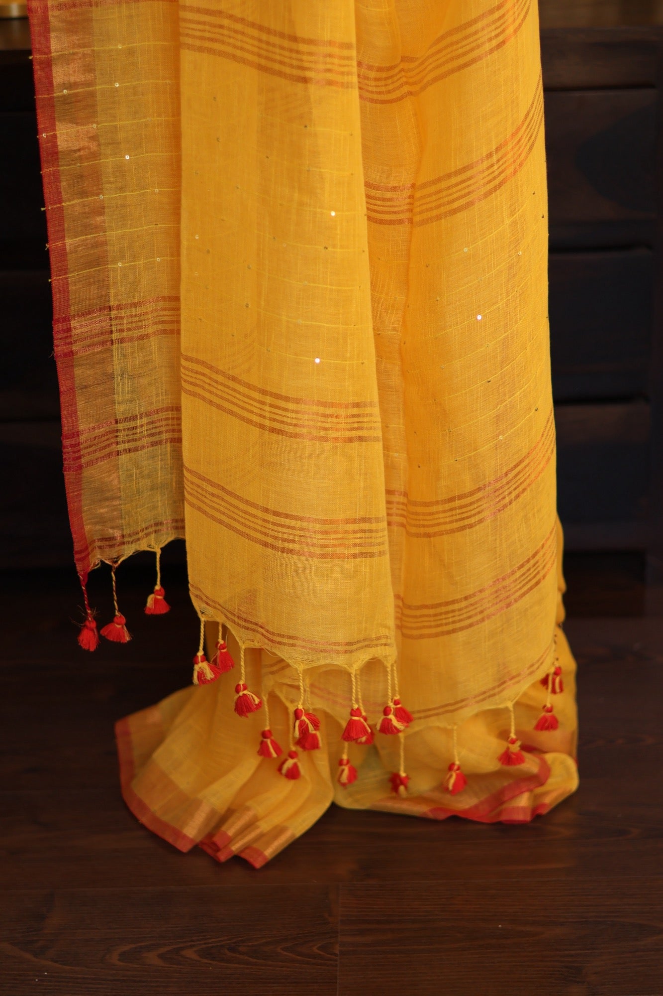 Colour: Yellow with golden zari border and scattered sequin motifs