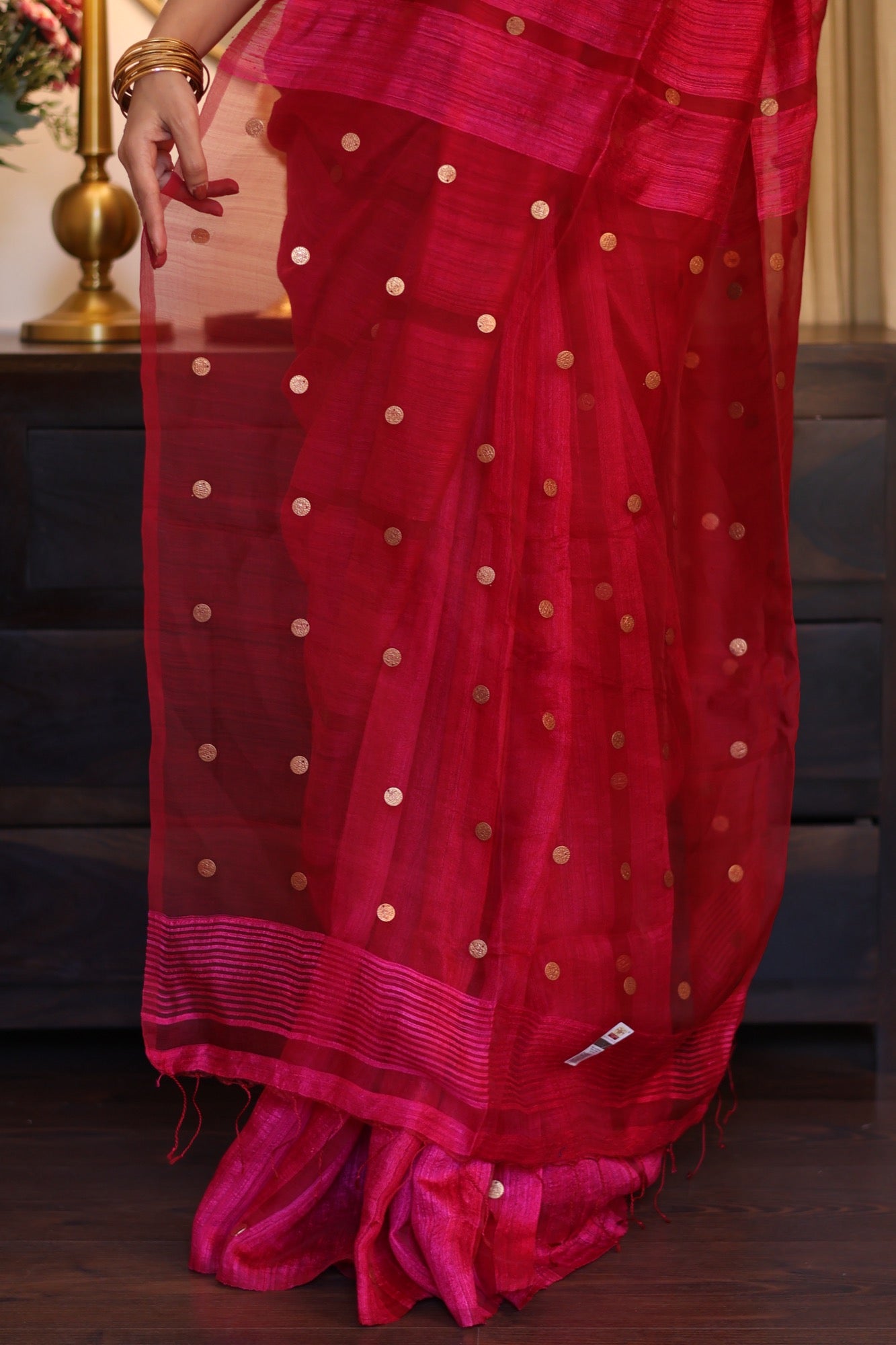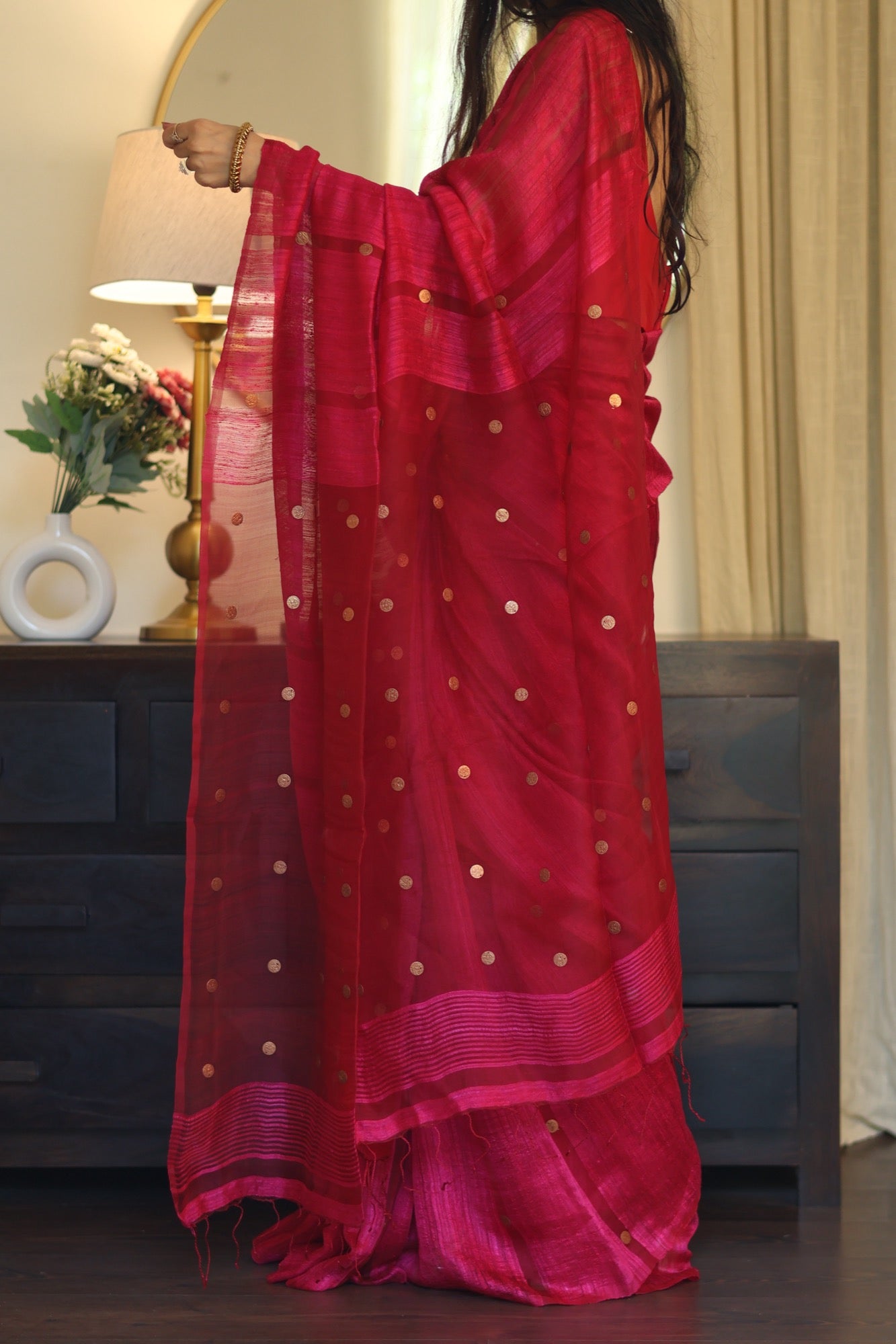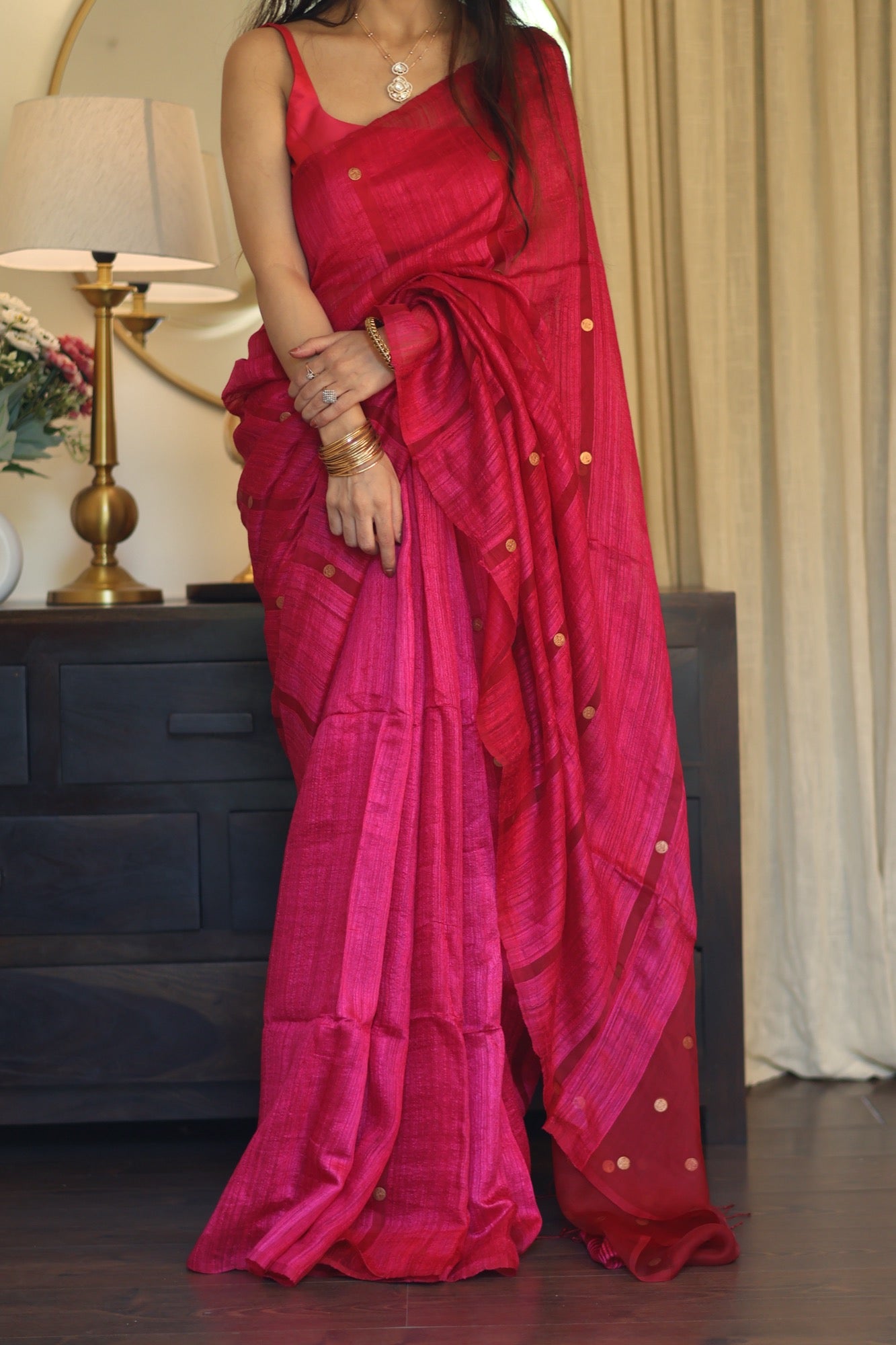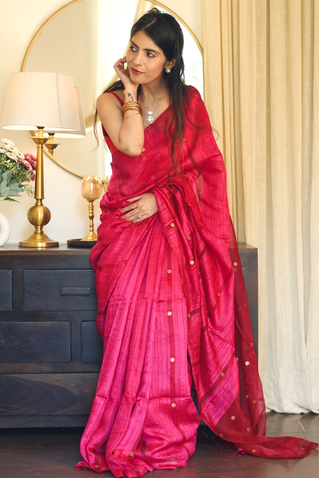 Playful yet poised Blush Coin brings together the gentle sheen of pure matka silk with the charm of engraved golden coins. In bright pink hue that flatters every mood and moment, it’s a drape that feels festive without the fuss light, graceful, and beautifully rooted in craft.