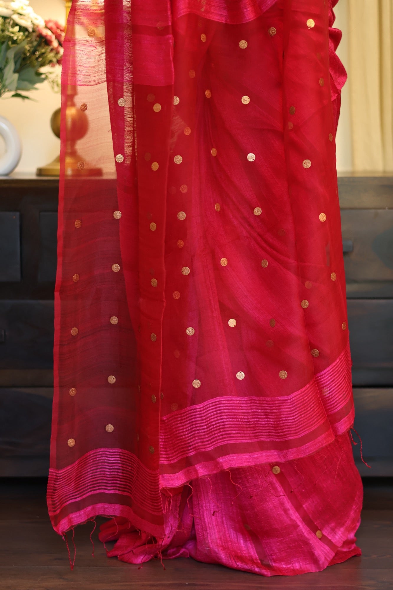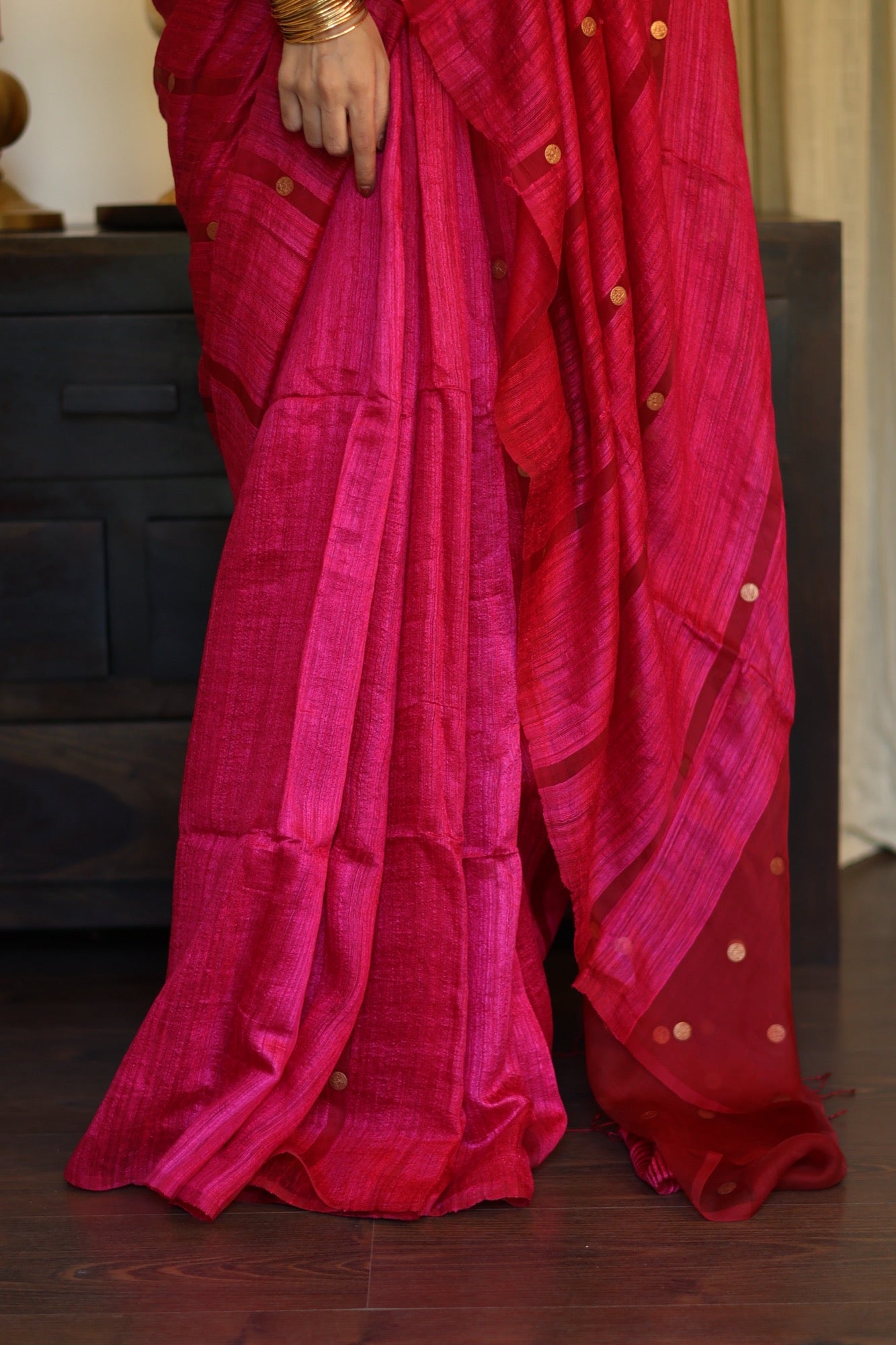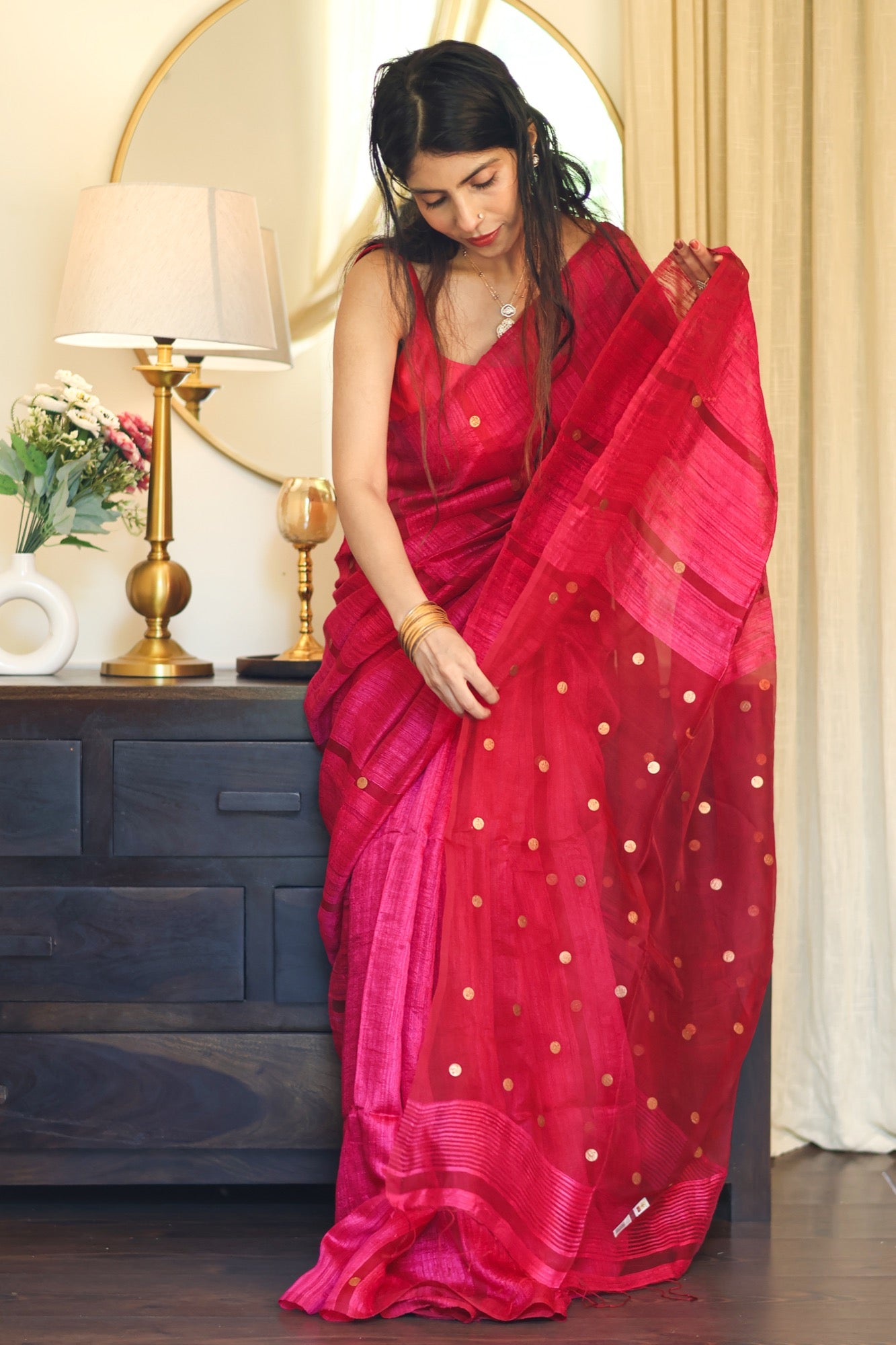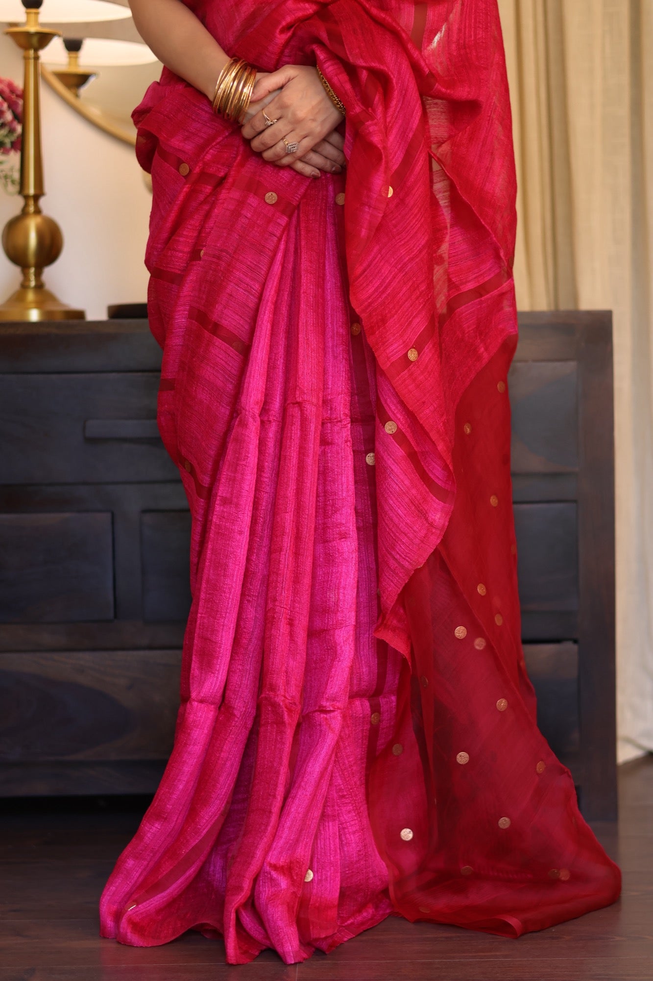 Playful yet poised Blush Coin brings together the gentle sheen of pure matka silk with the charm of engraved golden coins. In bright pink hue that flatters every mood and moment, it’s a drape that feels festive without the fuss light, graceful, and beautifully rooted in craft.