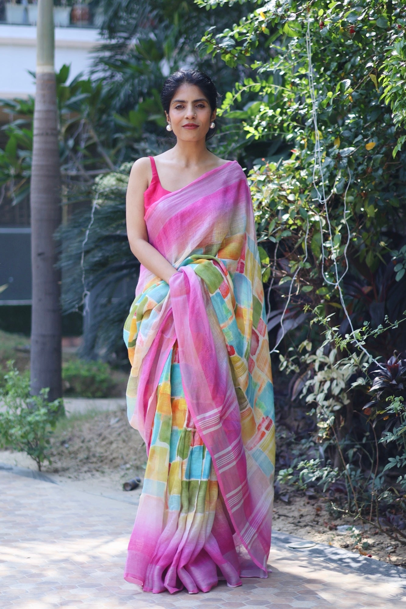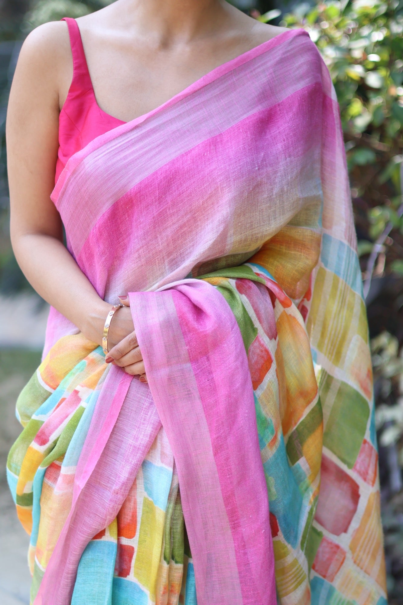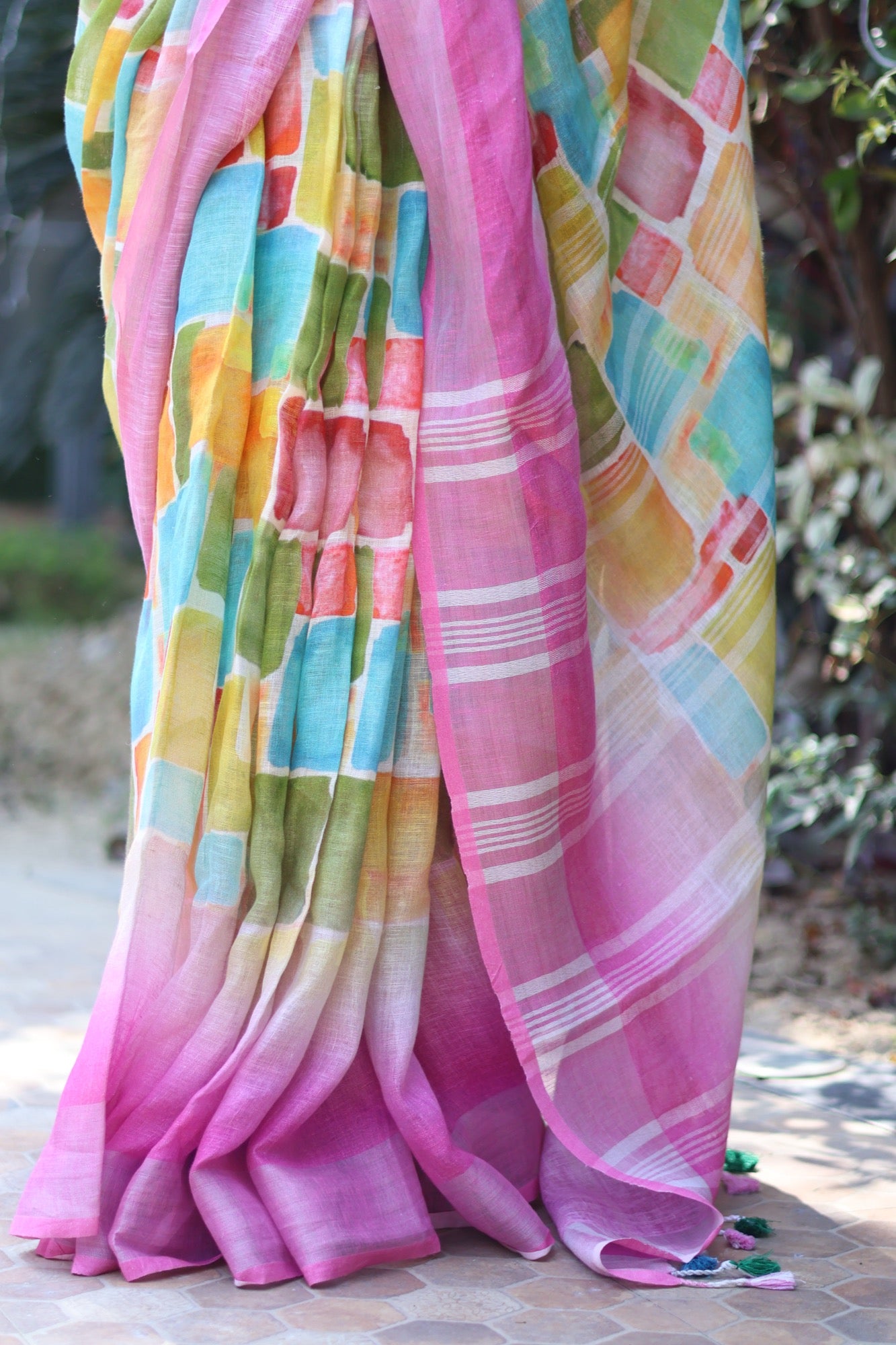 With vibrant digital blocks of ochre, teal, olive, and coral melting into each other, this pure linen saree feels like a masterpiece come alive.