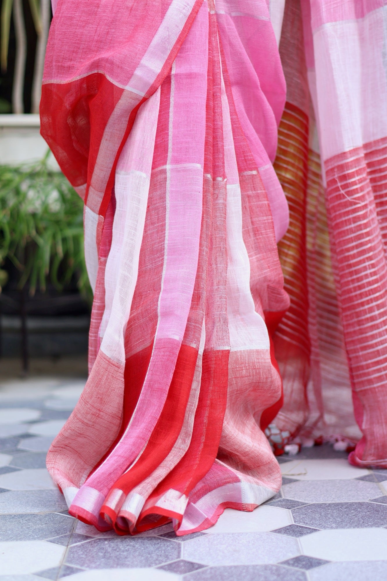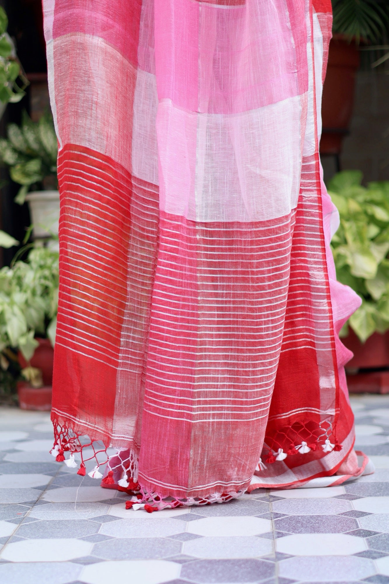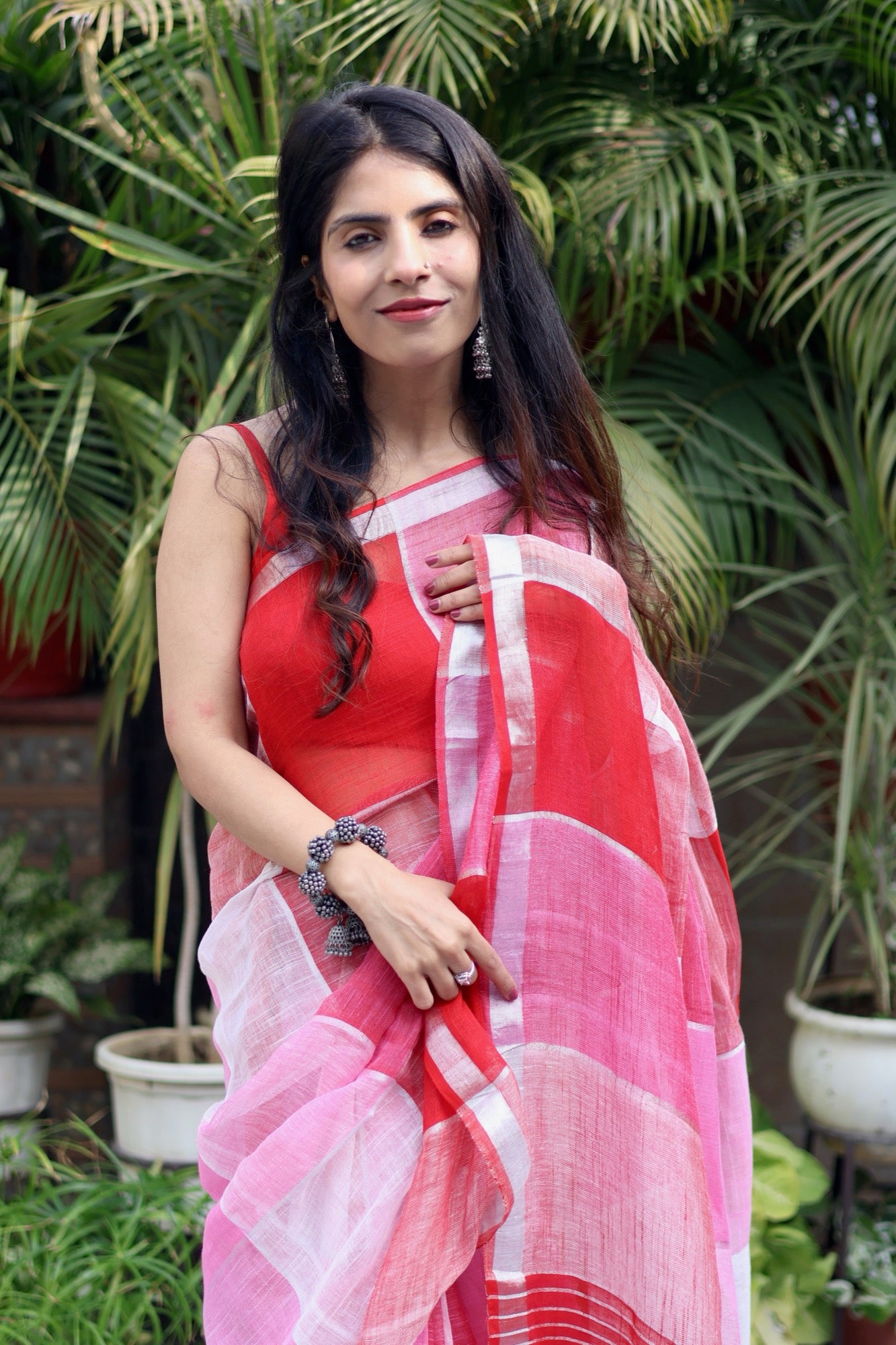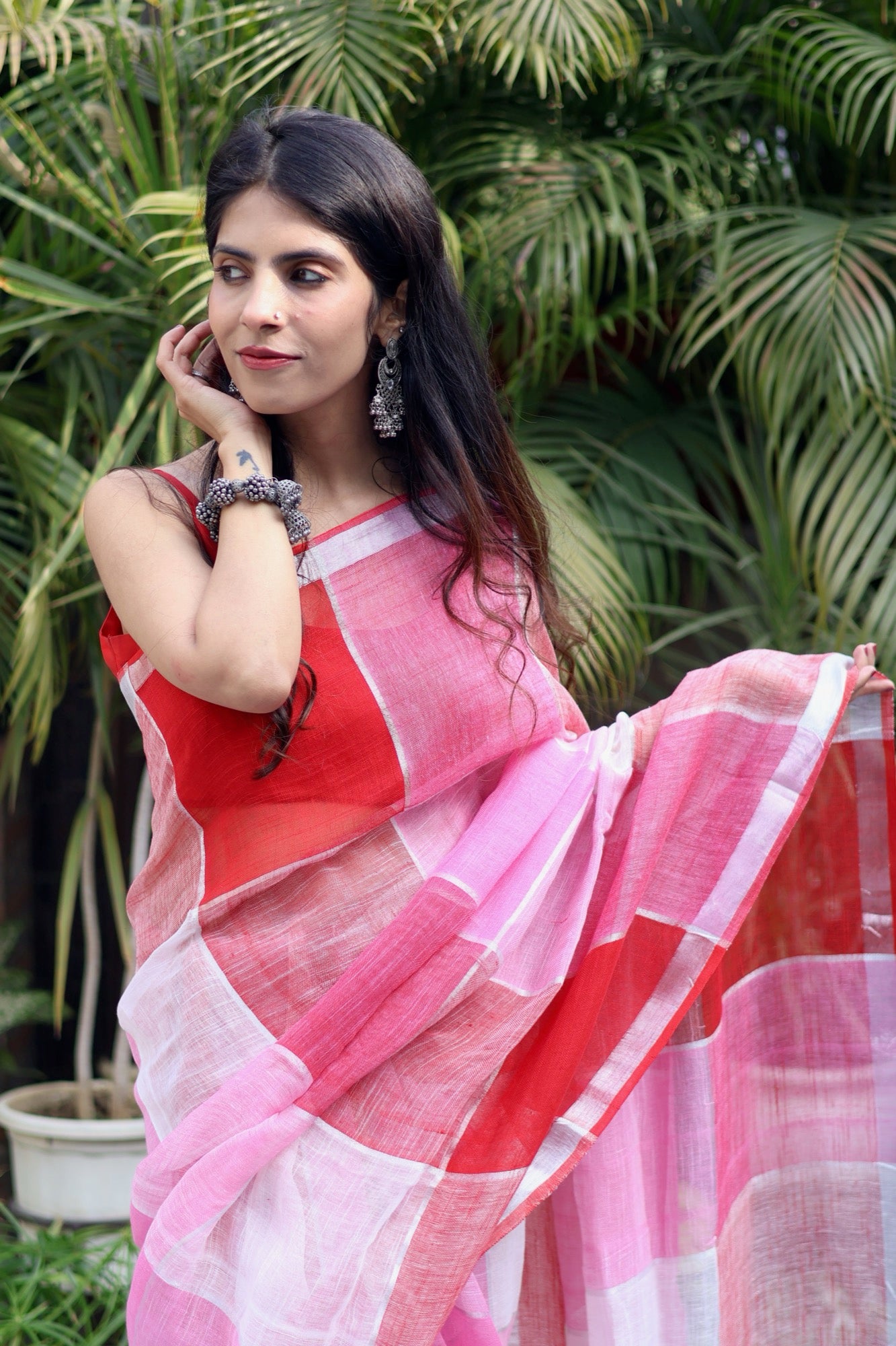 A little bit bold, a little bit sweet — just like a scoop of strawberry and a swirl of fresh cream. This saree plays with blocks of candy pink, soft blush and rich strawberry red, creating a cheerful, playful palette that instantly stands out. The lightweight linen-cotton blend makes it airy and easy to drape, perfect for breezy lunches, festive days, or when you simply feel like dressing happy.