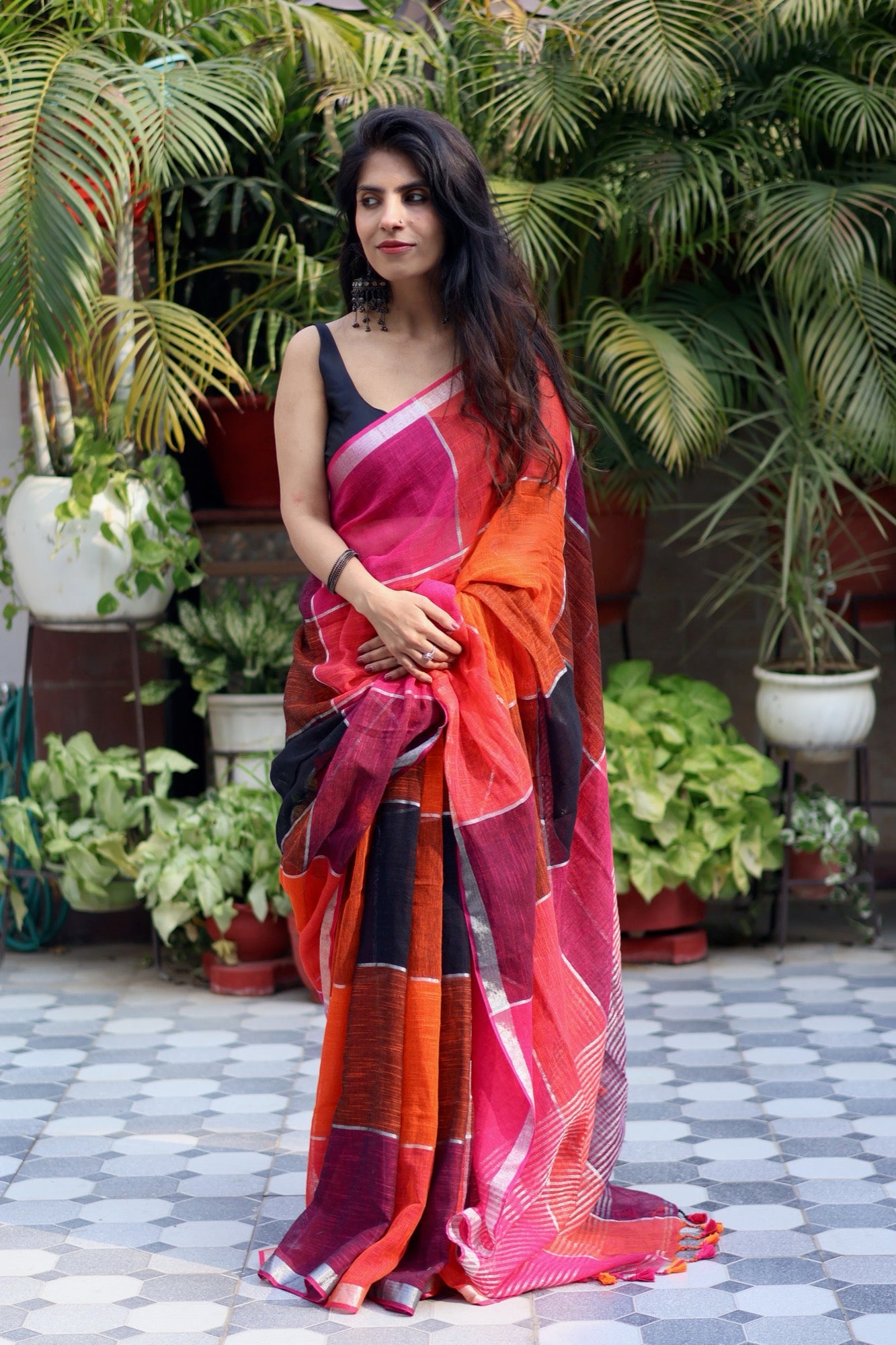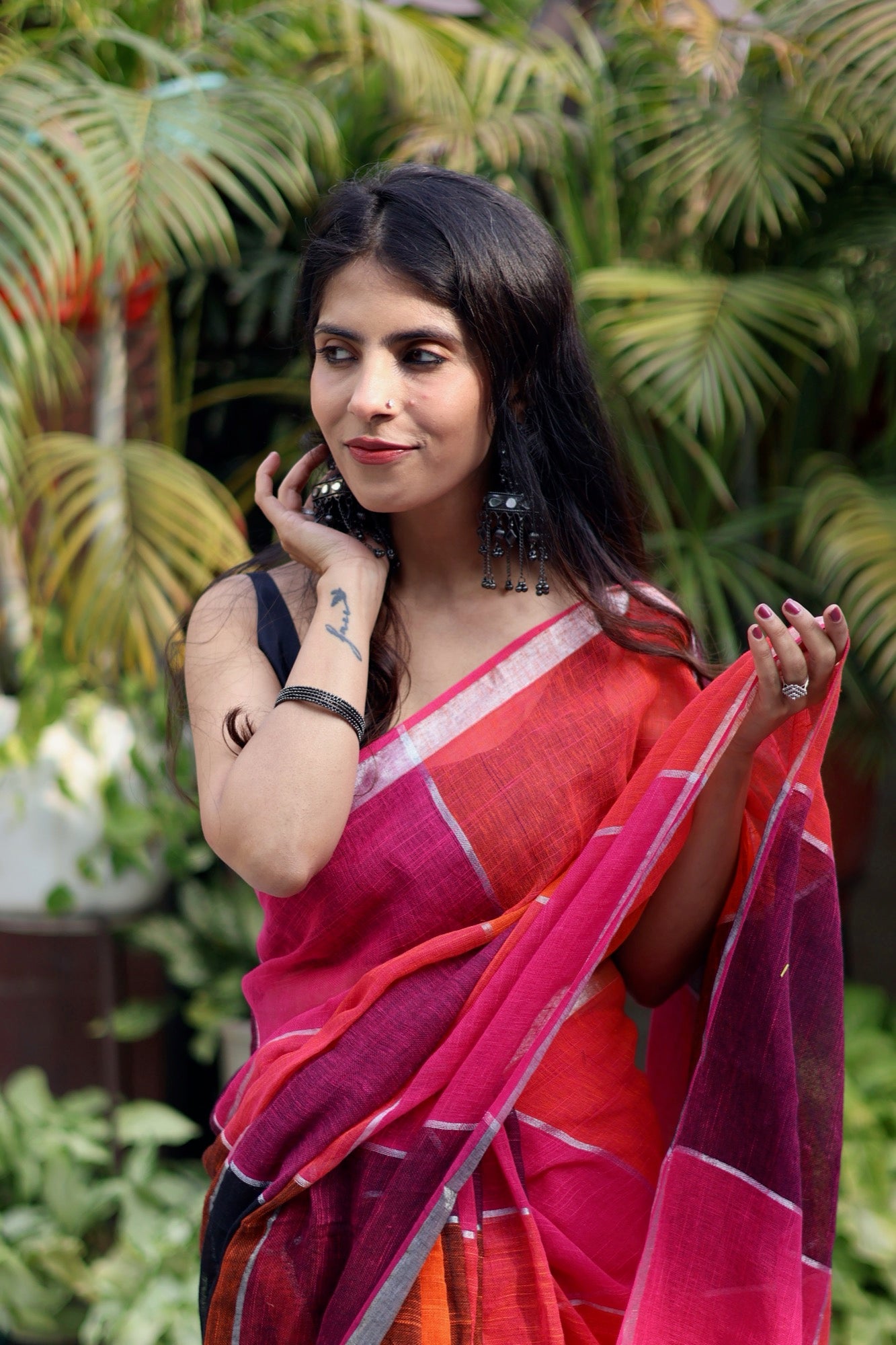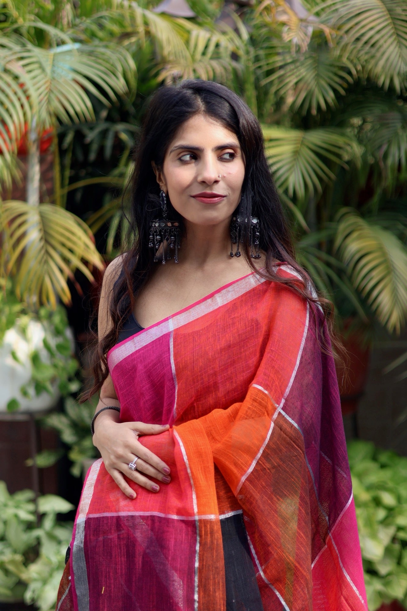 Bold and full of flavour — Berry Blast is that statement scoop you never skip. Think mixed berries in a bowl: raspberry pink, ripe blackberry, and a hint of plum, blended with strokes of tangerine and framed with soft white checks. The linen-cotton weave keeps it featherlight and breathable, so the colours may be intense, but the drape feels easy, fluid, and utterly comfortable.