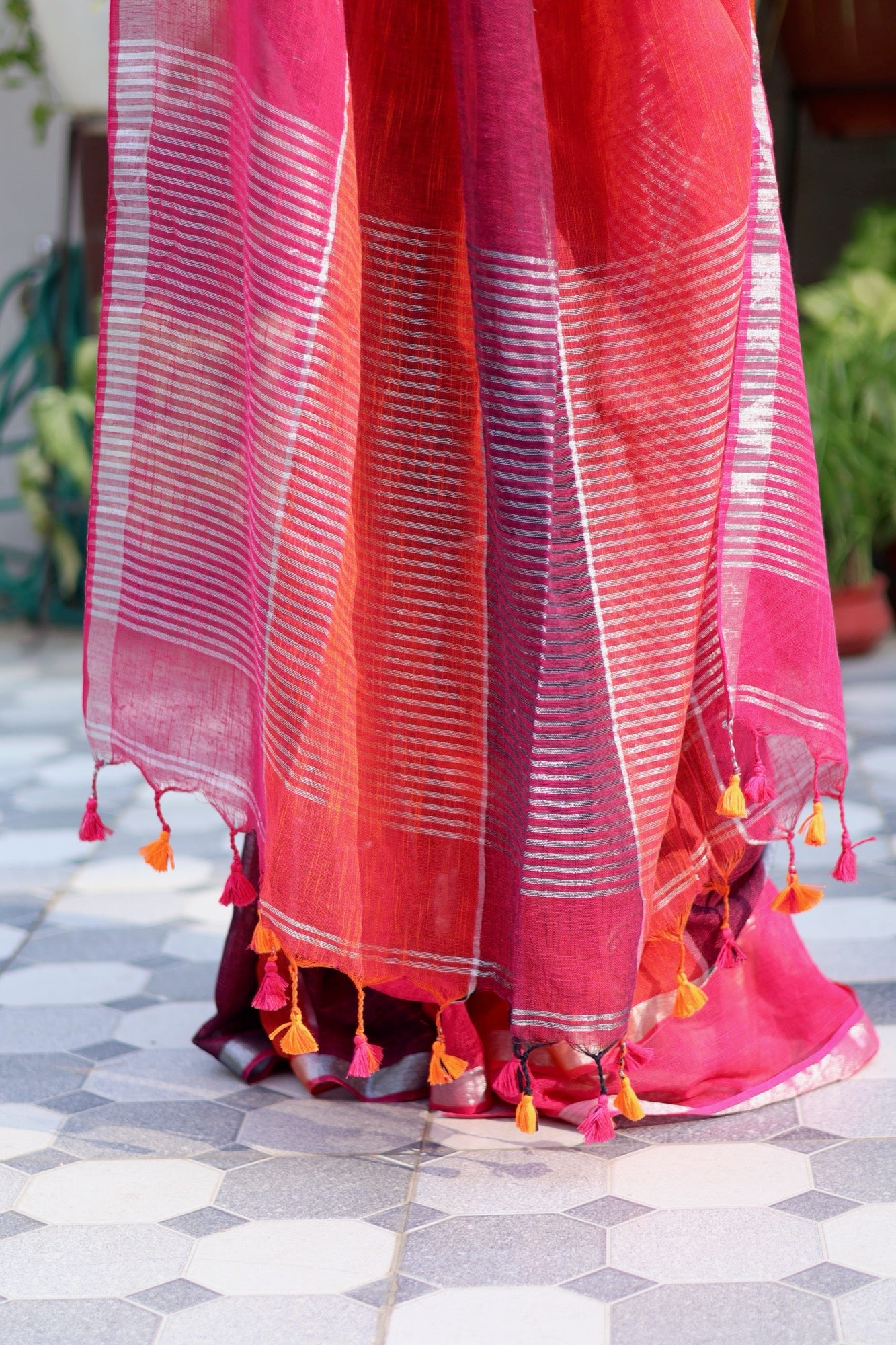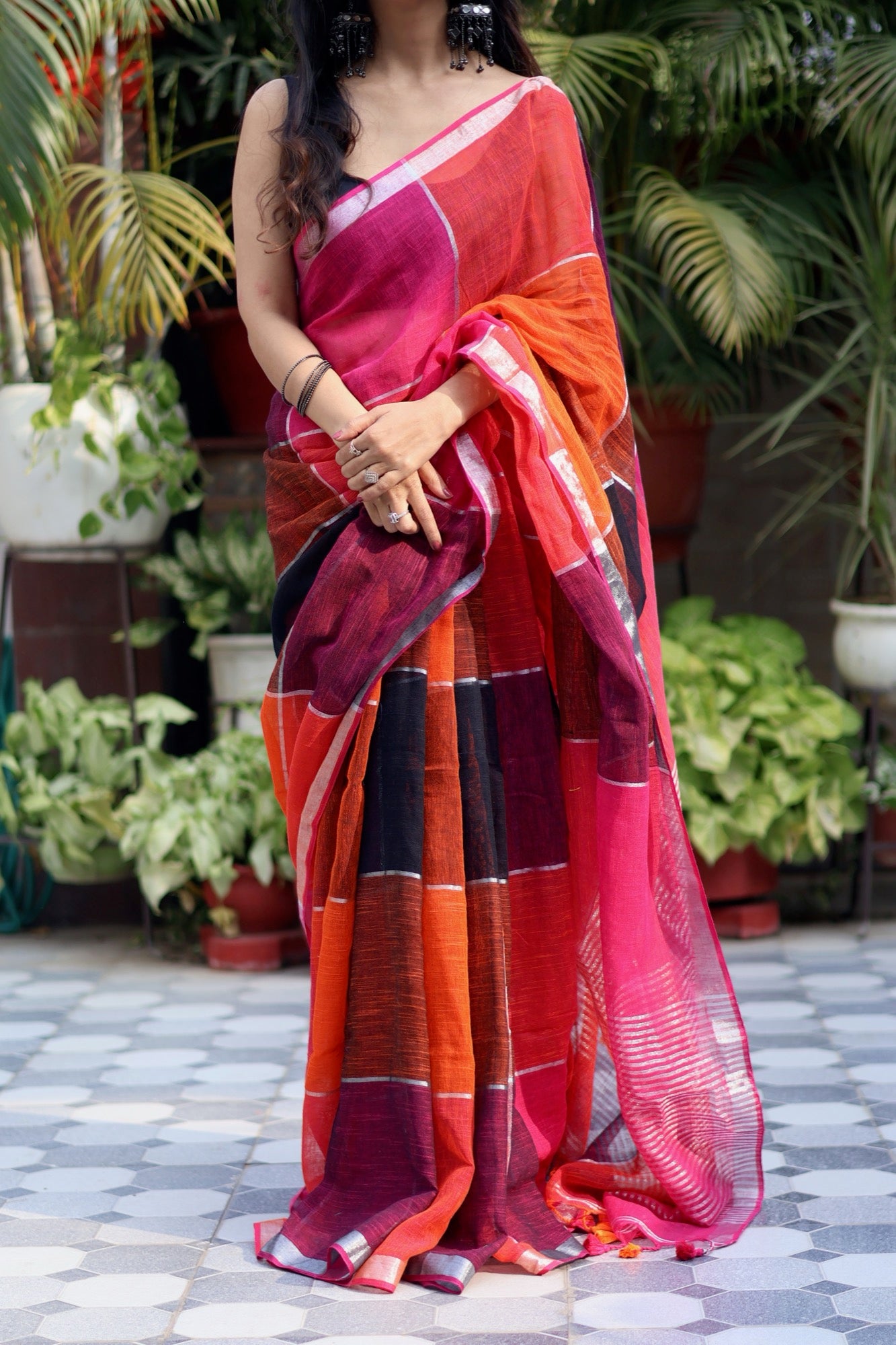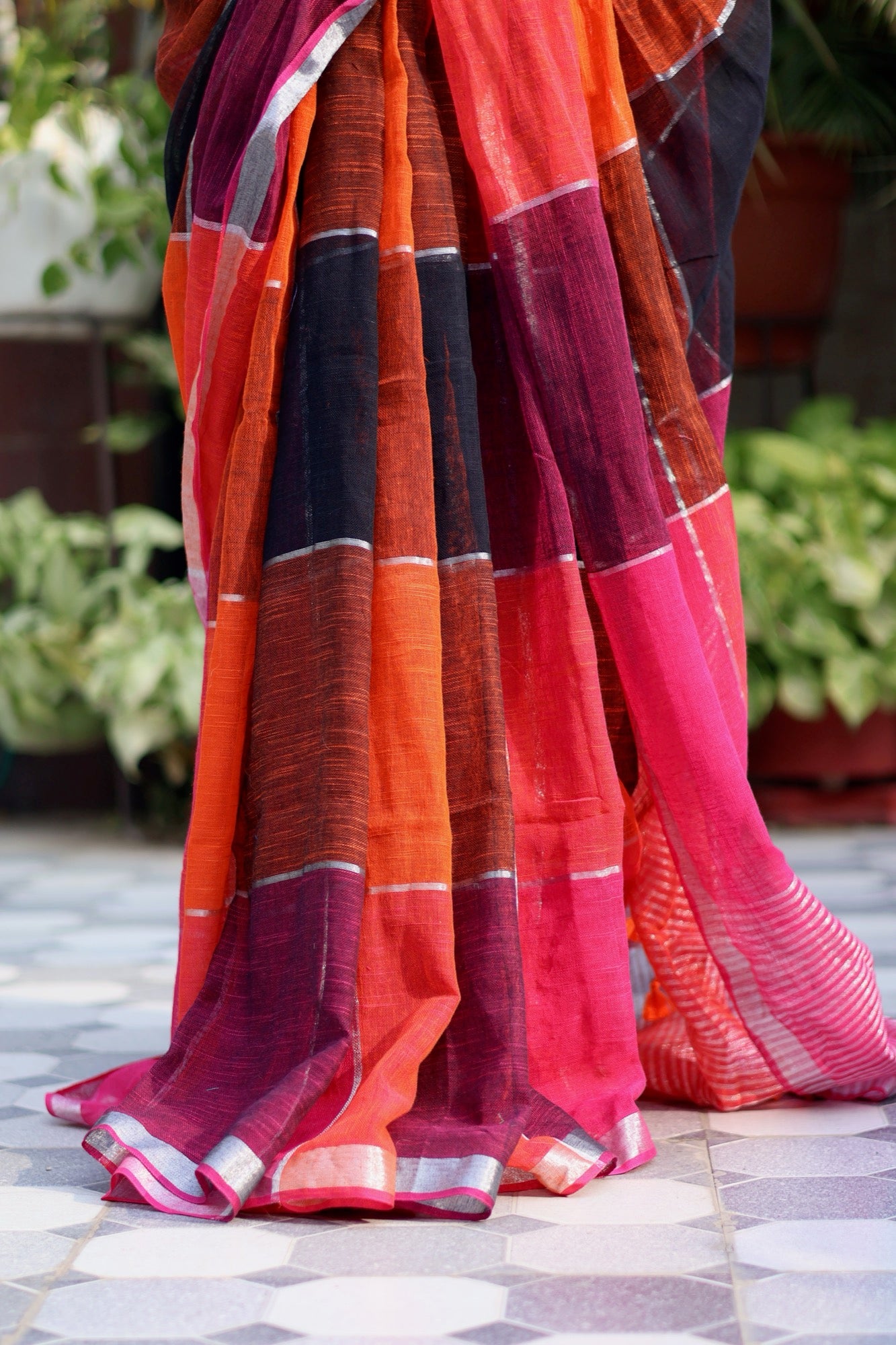 Bold and full of flavour — Berry Blast is that statement scoop you never skip. Think mixed berries in a bowl: raspberry pink, ripe blackberry, and a hint of plum, blended with strokes of tangerine and framed with soft white checks. The linen-cotton weave keeps it featherlight and breathable, so the colours may be intense, but the drape feels easy, fluid, and utterly comfortable.