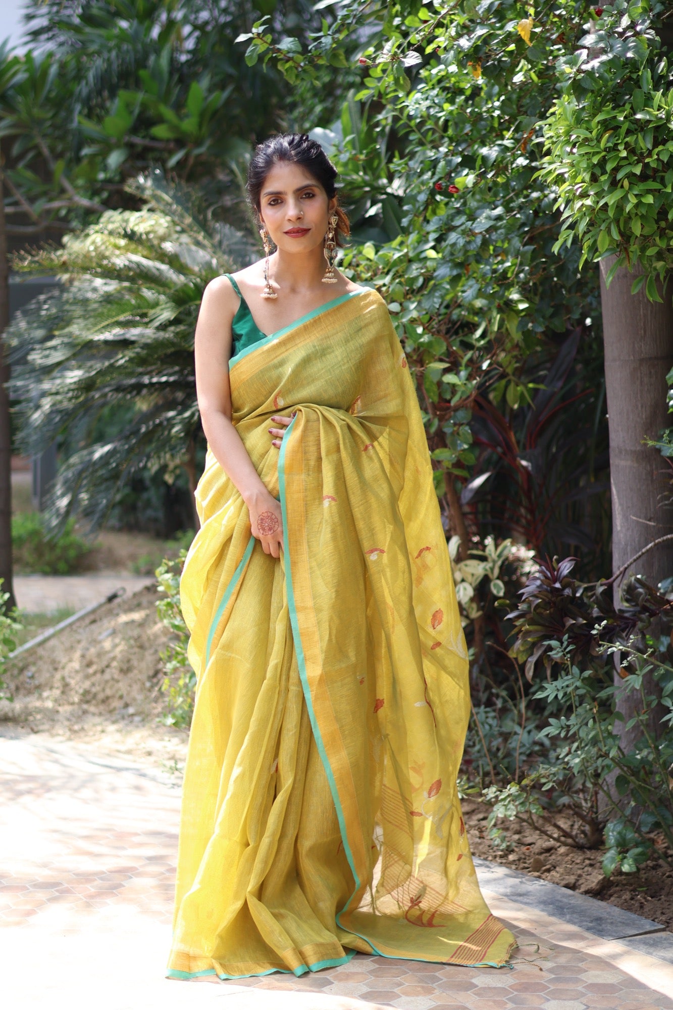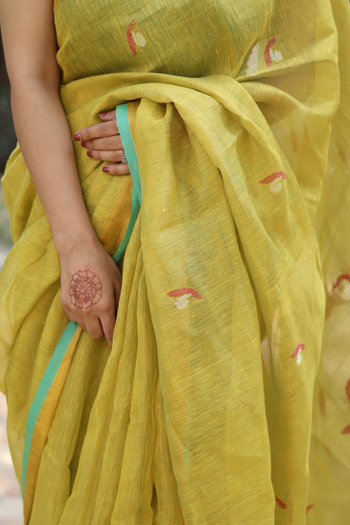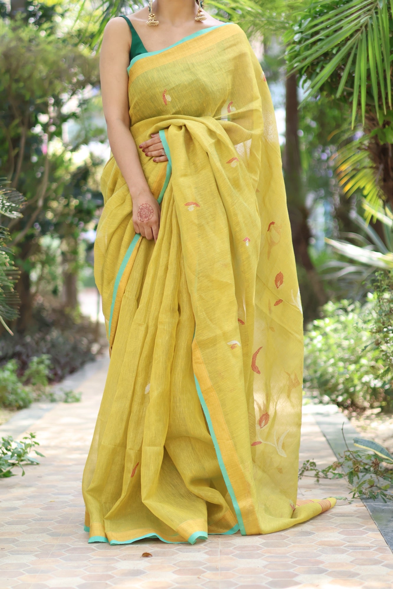 Fresh, zesty, and full of life Elaichi is a gentle burst of warmth in tissue linen, touched with hints of turquoise along the border. Lightweight and luminous, it’s the saree that lifts your mood and turns an ordinary day into a reason to smile.