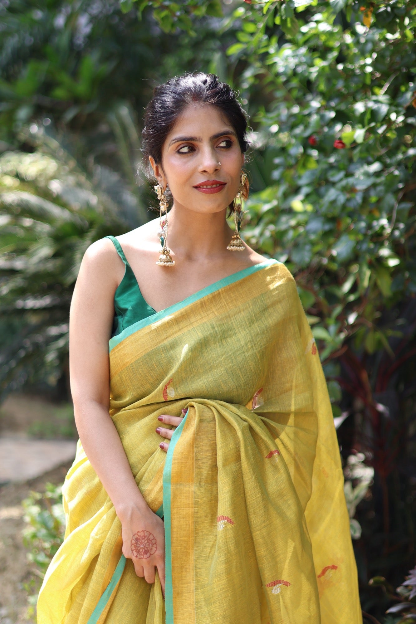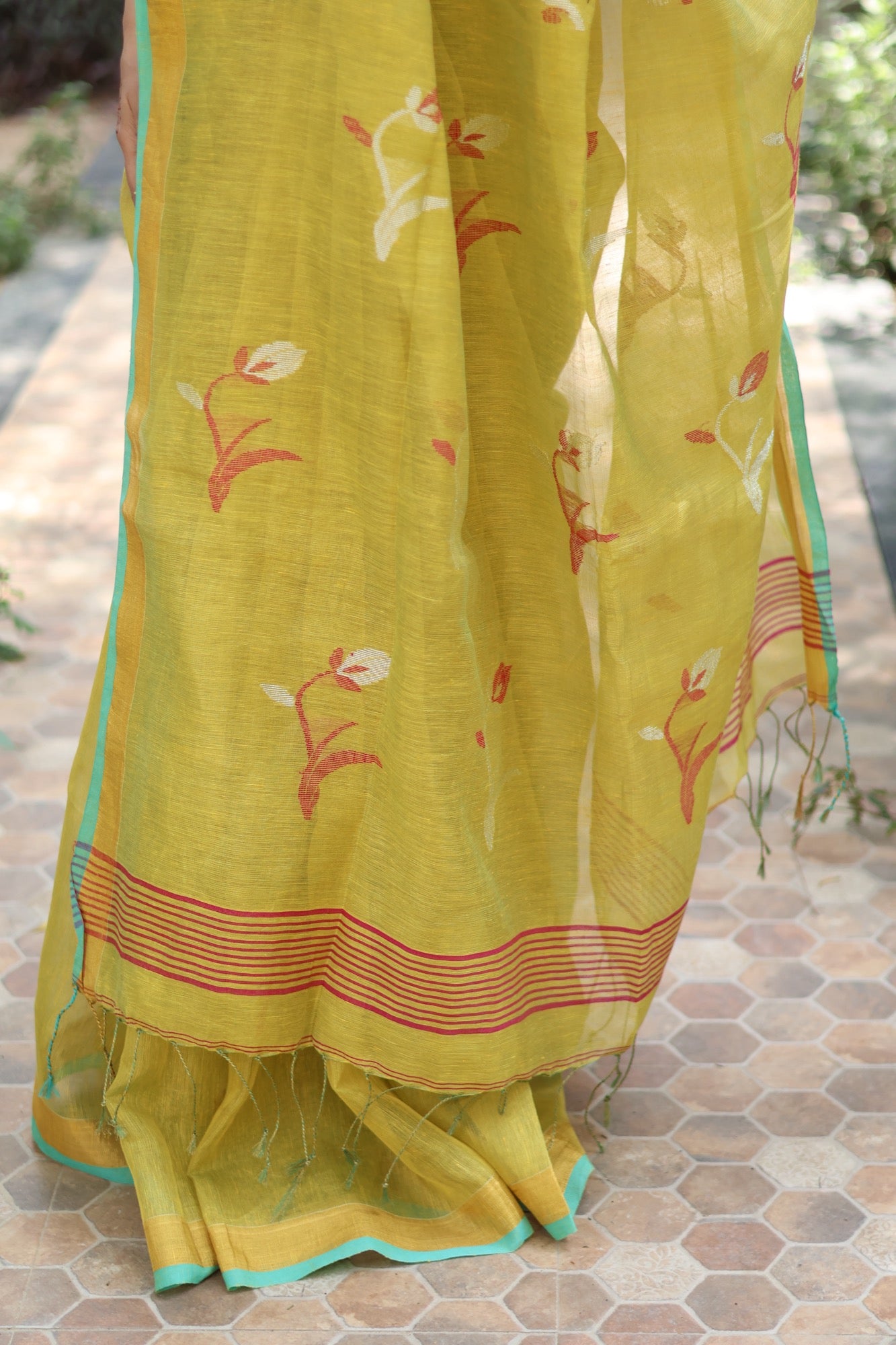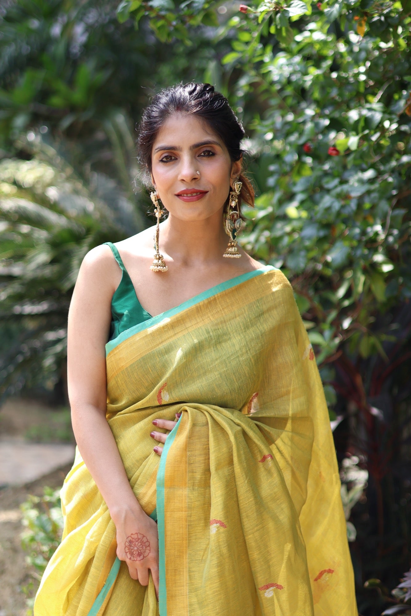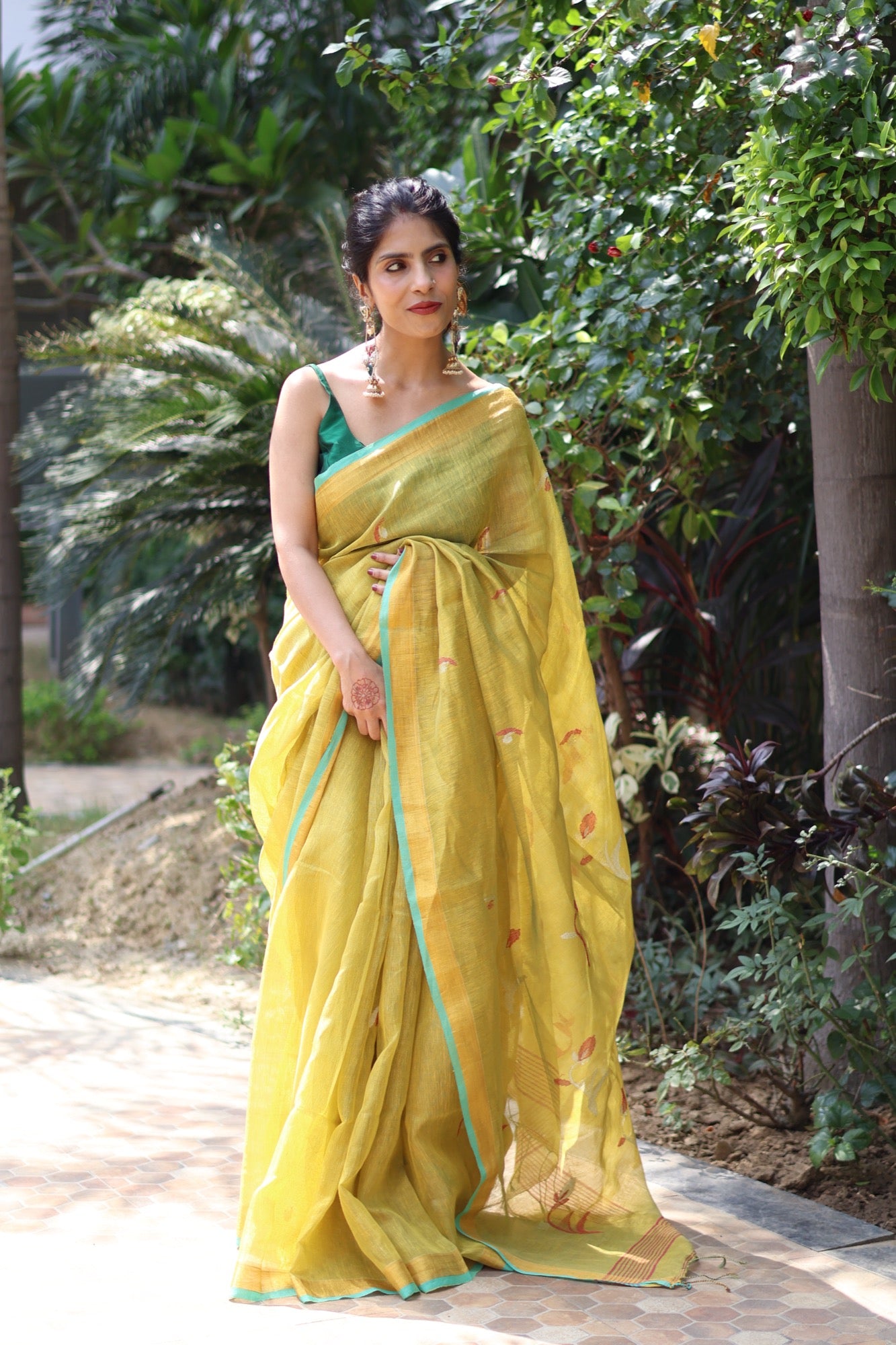 Fresh, zesty, and full of life Elaichi is a gentle burst of warmth in tissue linen, touched with hints of turquoise along the border. Lightweight and luminous, it’s the saree that lifts your mood and turns an ordinary day into a reason to smile.