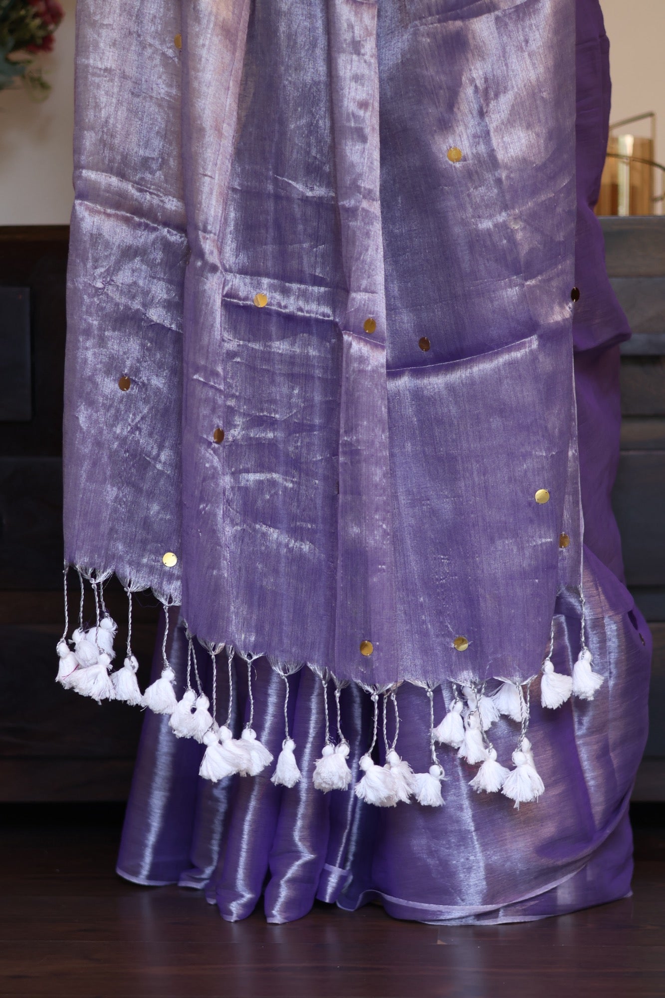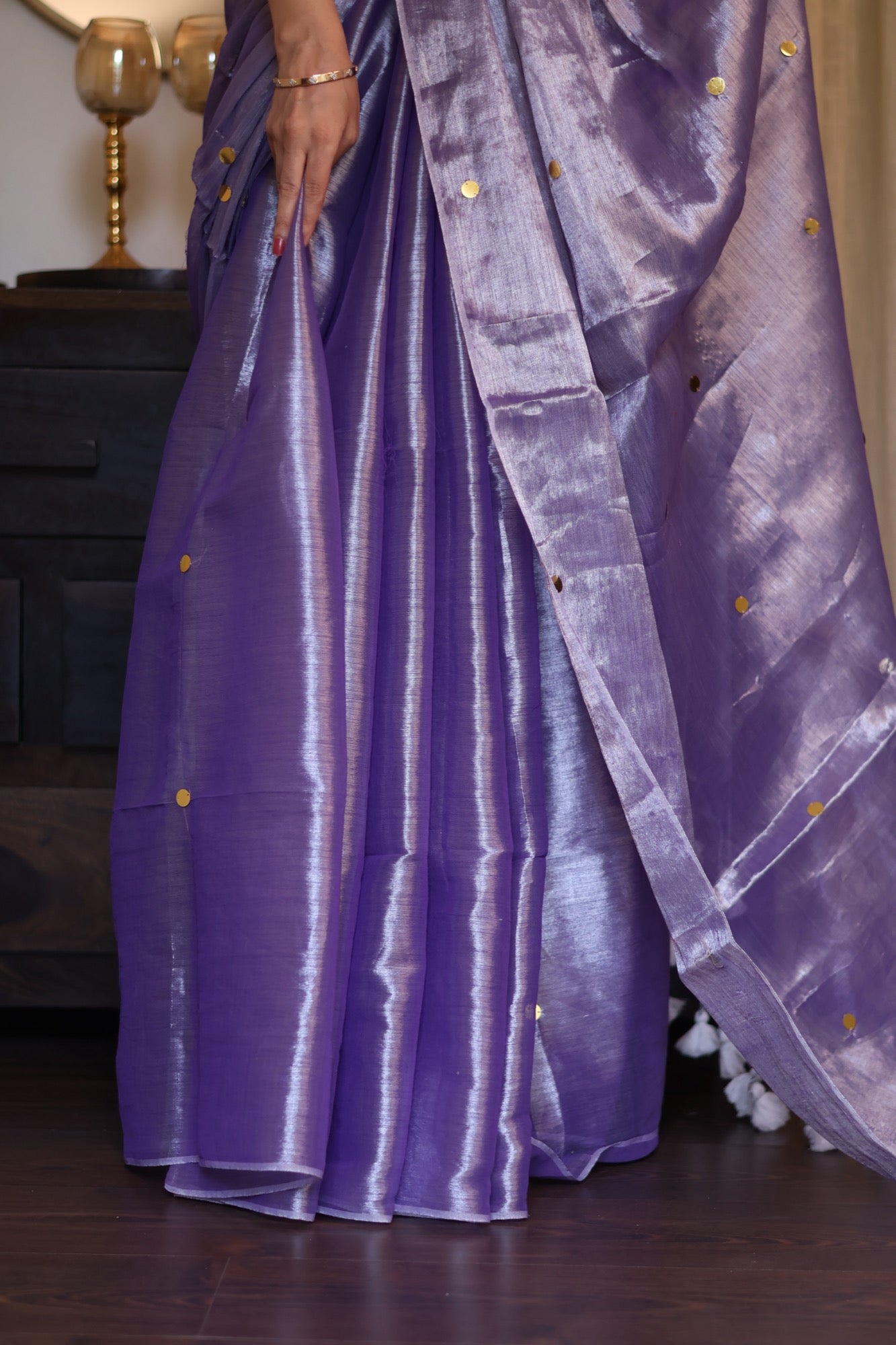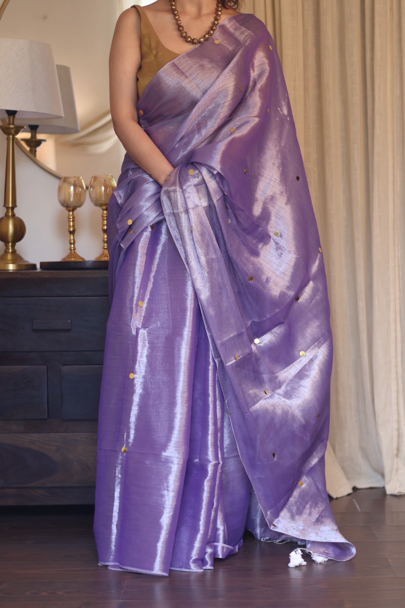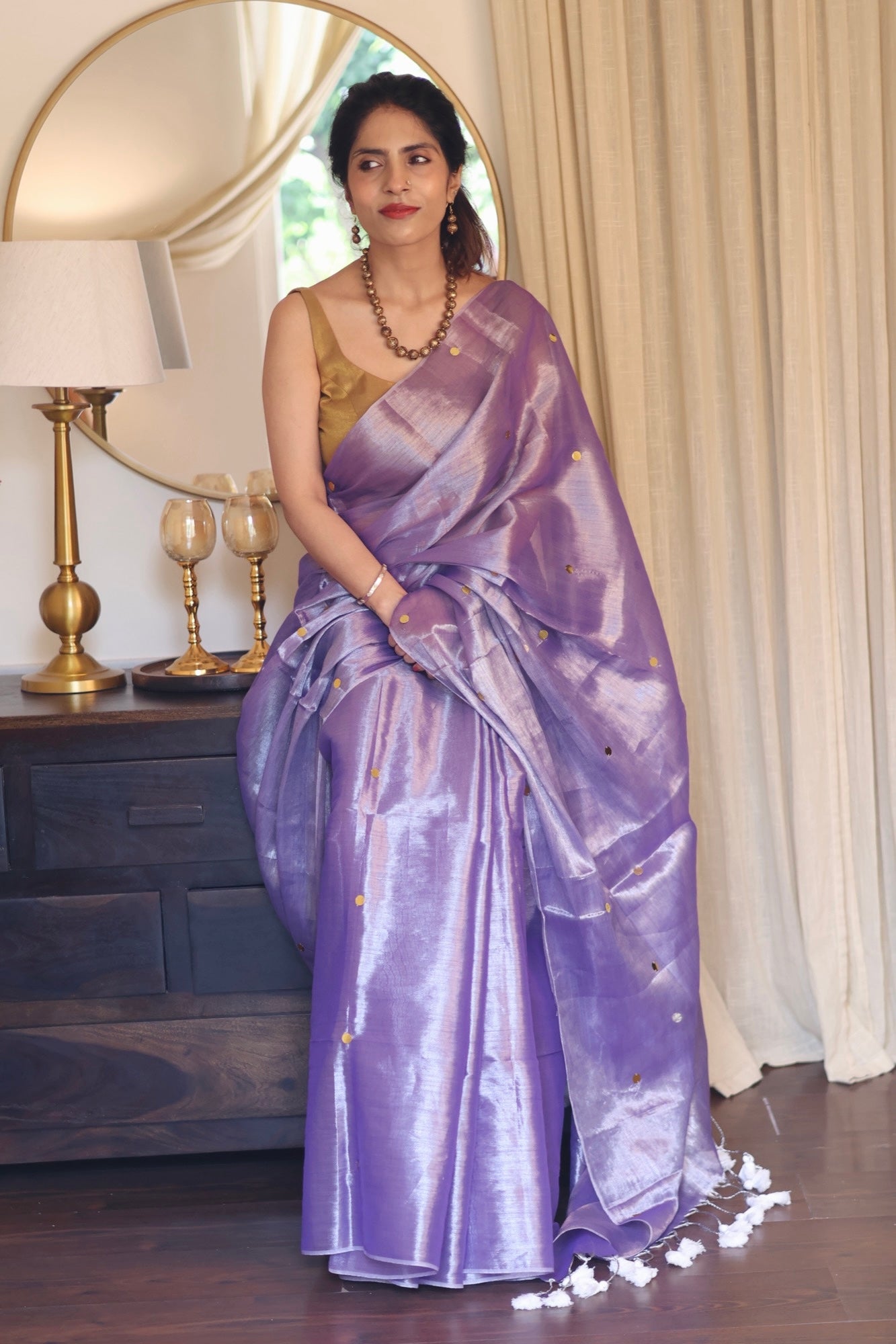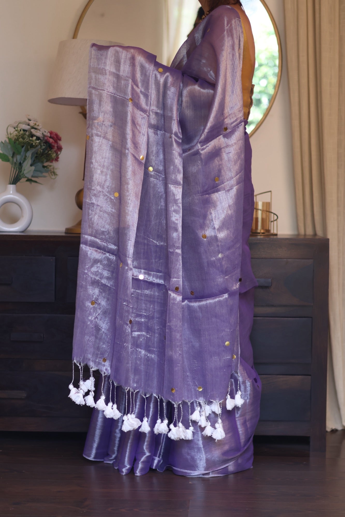 Soft as a sigh, radiant as dusk Falak is a metallic tissue saree in lilac and silver, dotted with delicate motifs and finished with white tassels. Its sheen moves like light across water, making it a perfect choice for evening gatherings, intimate celebrations, or quiet festive moments that still feel special.