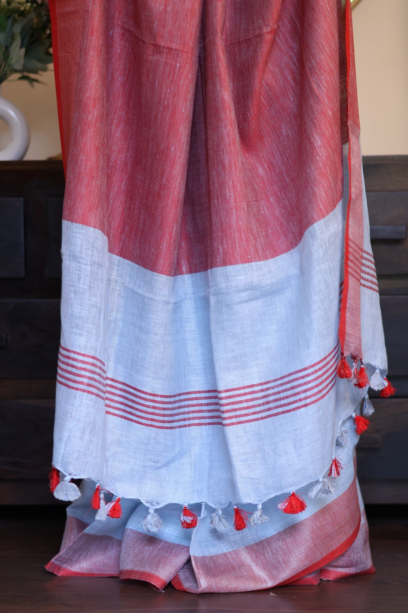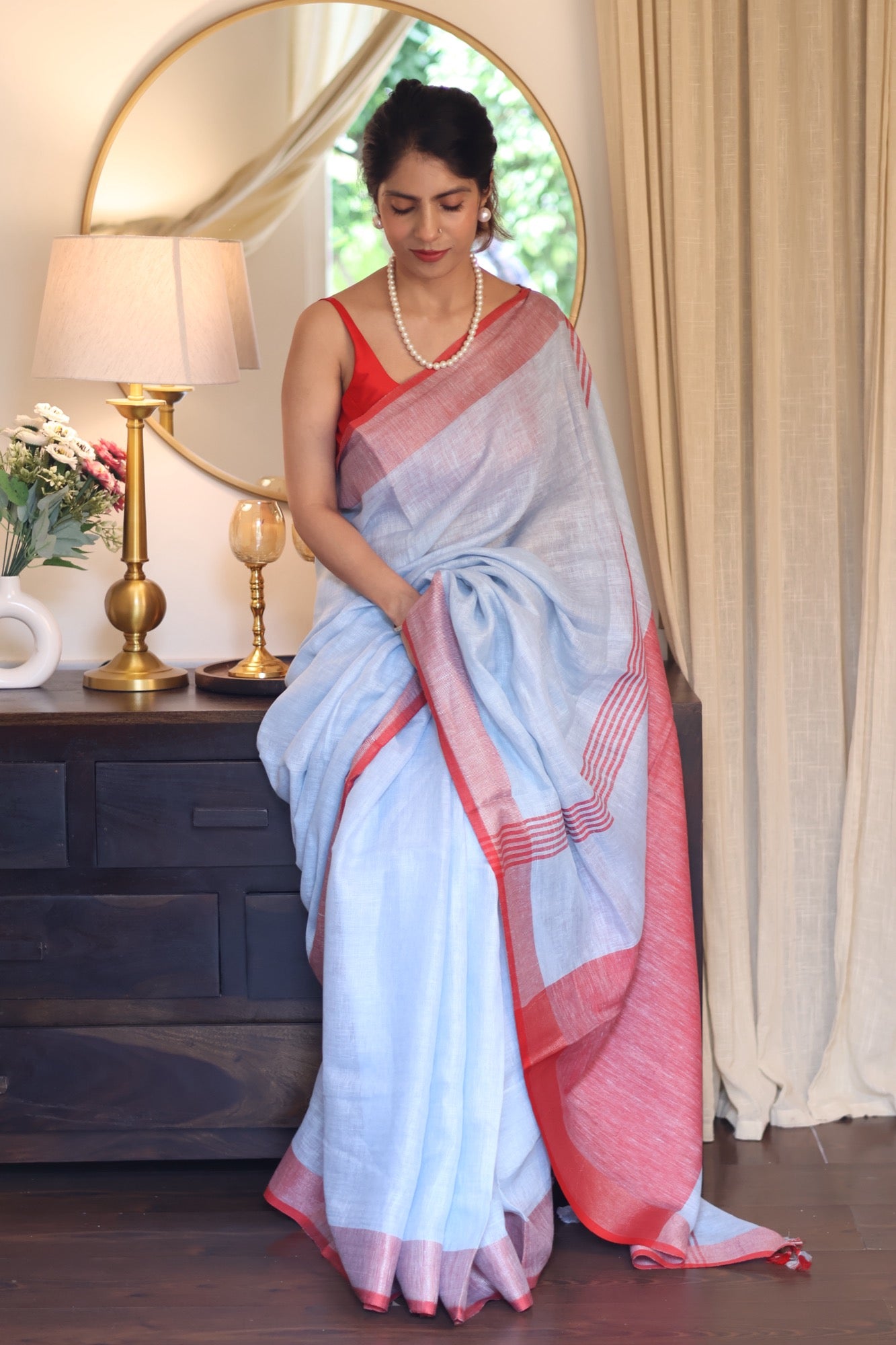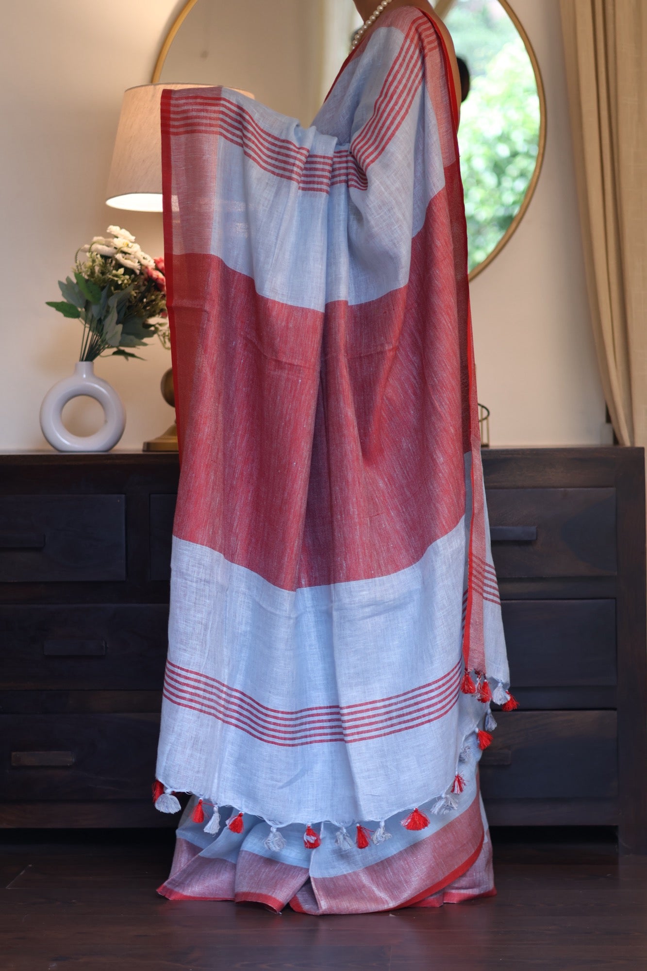 A delightful blend of icy elegance and festive warmth, Frosted Berry brings together a serene light blue base with rich red borders and stripes. Accentuated with playful dual-toned tassels, this pure linen saree feels like the freshness of winter mornings touched by the cheer of ripe berries. Lightweight and breathable, it’s your perfect companion for day events, brunches, and cheerful gatherings where subtle sophistication speaks louder than words.