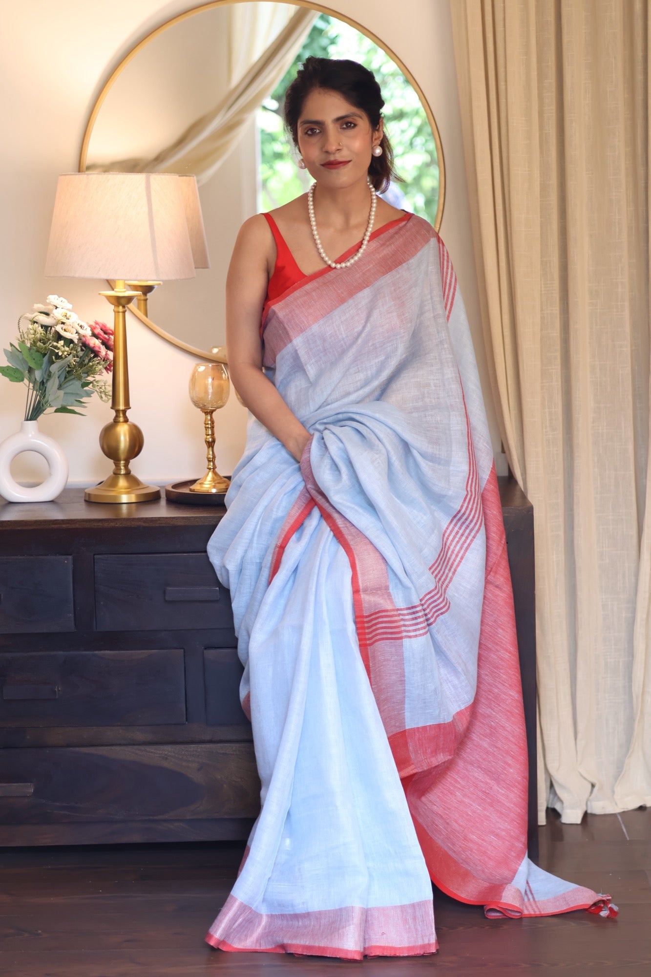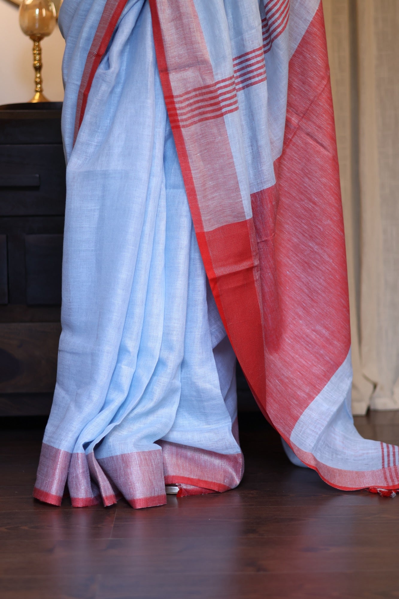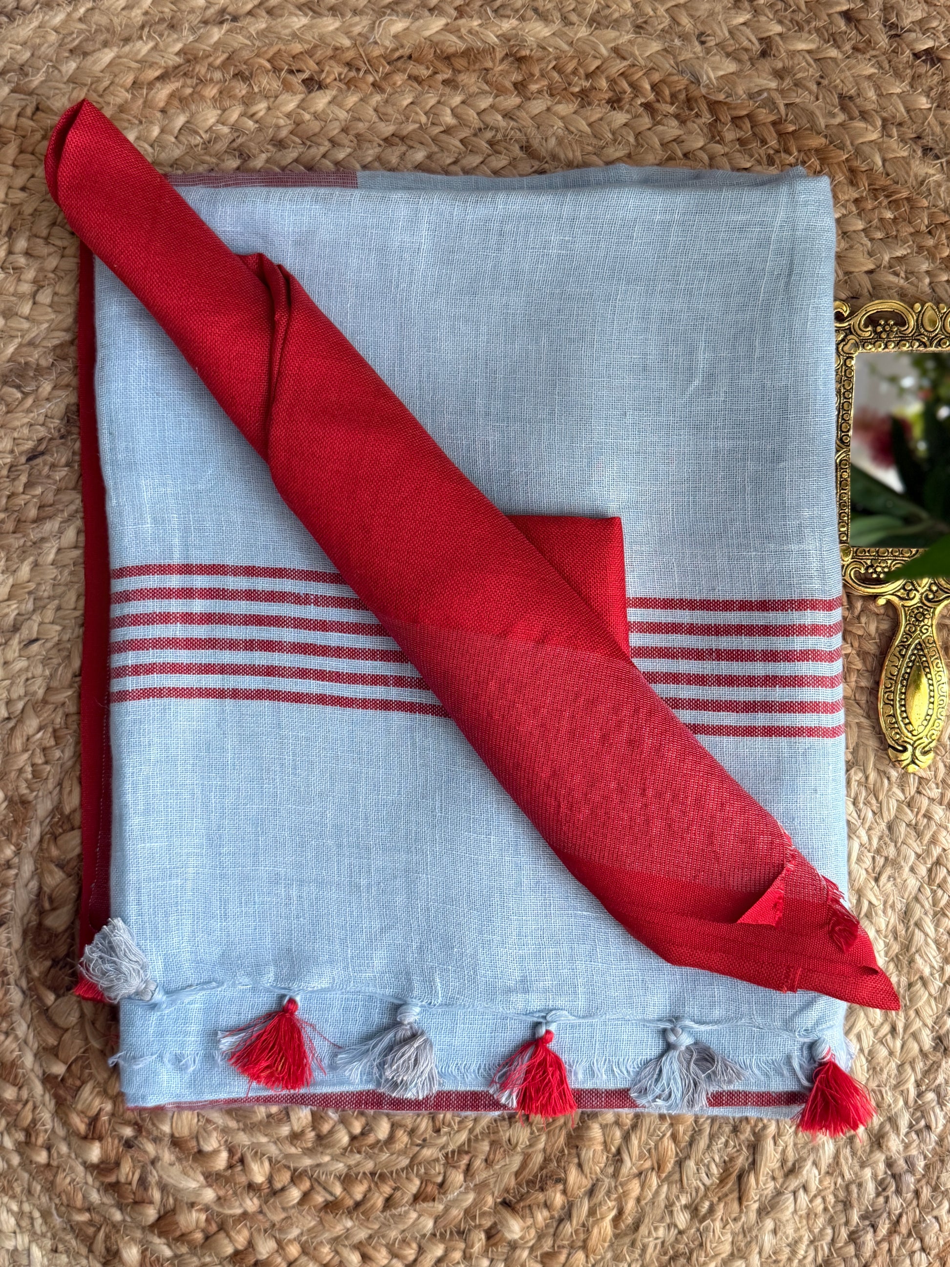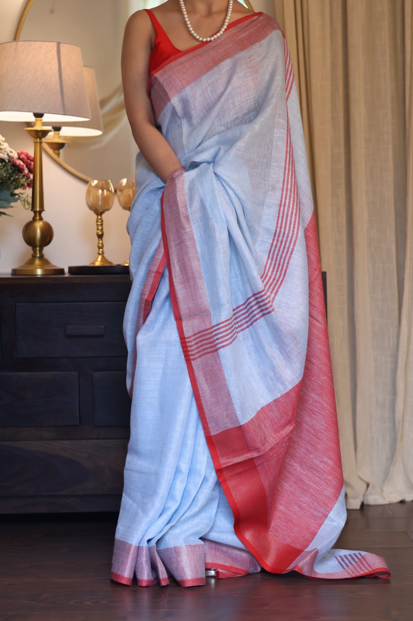 A delightful blend of icy elegance and festive warmth, Frosted Berry brings together a serene light blue base with rich red borders and stripes. Accentuated with playful dual-toned tassels, this pure linen saree feels like the freshness of winter mornings touched by the cheer of ripe berries. Lightweight and breathable, it’s your perfect companion for day events, brunches, and cheerful gatherings where subtle sophistication speaks louder than words.