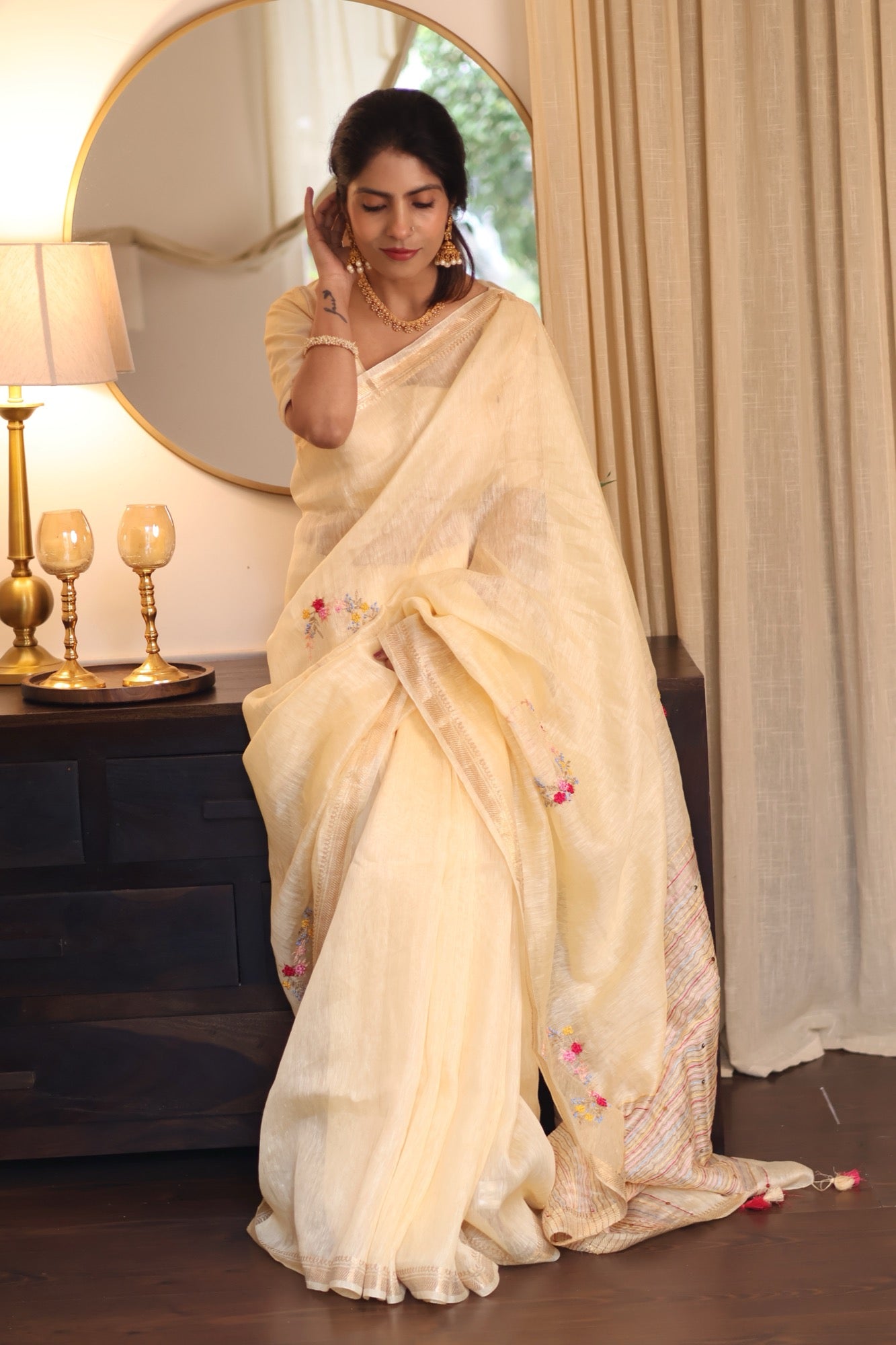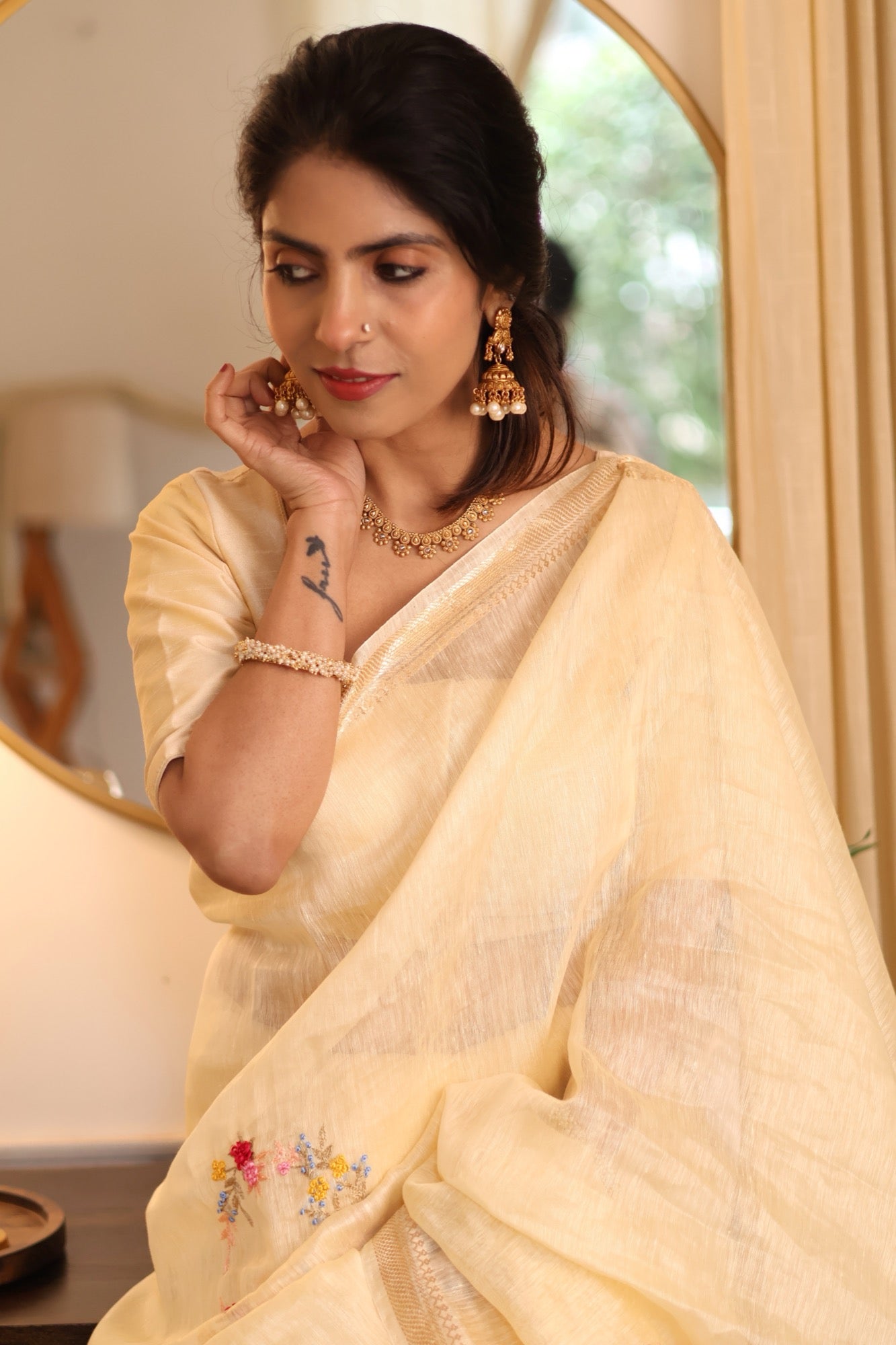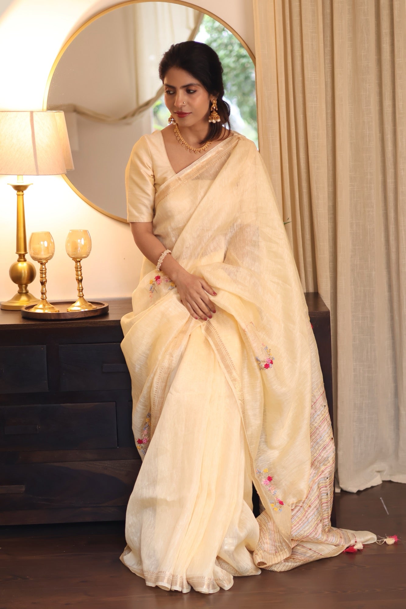 Phool is a pure silk linen saree in a warm ivory-gold tone, brought alive with delicate floral embroidery scattered like blooms across a summer morning. The hand-embroidered wreath motifs add a quiet romance, while the subtle striped pallu and playful tassels lend movement and ease.