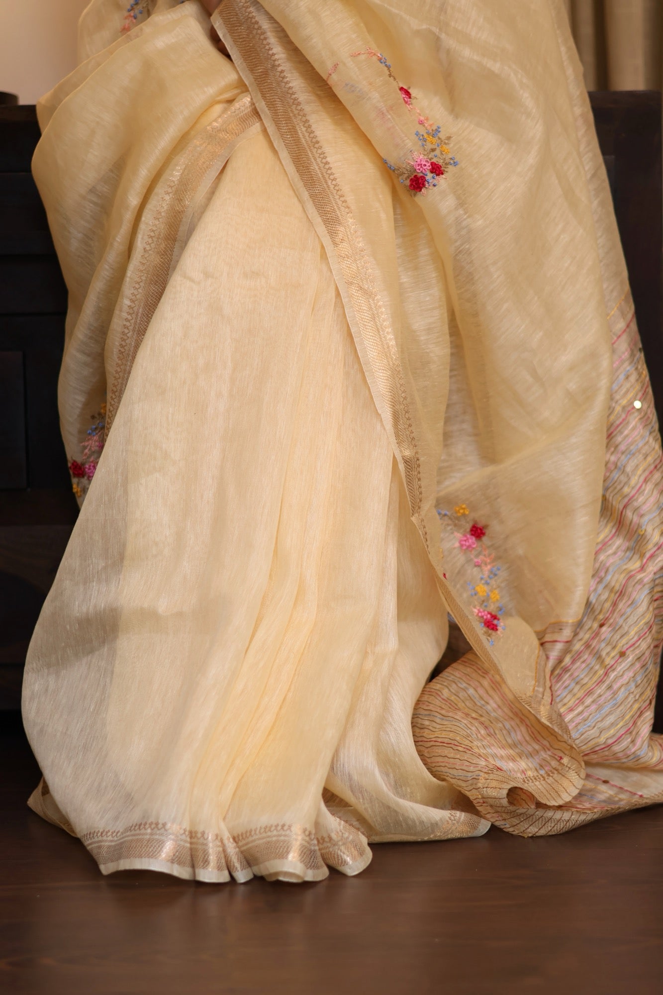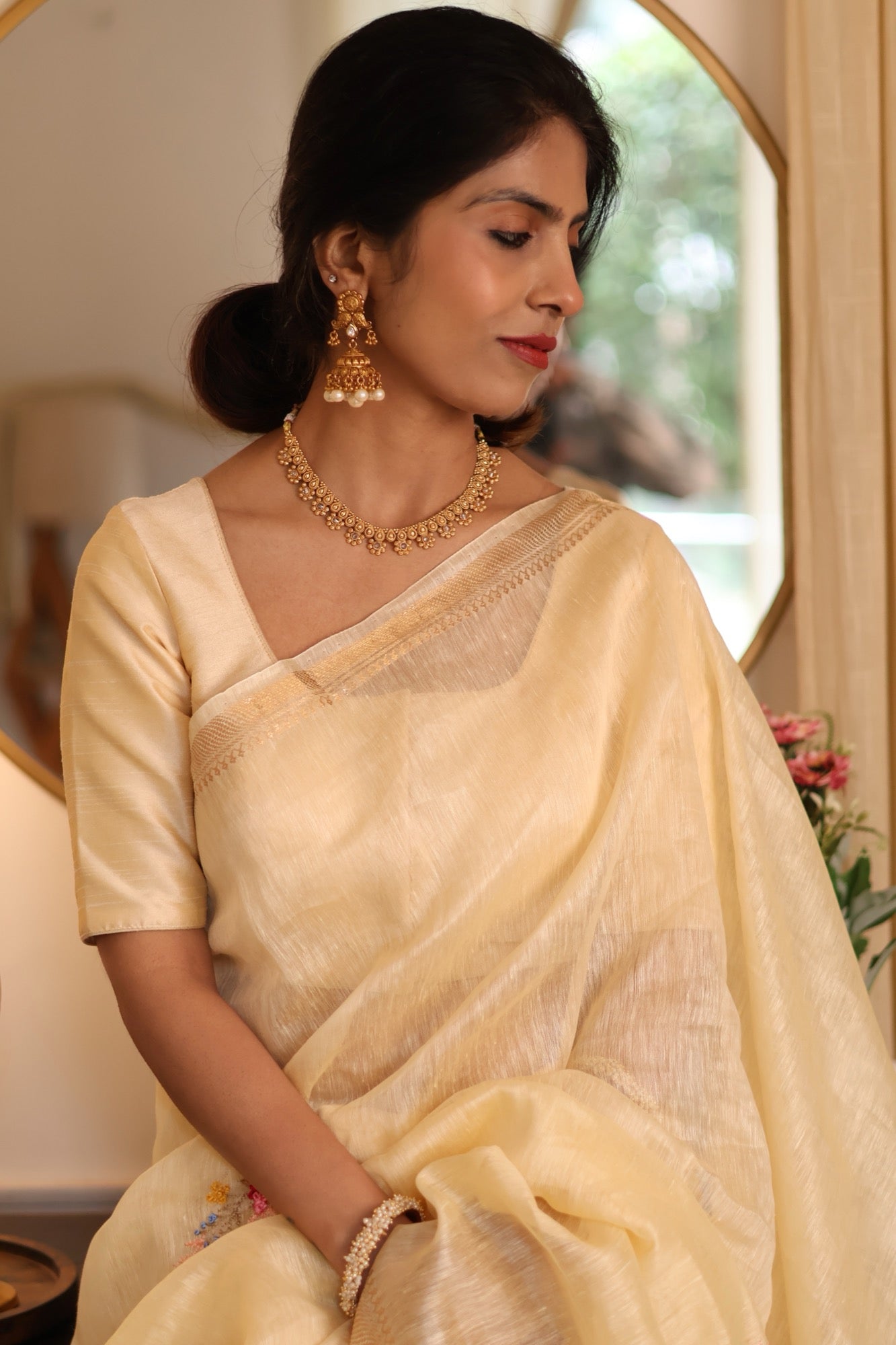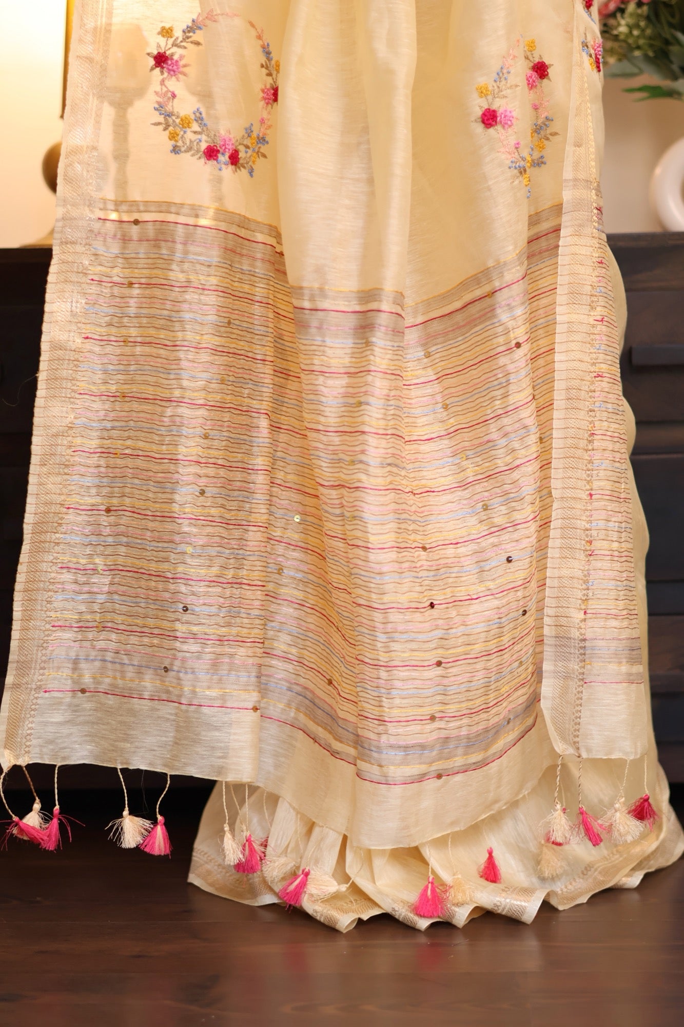 Phool is a pure silk linen saree in a warm ivory-gold tone, brought alive with delicate floral embroidery scattered like blooms across a summer morning. The hand-embroidered wreath motifs add a quiet romance, while the subtle striped pallu and playful tassels lend movement and ease.