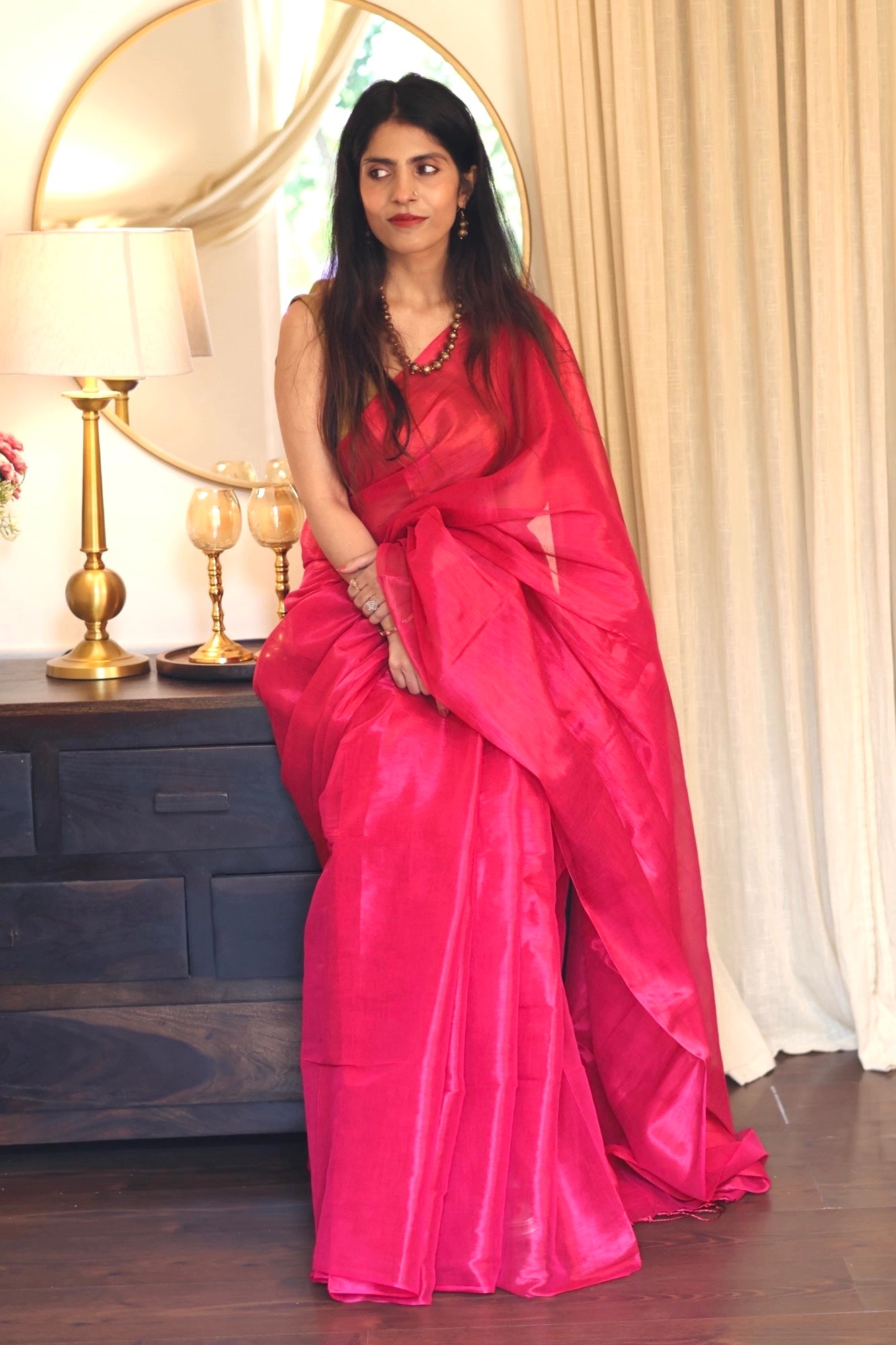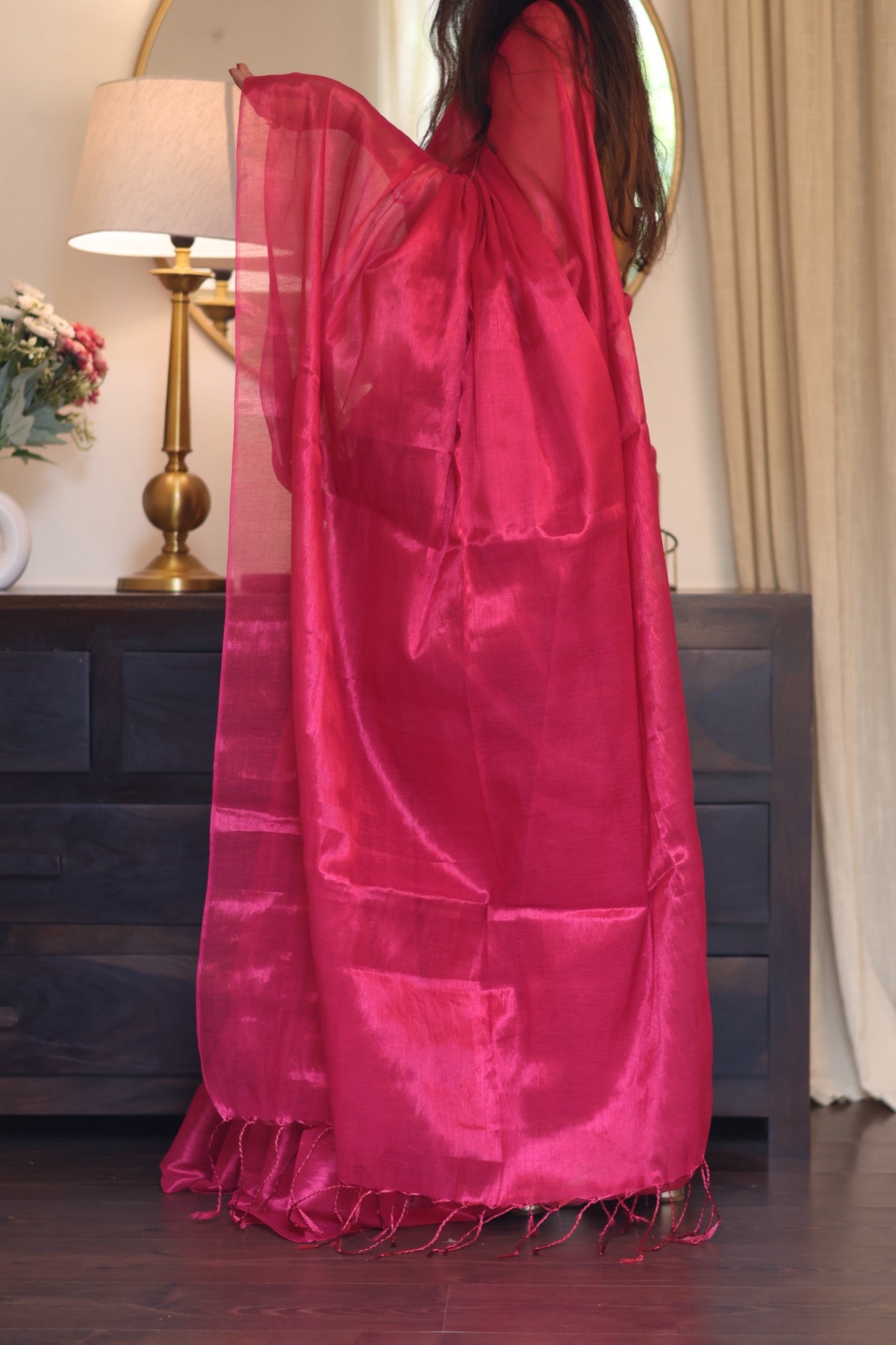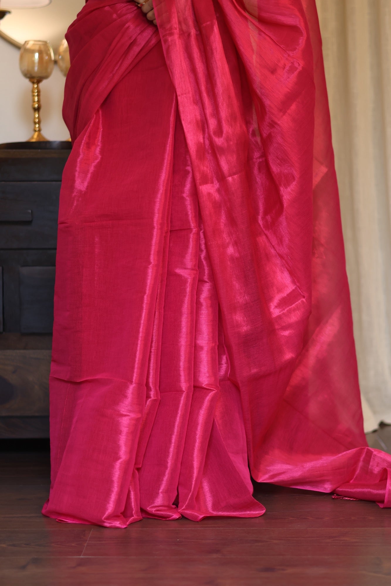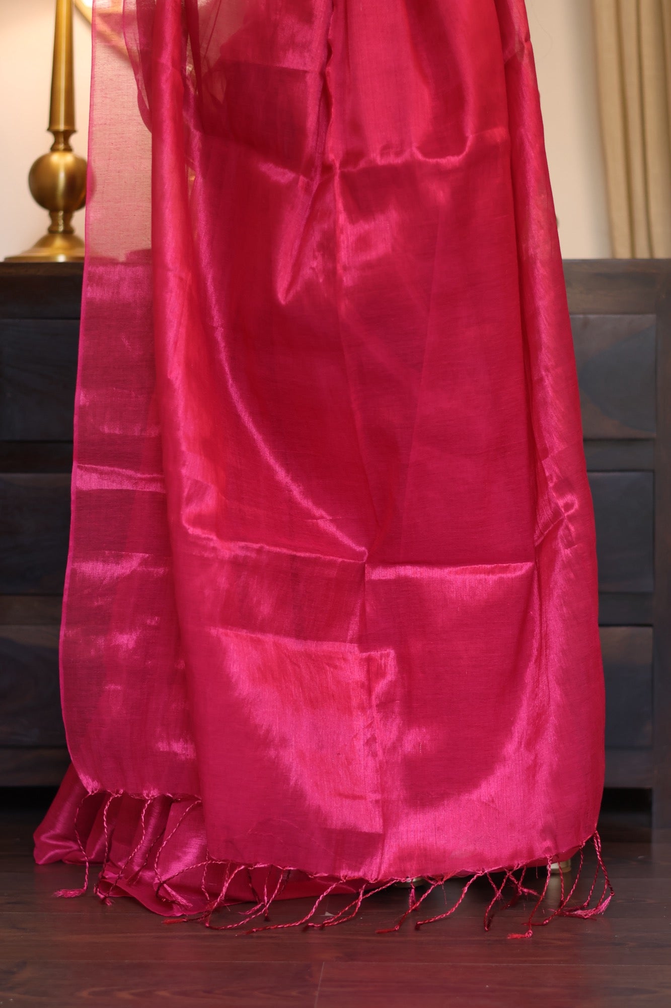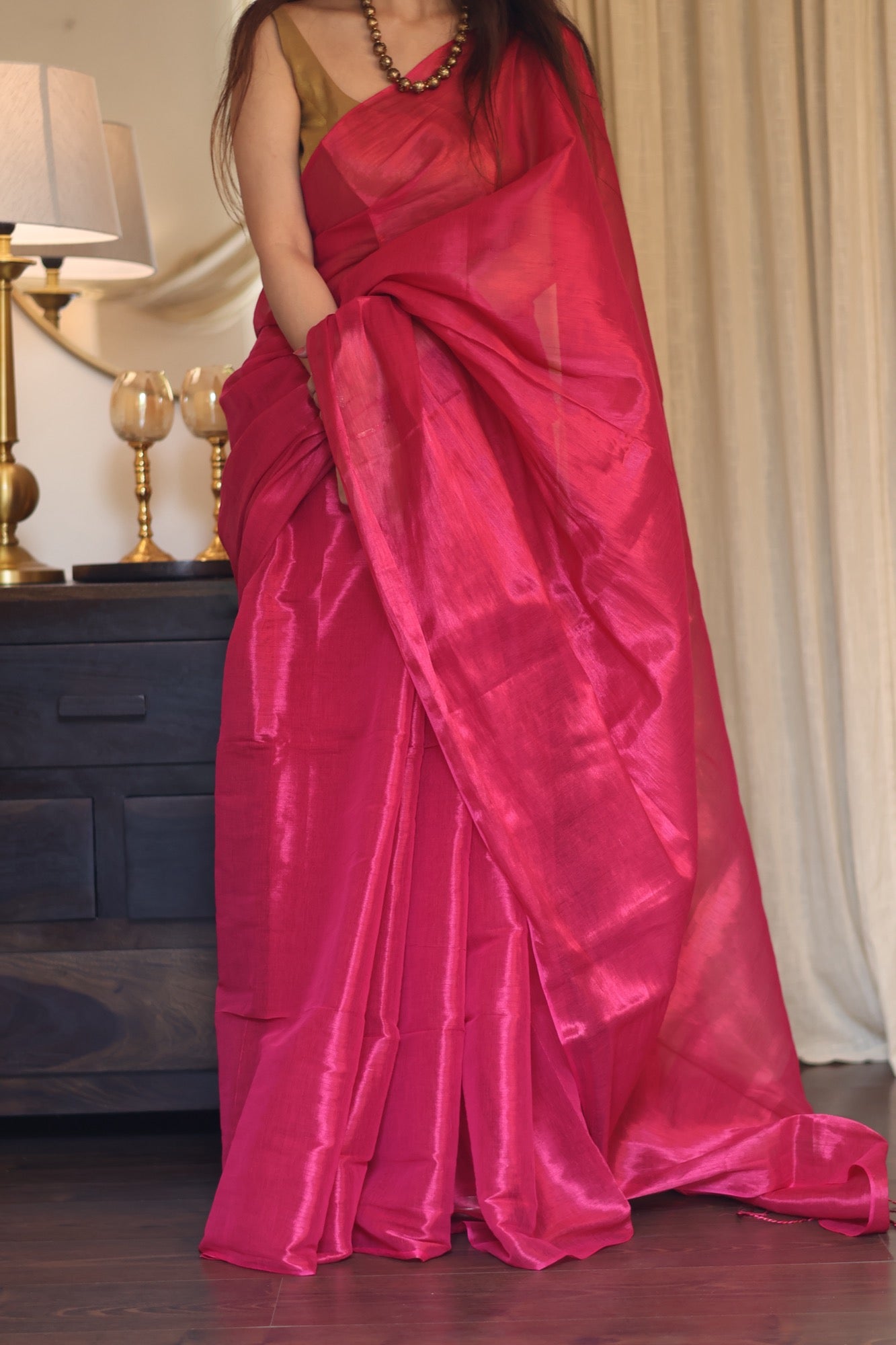 Bright, bold, and full of heart Gulaabo is a pure linen tissue saree that glows in shades of deep fuchsia. Its soft metallic sheen adds just the right touch of festivity, making it perfect for special gatherings or evenings that call for colour and confidence. A saree that turns every glance into a compliment.