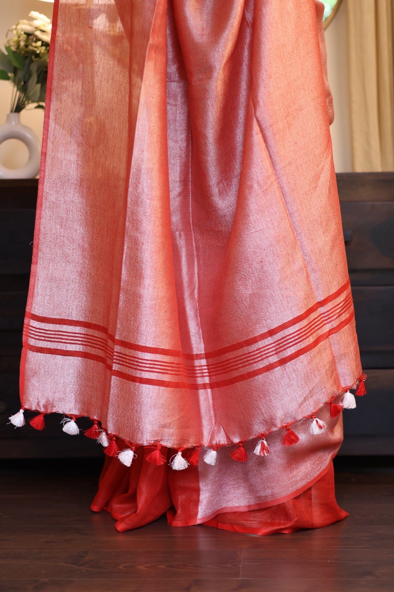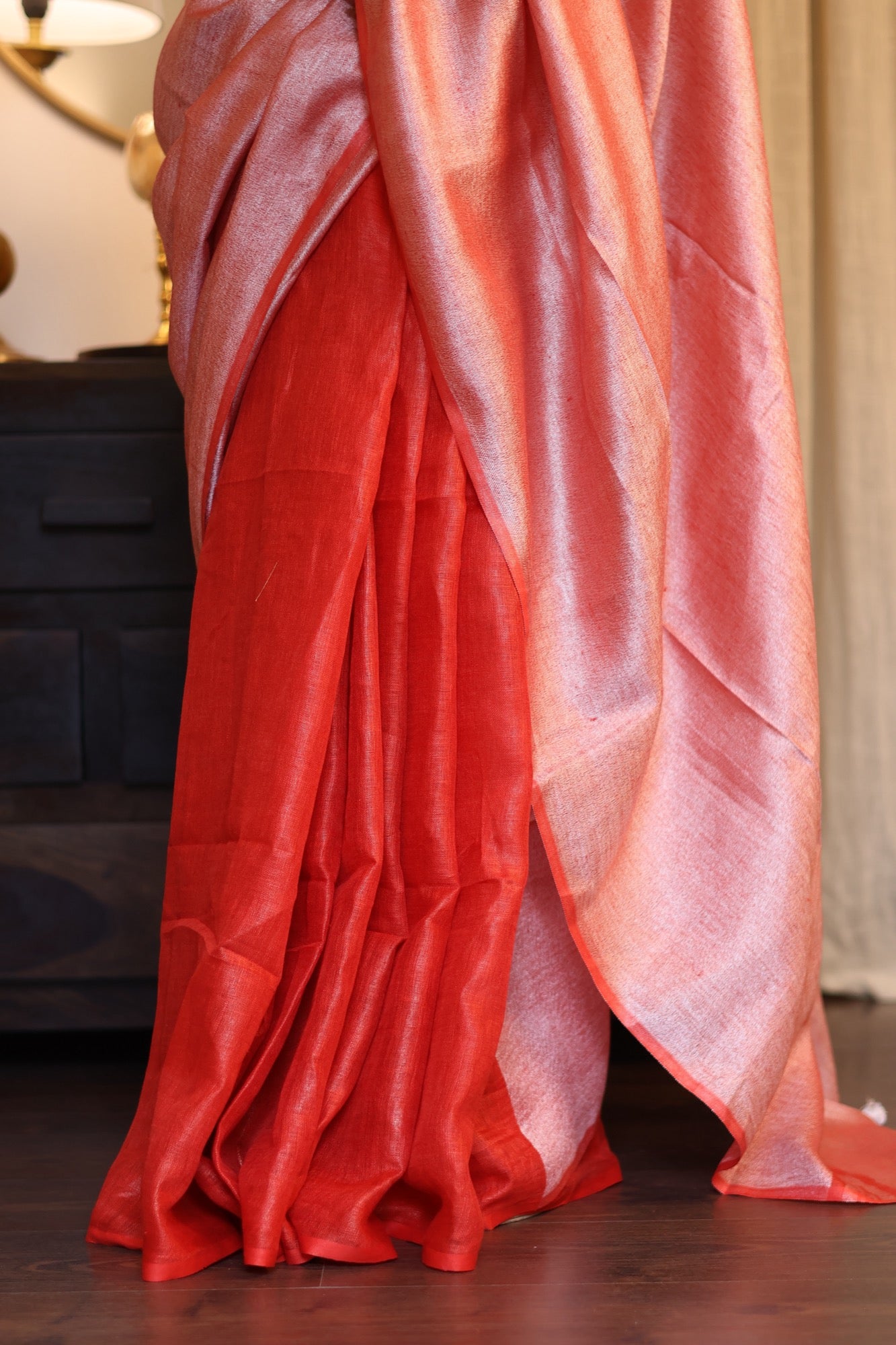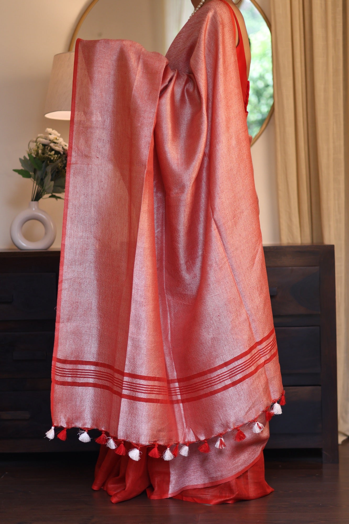 Bold yet graceful Gulnaar glows in pure linen with a half-zari weave that catches light in the most delicate way. The coral-red tone brings warmth and radiance, making it perfect for festive evenings or intimate celebrations. Easy to drape, fluid to move in, and designed to stand out without shouting.