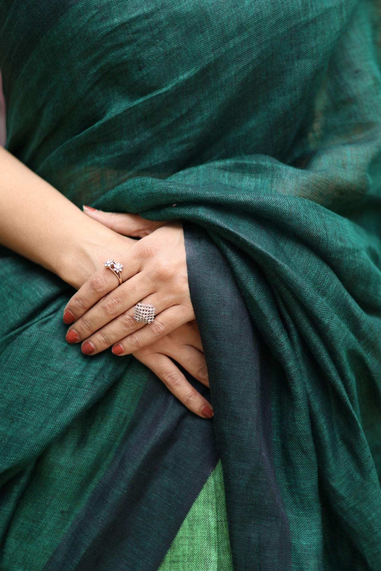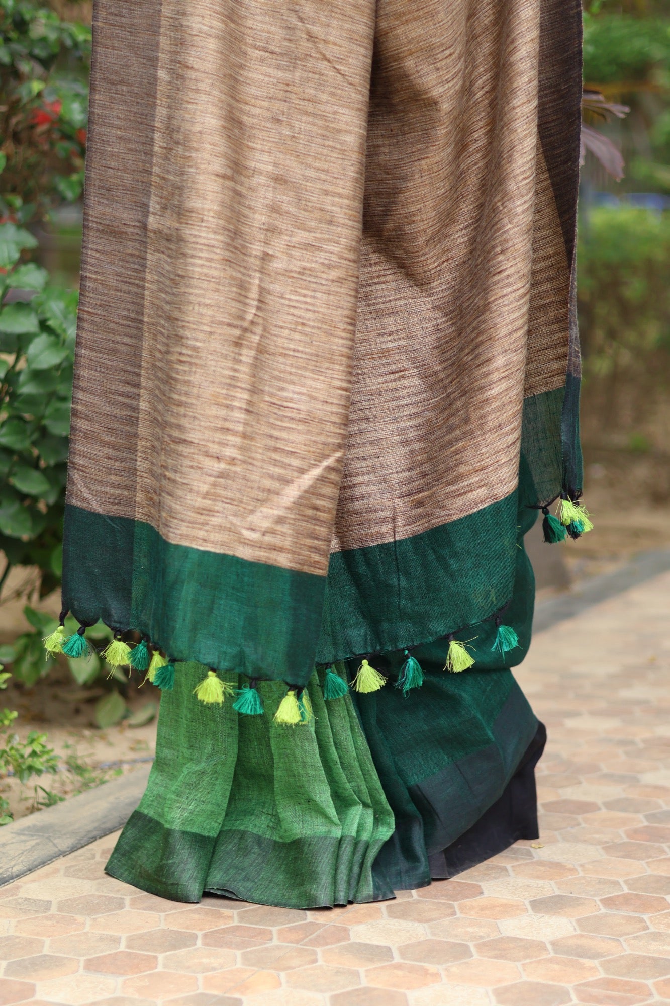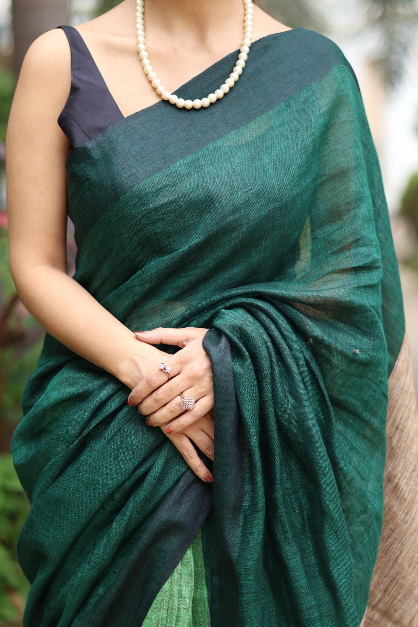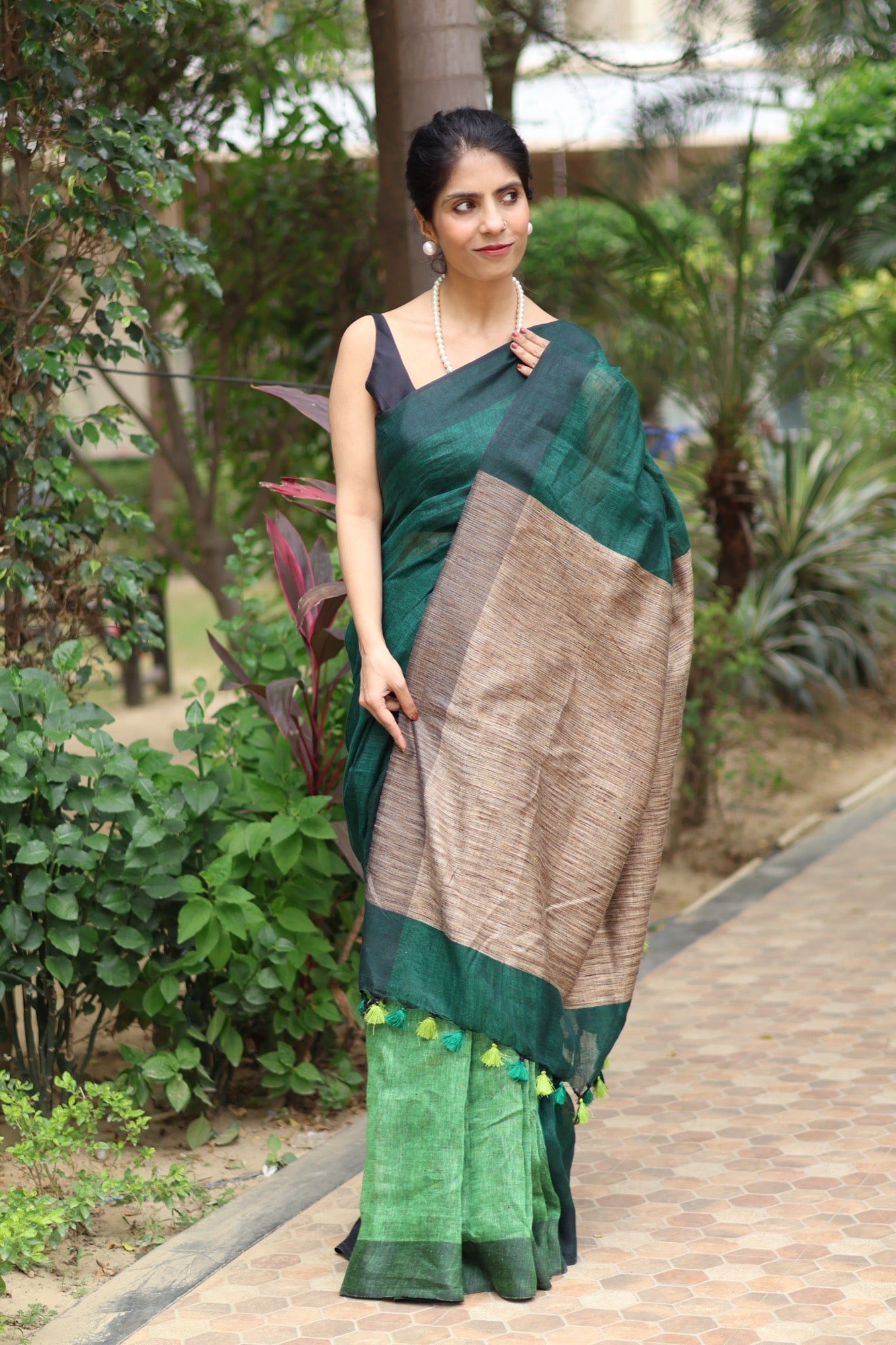 A deep forest green that whispers of monsoon leaves and quiet earth, Hareel is a graceful blend of tradition and subtle boldness. The saree features a stunning dull gold pallu that adds an elegant contrast, while dual-toned green and lime tassels add a fun twist at the edges. It’s understated yet striking—perfect for making a statement at work or adding a refined charm to your everyday.