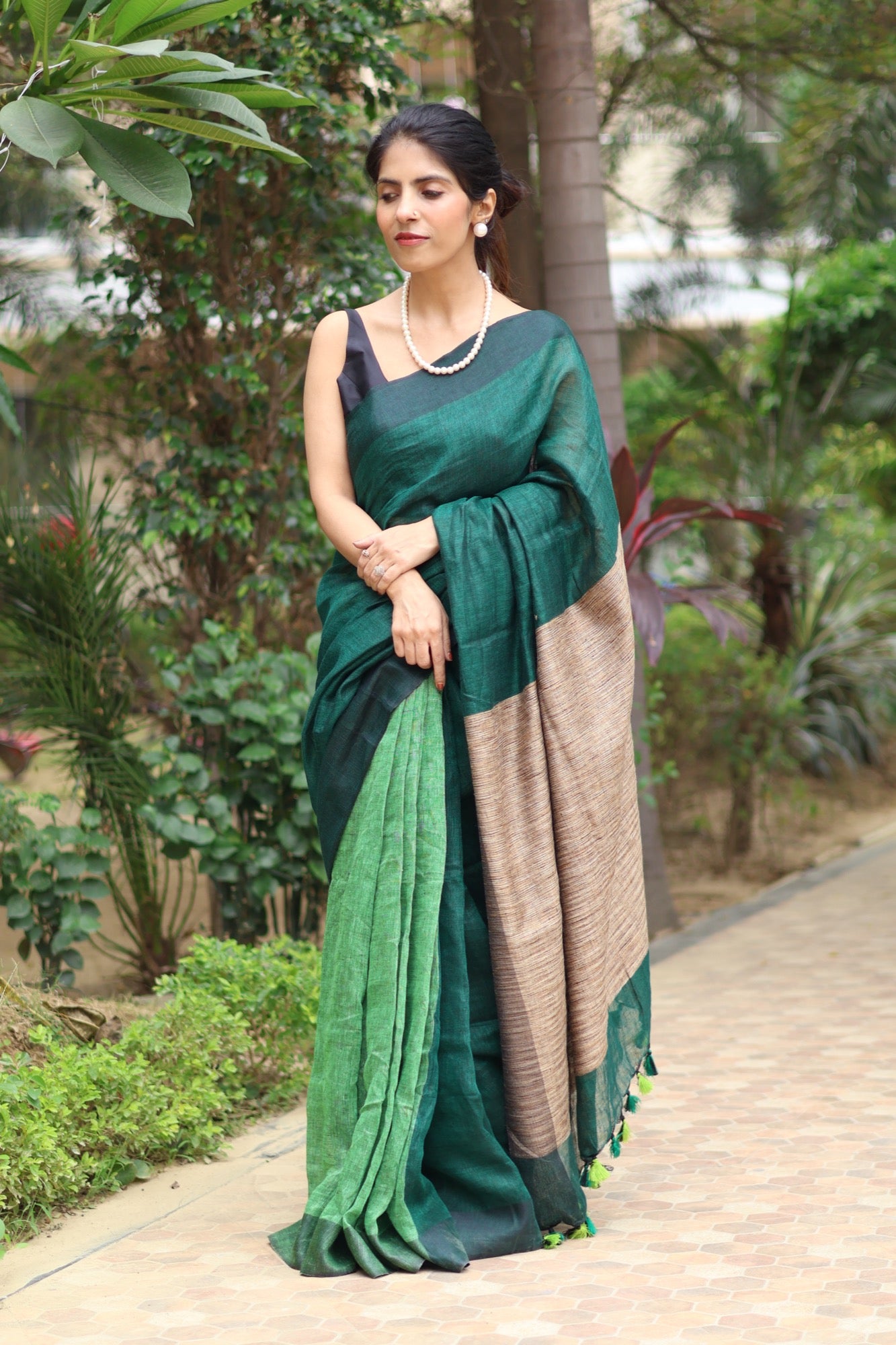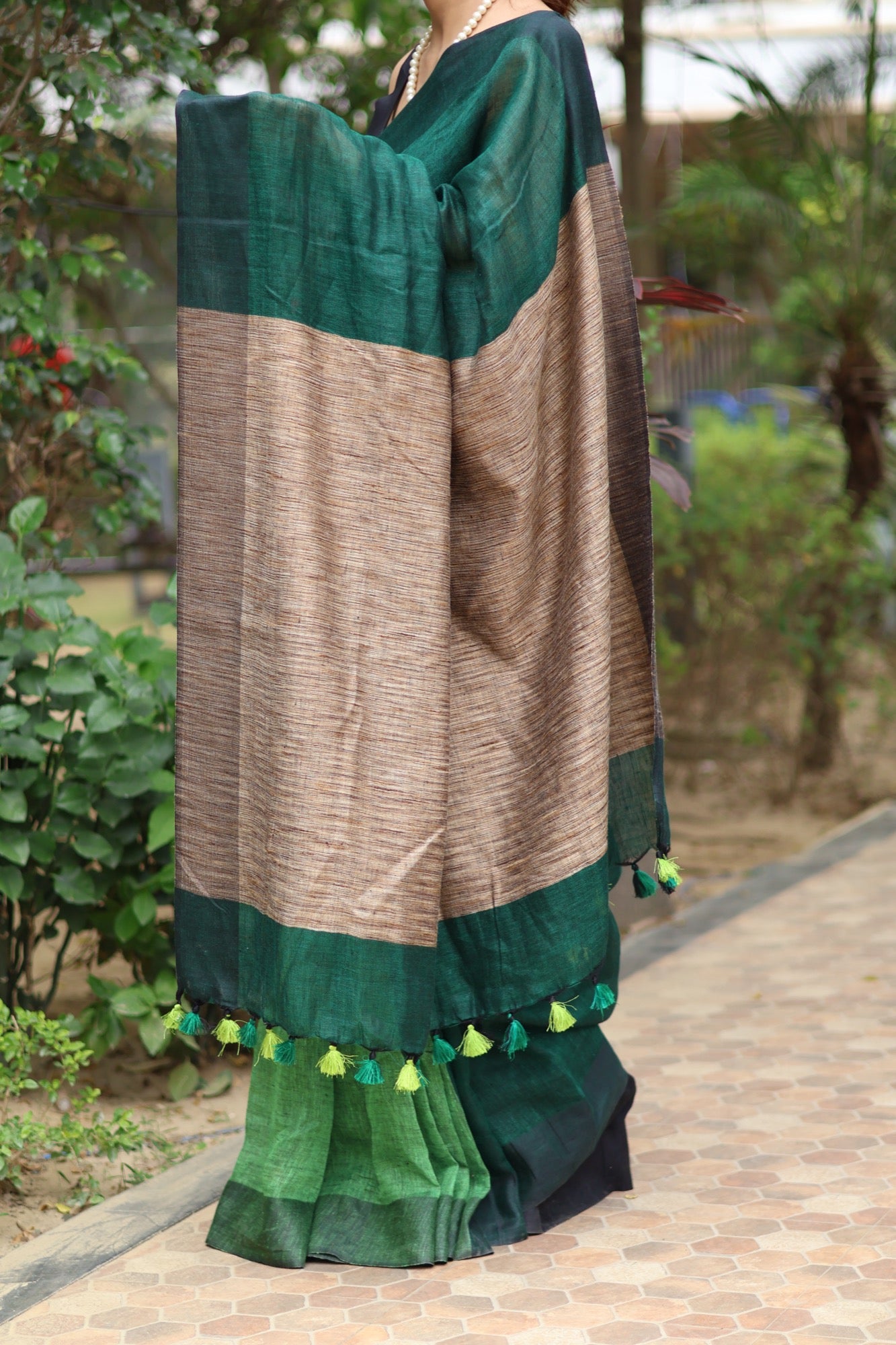 Colour: Deep green with dull gold pallu and dual-tone tassels