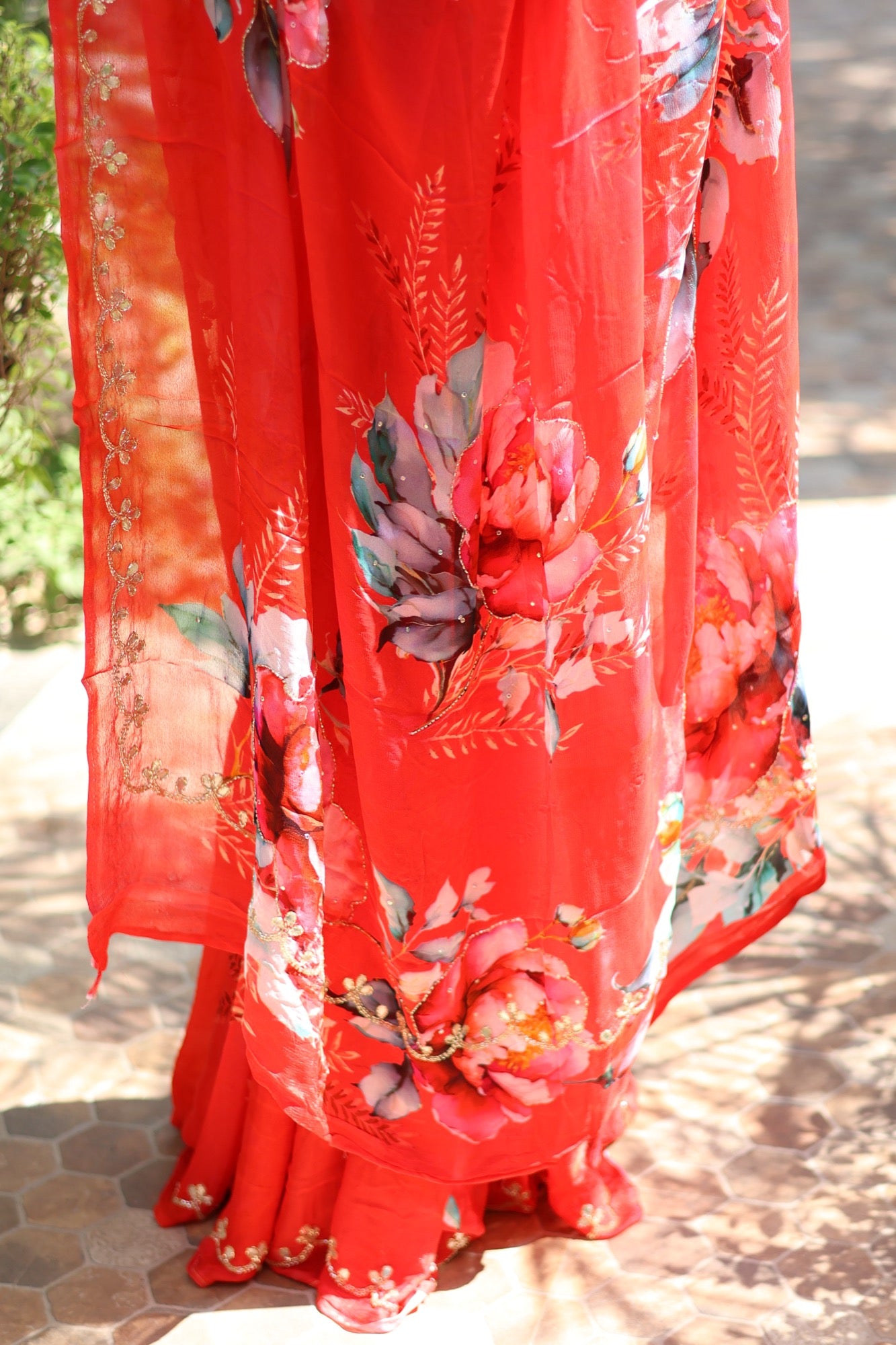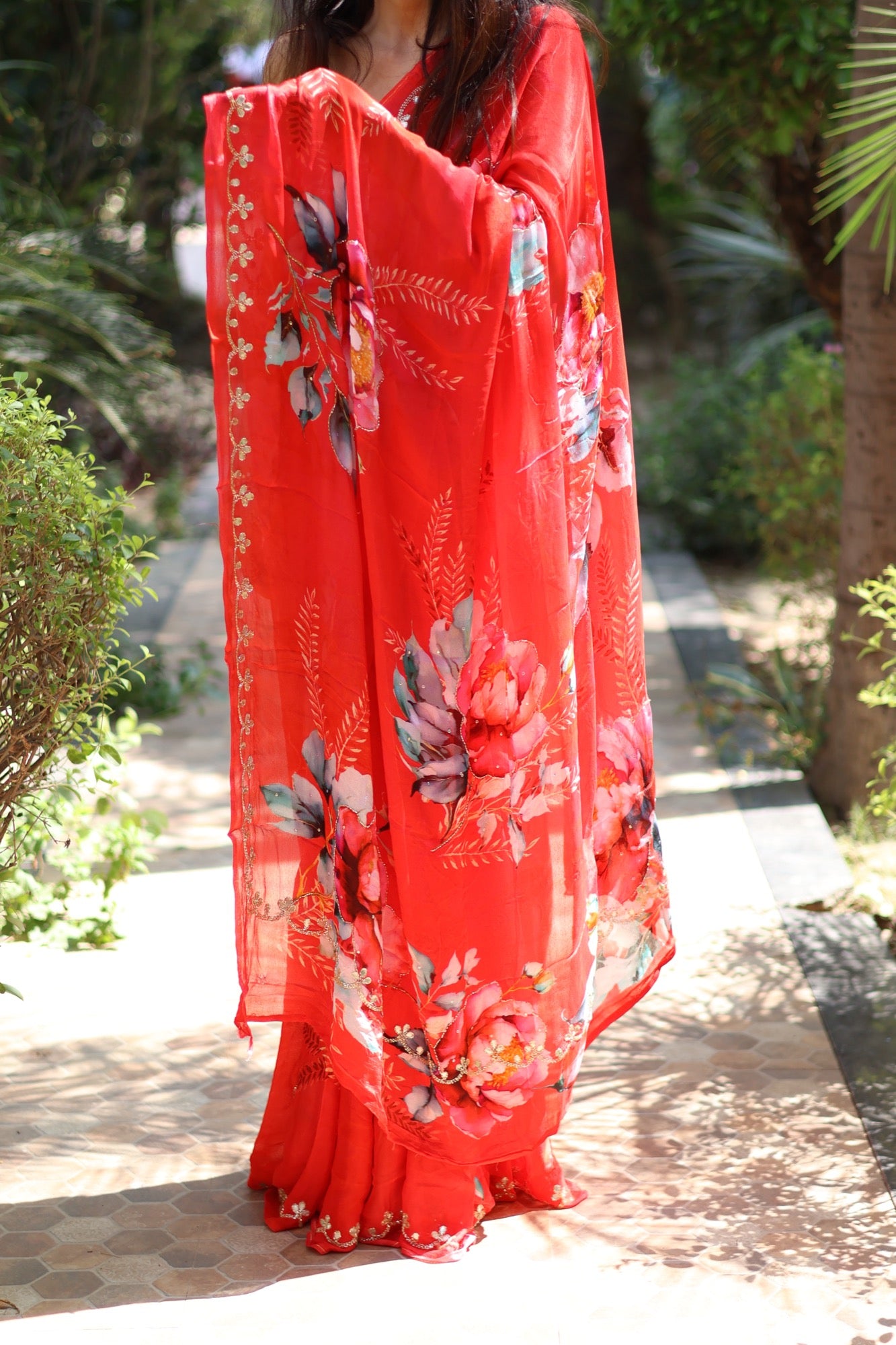 Playful, warm, and full of heart Inaya is that burst of sunshine after a long day. The pure Chinon silk drape flows effortlessly, with floral prints and intricate gotapatti and cutdana detailing that add just the right touch of shimmer. She’s the woman who walks into a room and makes it feel brighter without even trying.