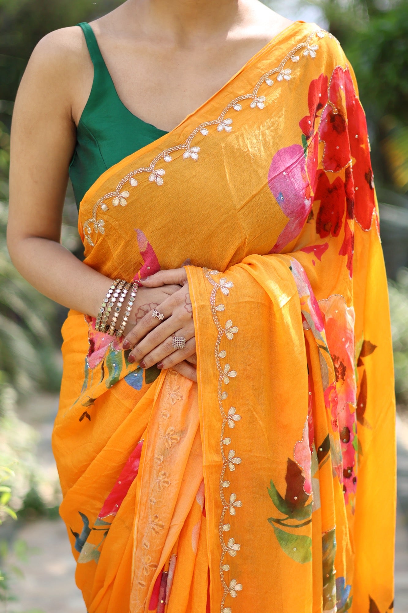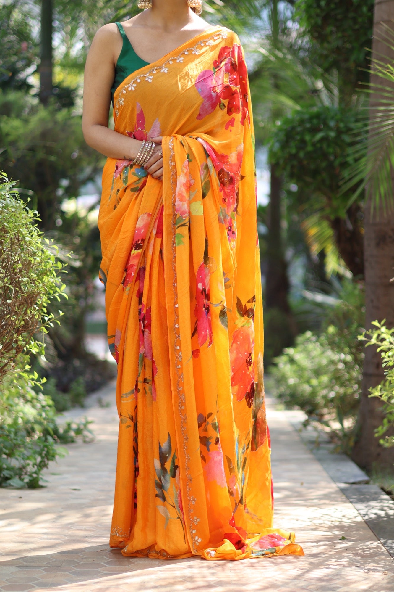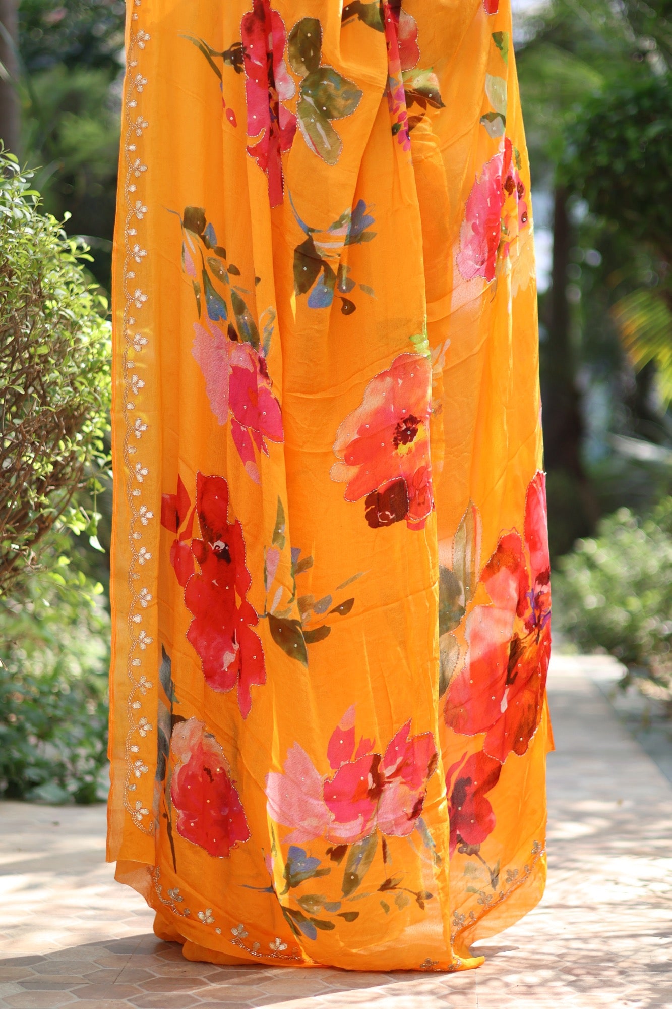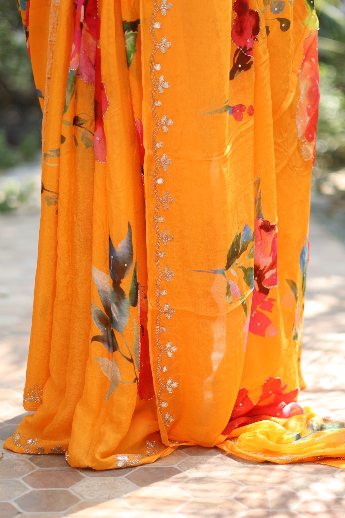 Golden like dawn and bright like laughter Ira is that woman who lights up every space she walks into. The pure Chinon silk drape blooms with vivid florals and fine hand embroidery in gotapatti and cutdana, making it both festive and fluid. Whether it’s a mehendi morning or a brunch under the sun, Tara was made to be seen, felt, and remembered.