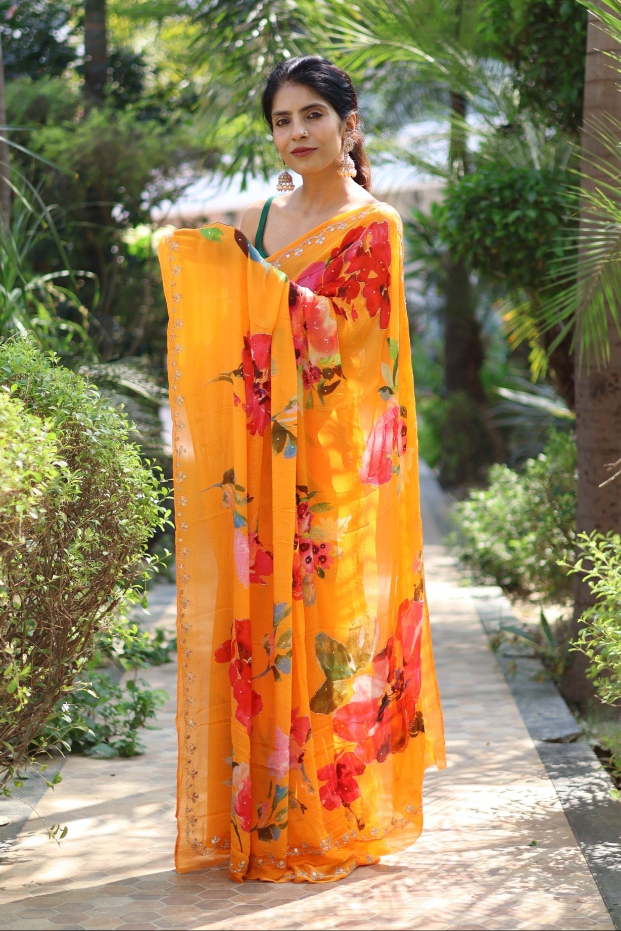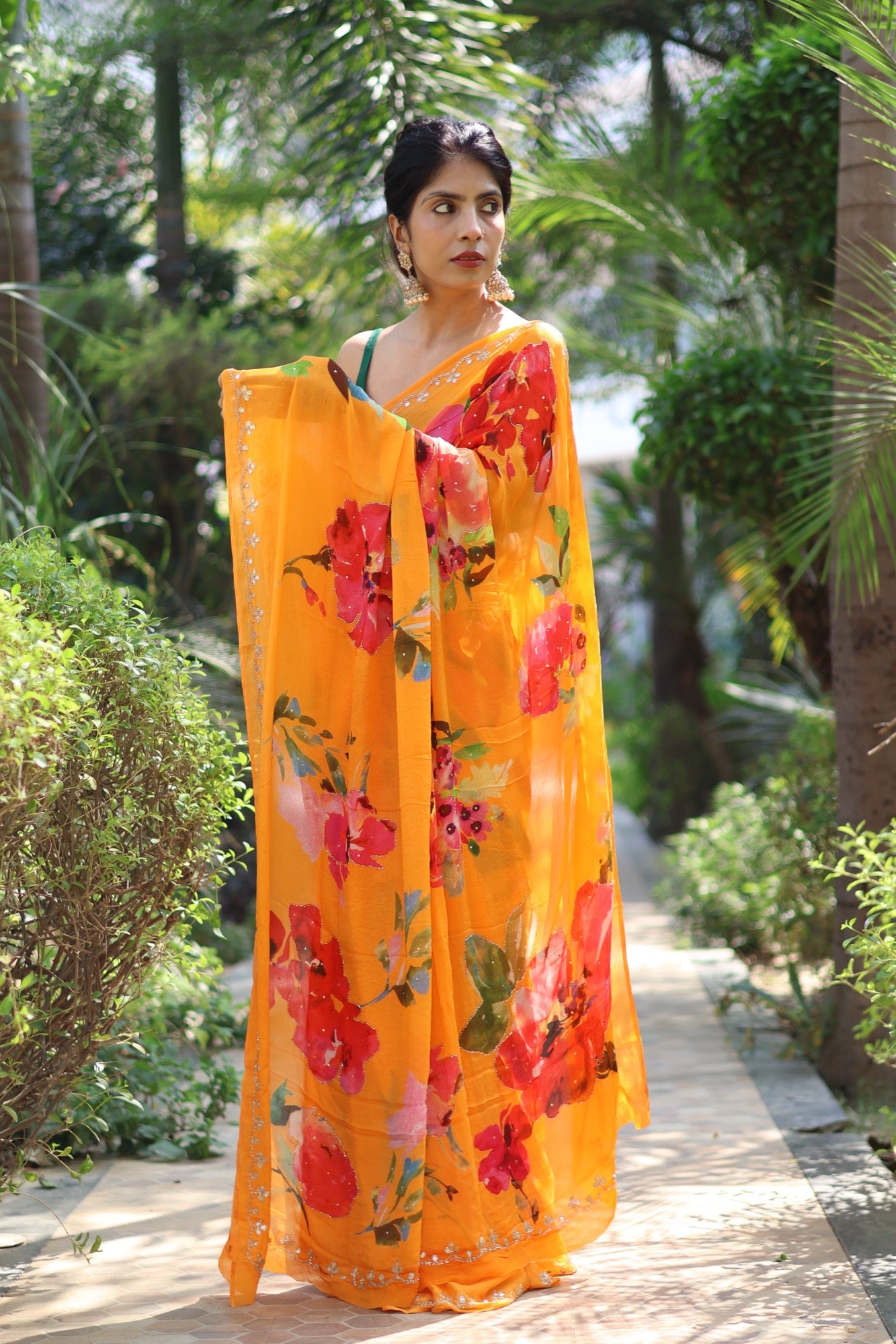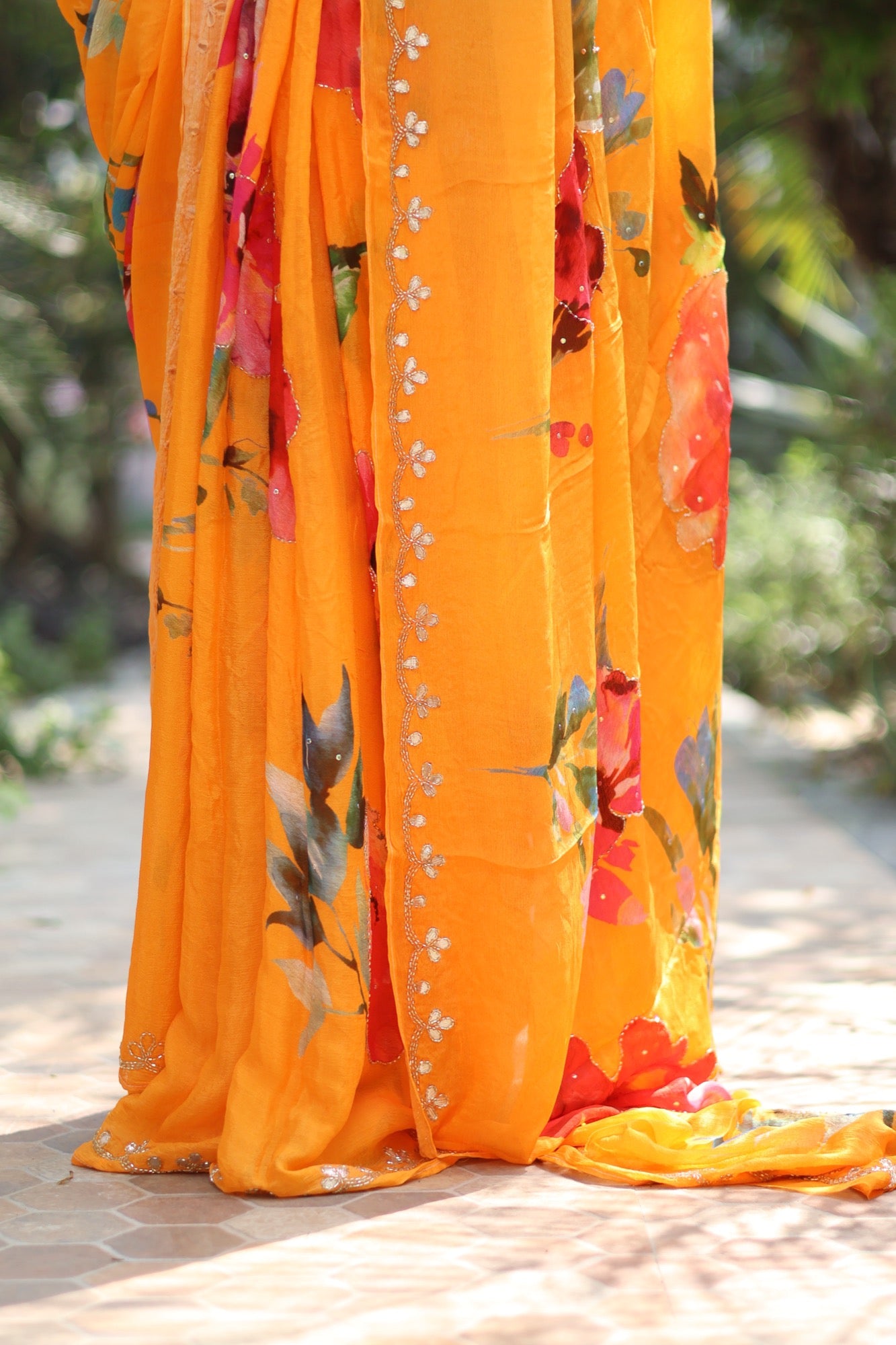 Golden like dawn and bright like laughter Ira is that woman who lights up every space she walks into. The pure Chinon silk drape blooms with vivid florals and fine hand embroidery in gotapatti and cutdana, making it both festive and fluid. Whether it’s a mehendi morning or a brunch under the sun, Tara was made to be seen, felt, and remembered.
