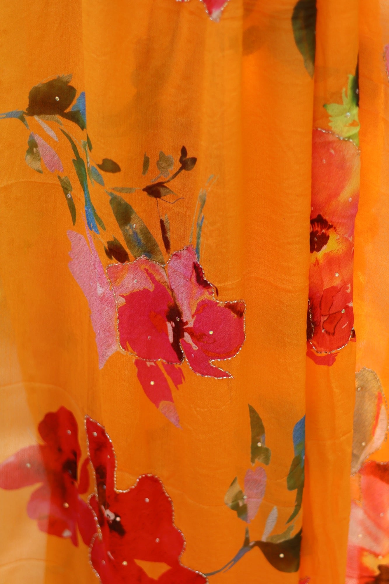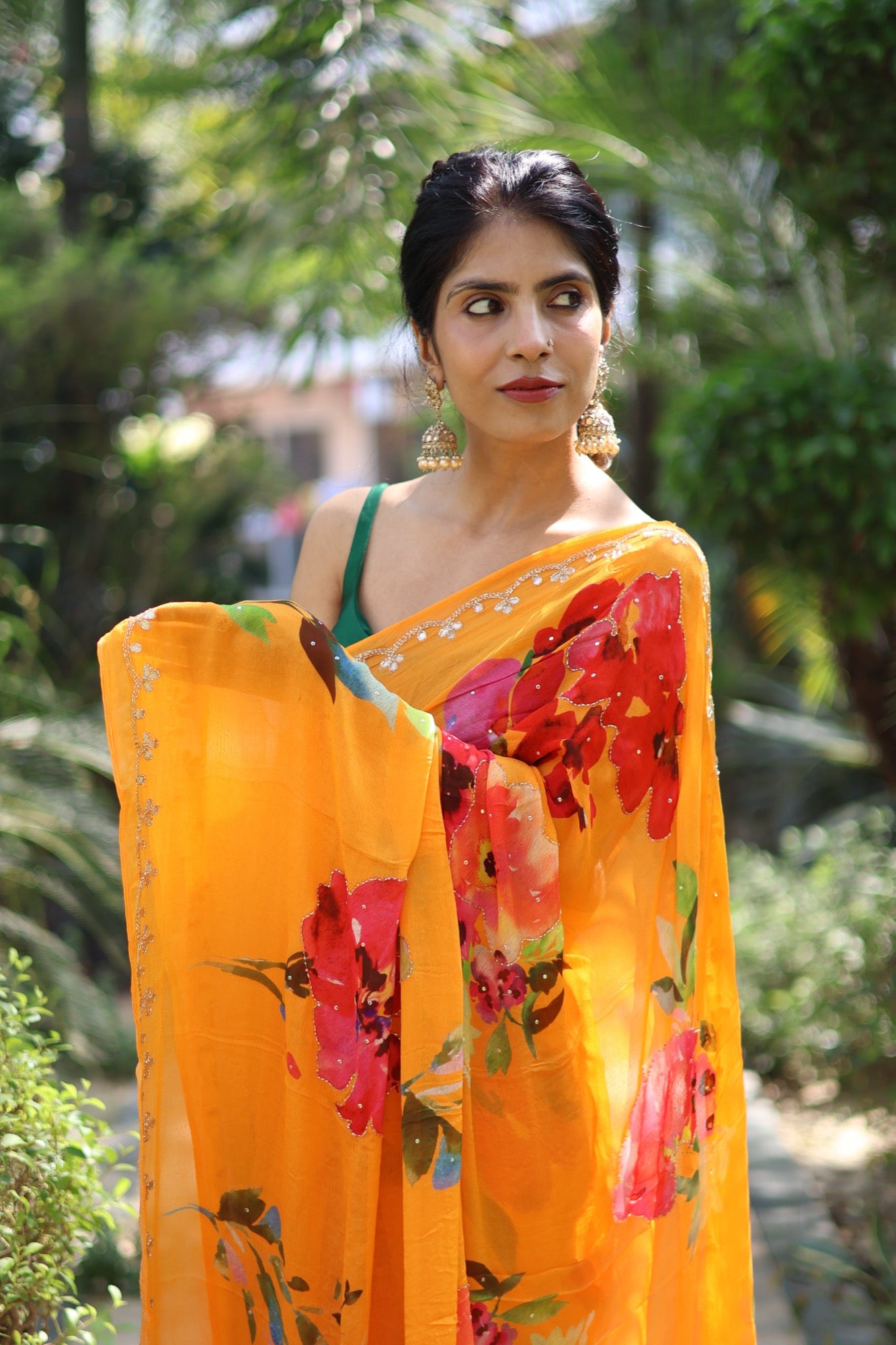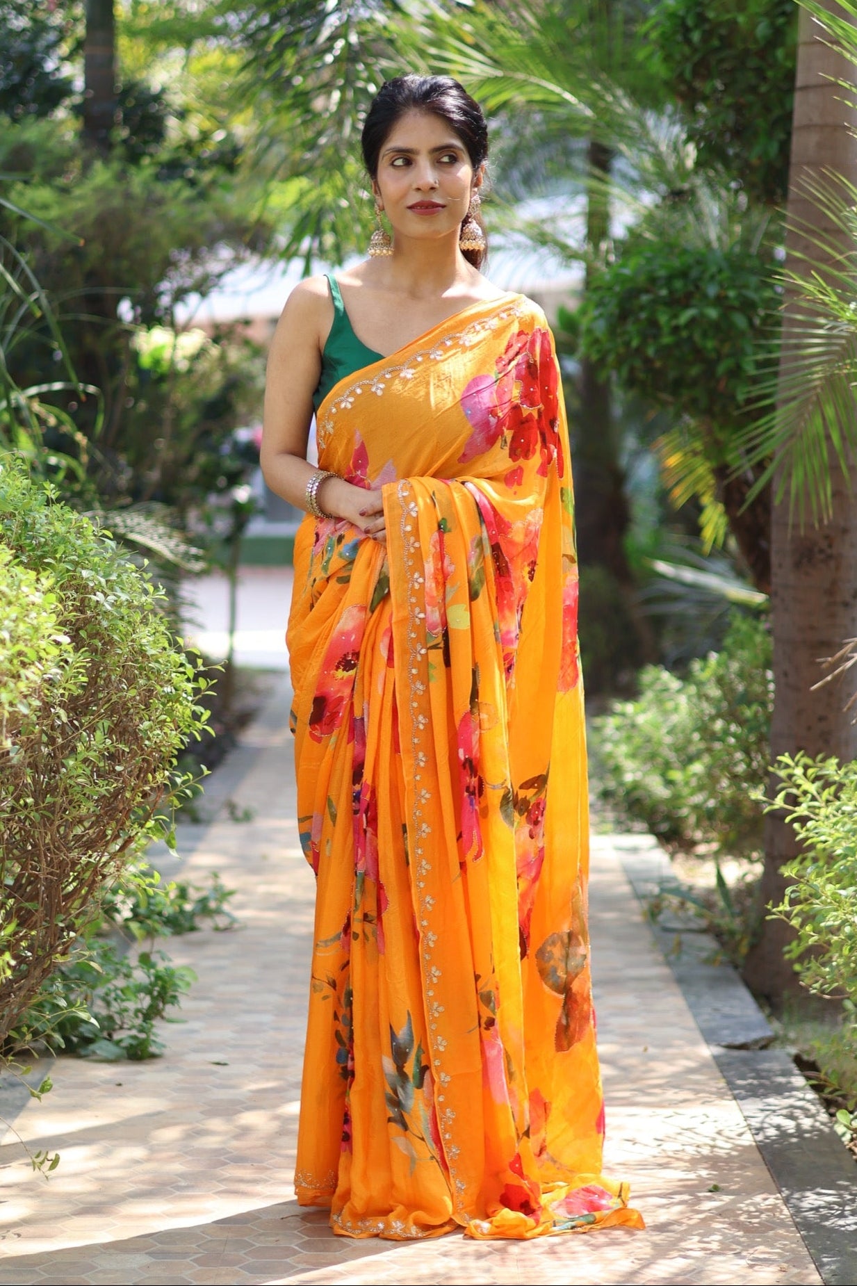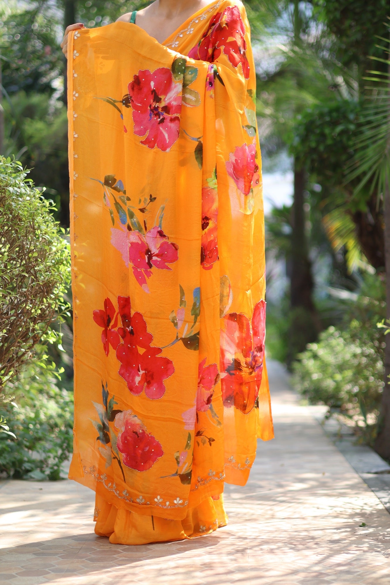 Golden like dawn and bright like laughter Ira is that woman who lights up every space she walks into. The pure Chinon silk drape blooms with vivid florals and fine hand embroidery in gotapatti and cutdana, making it both festive and fluid. Whether it’s a mehendi morning or a brunch under the sun, Tara was made to be seen, felt, and remembered.