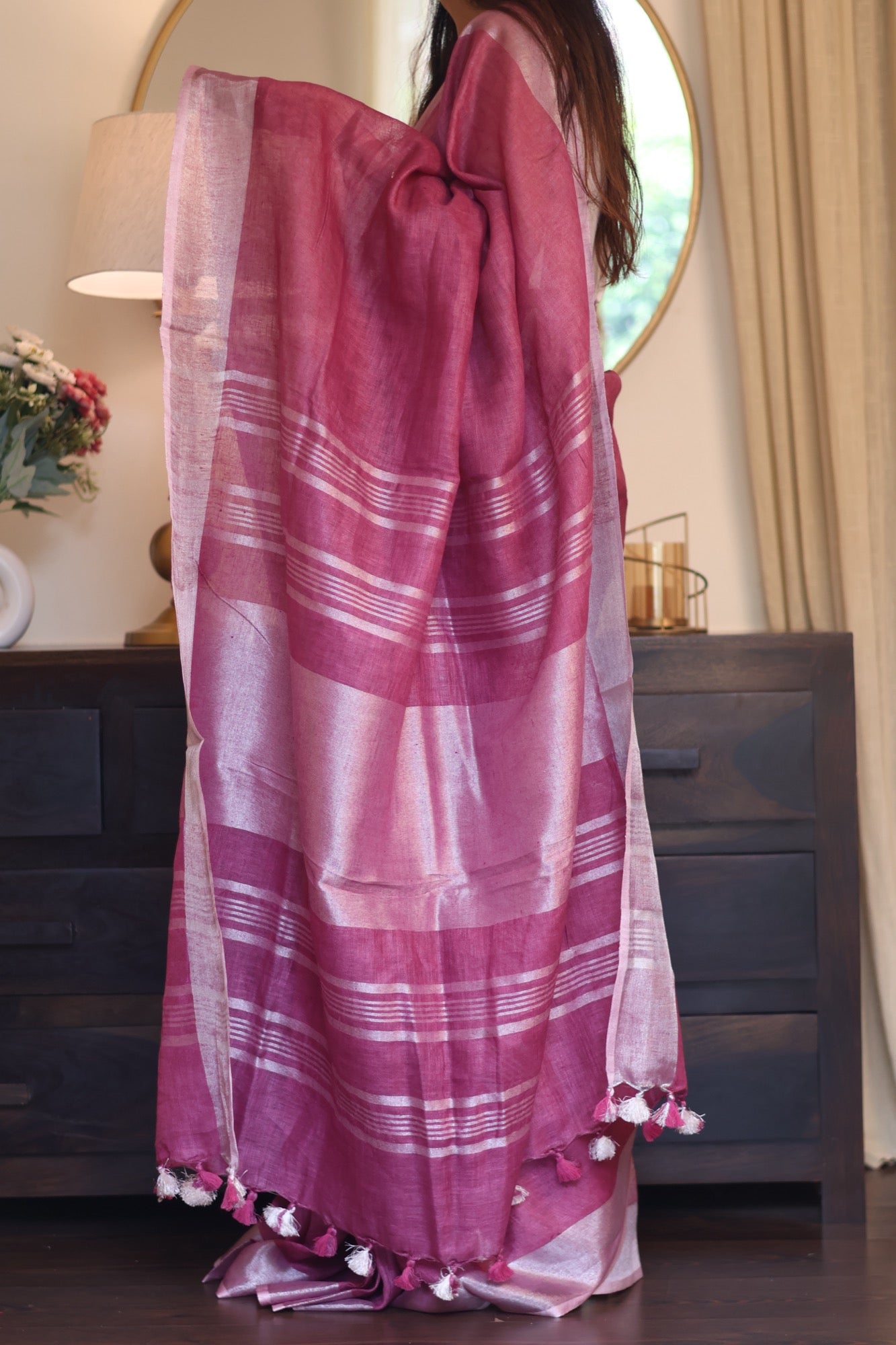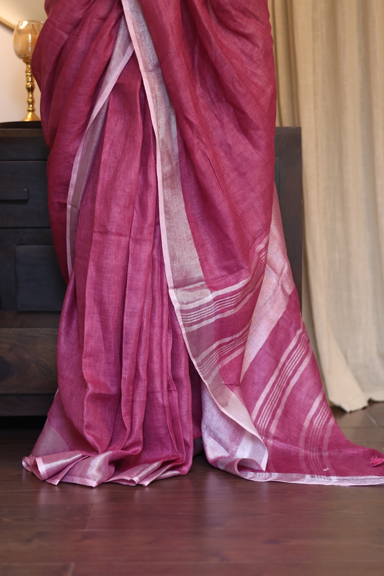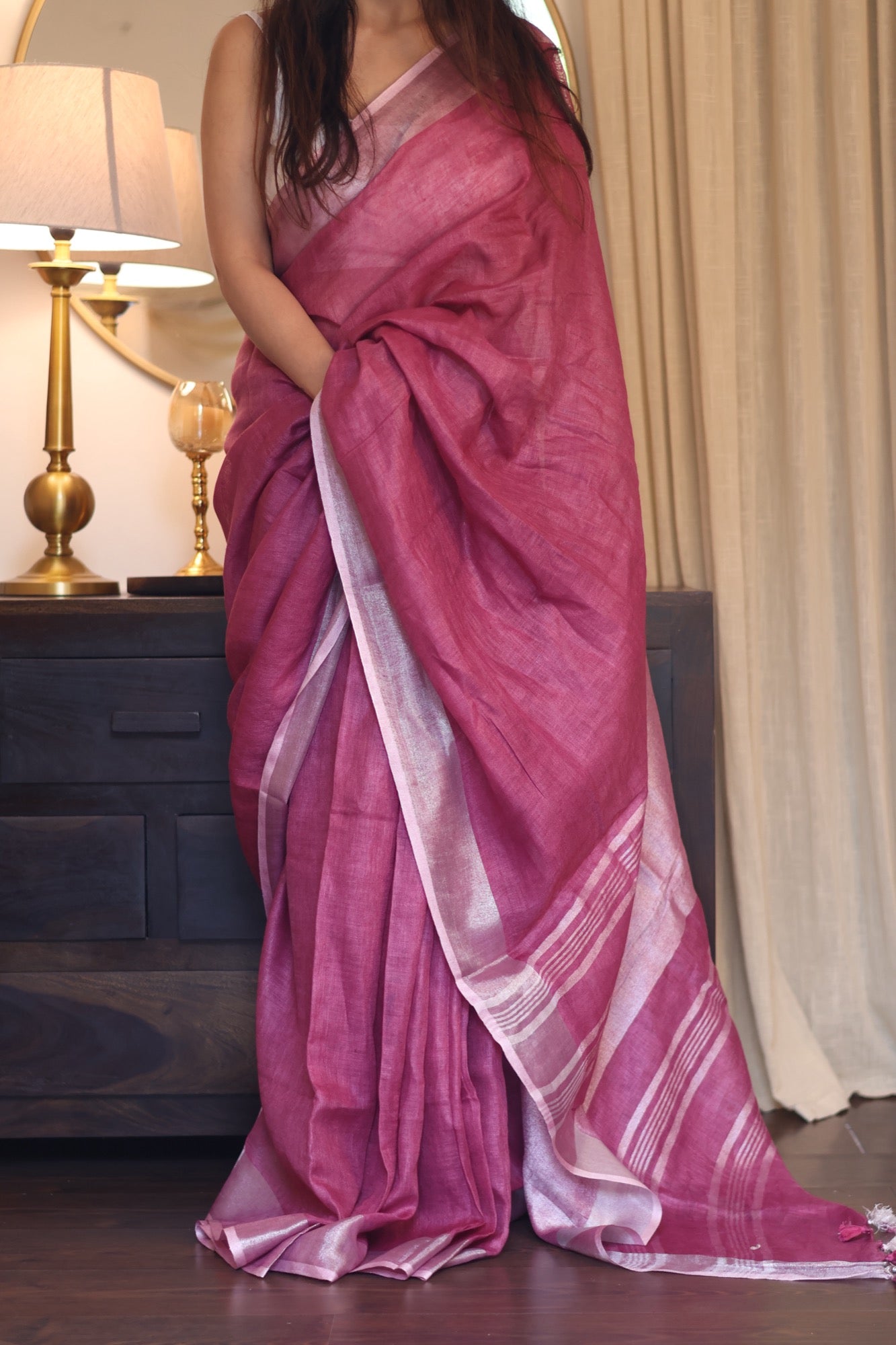 A playful nod to summer’s juiciest treat, Jamun is a luscious burst of pink that’s bold, breezy, and beautifully woven in pure linen. The textured silver zari lines add a subtle sparkle—like the glint of sunlight on ripe fruit. With playful pink tassels dancing at the edges, it’s perfect for both power meetings and weekend getaways. Easy to drape and lighter than a monsoon breeze, Jamun is your go-to workwear with a twist of whimsy.