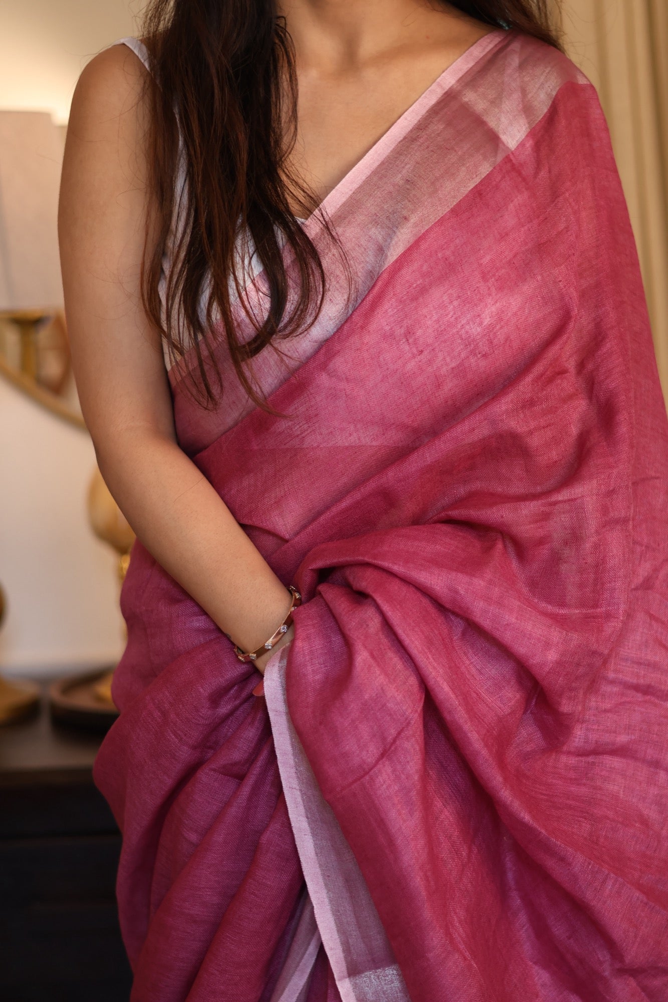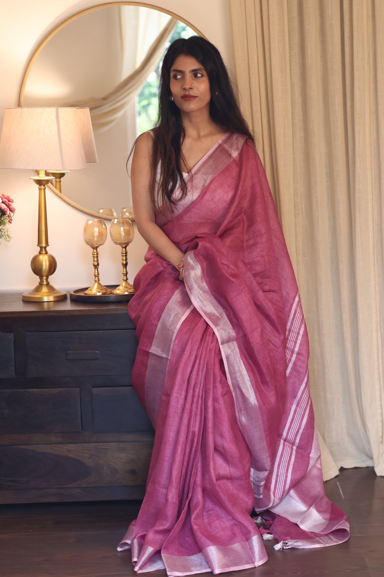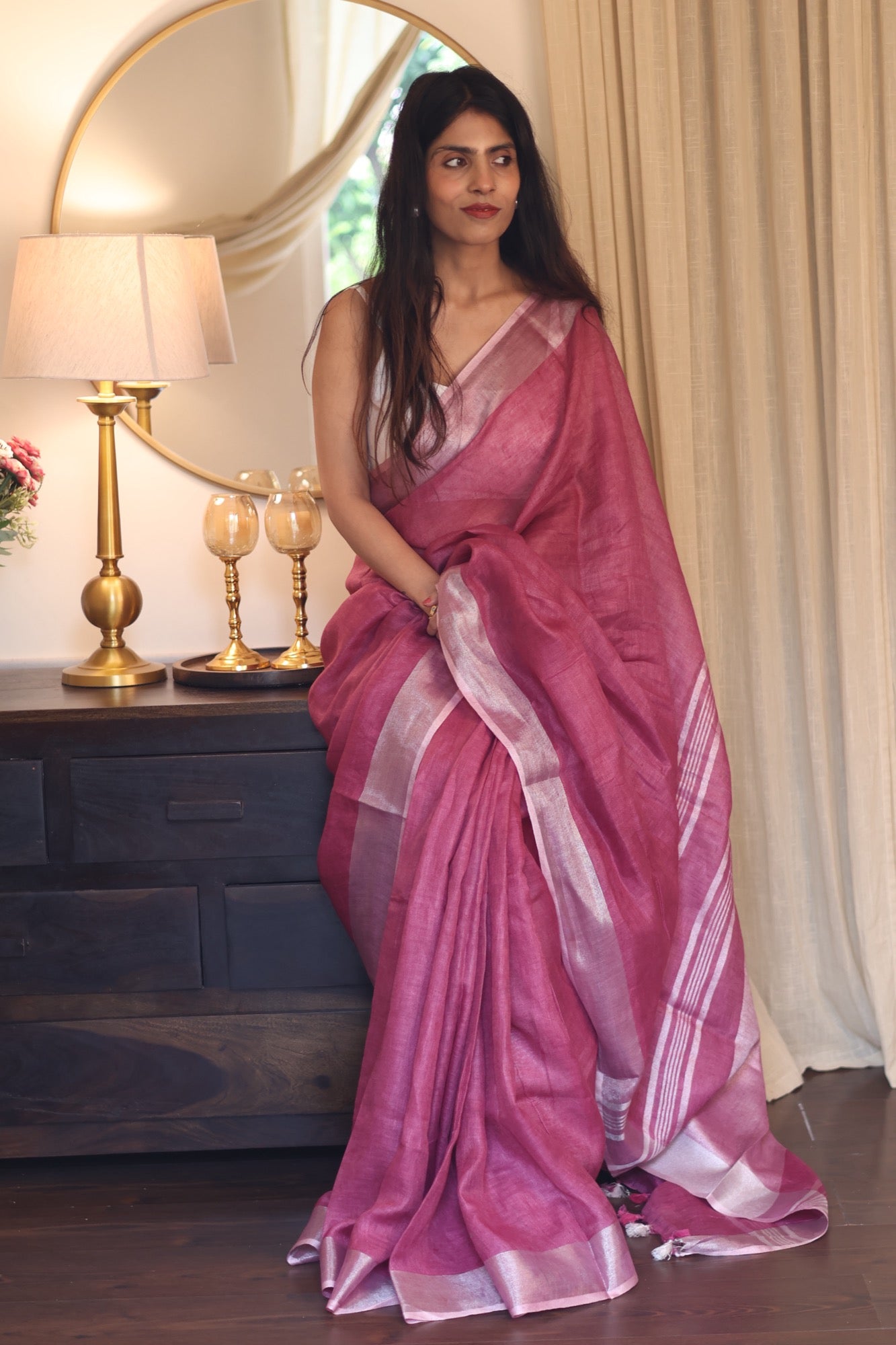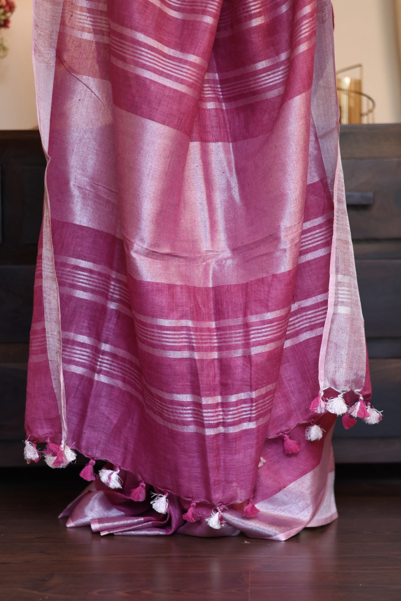 A playful nod to summer’s juiciest treat, Jamun is a luscious burst of pink that’s bold, breezy, and beautifully woven in pure linen. The textured silver zari lines add a subtle sparkle—like the glint of sunlight on ripe fruit. With playful pink tassels dancing at the edges, it’s perfect for both power meetings and weekend getaways. Easy to drape and lighter than a monsoon breeze, Jamun is your go-to workwear with a twist of whimsy.