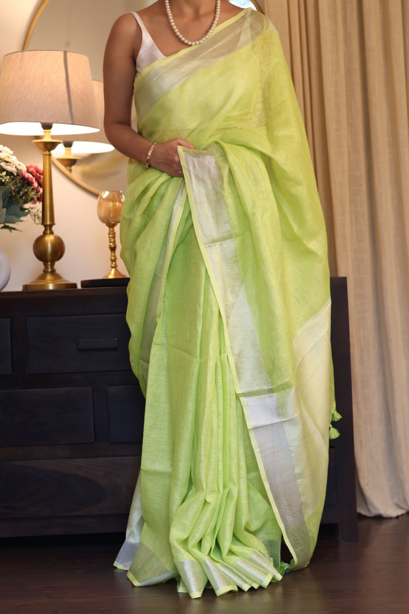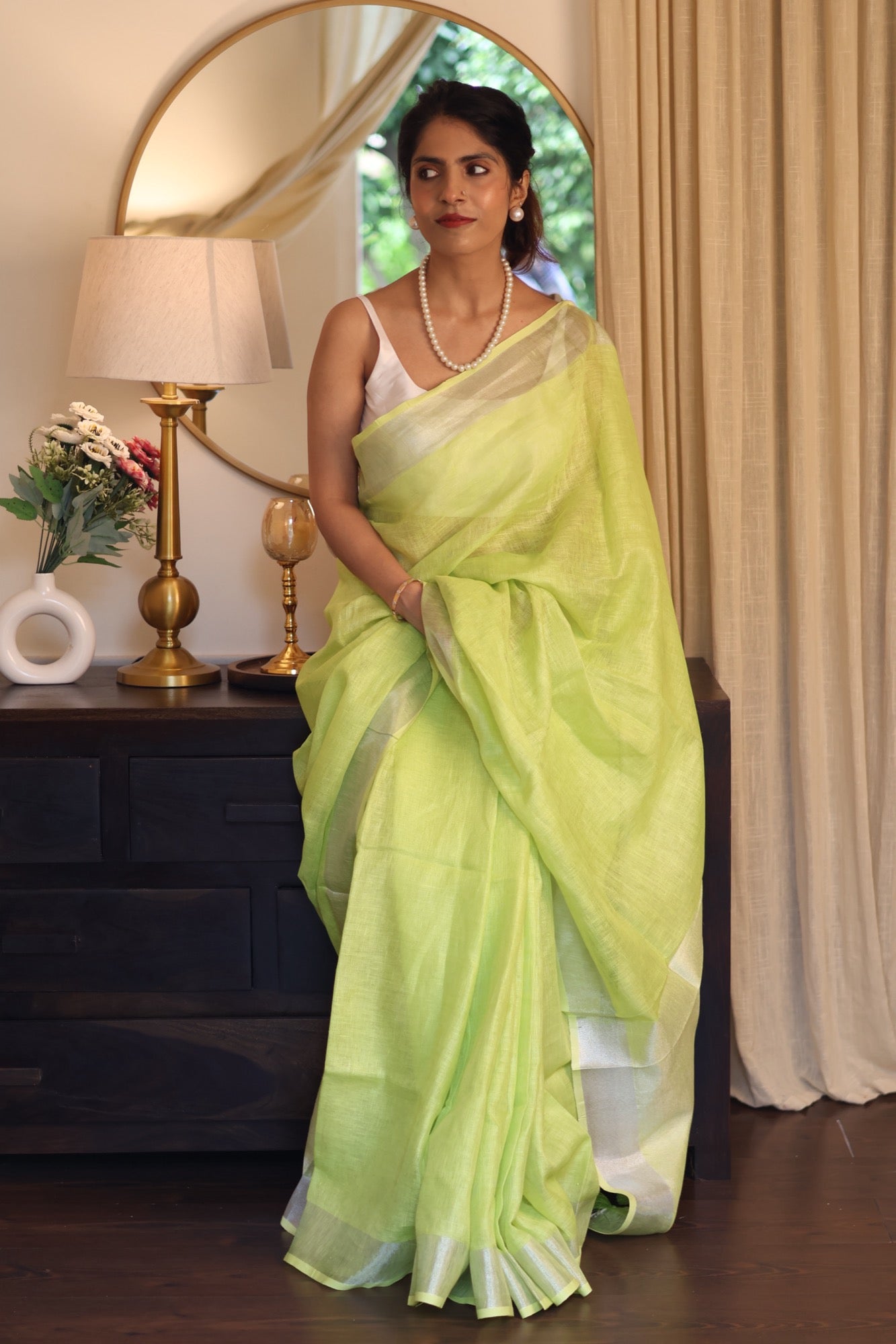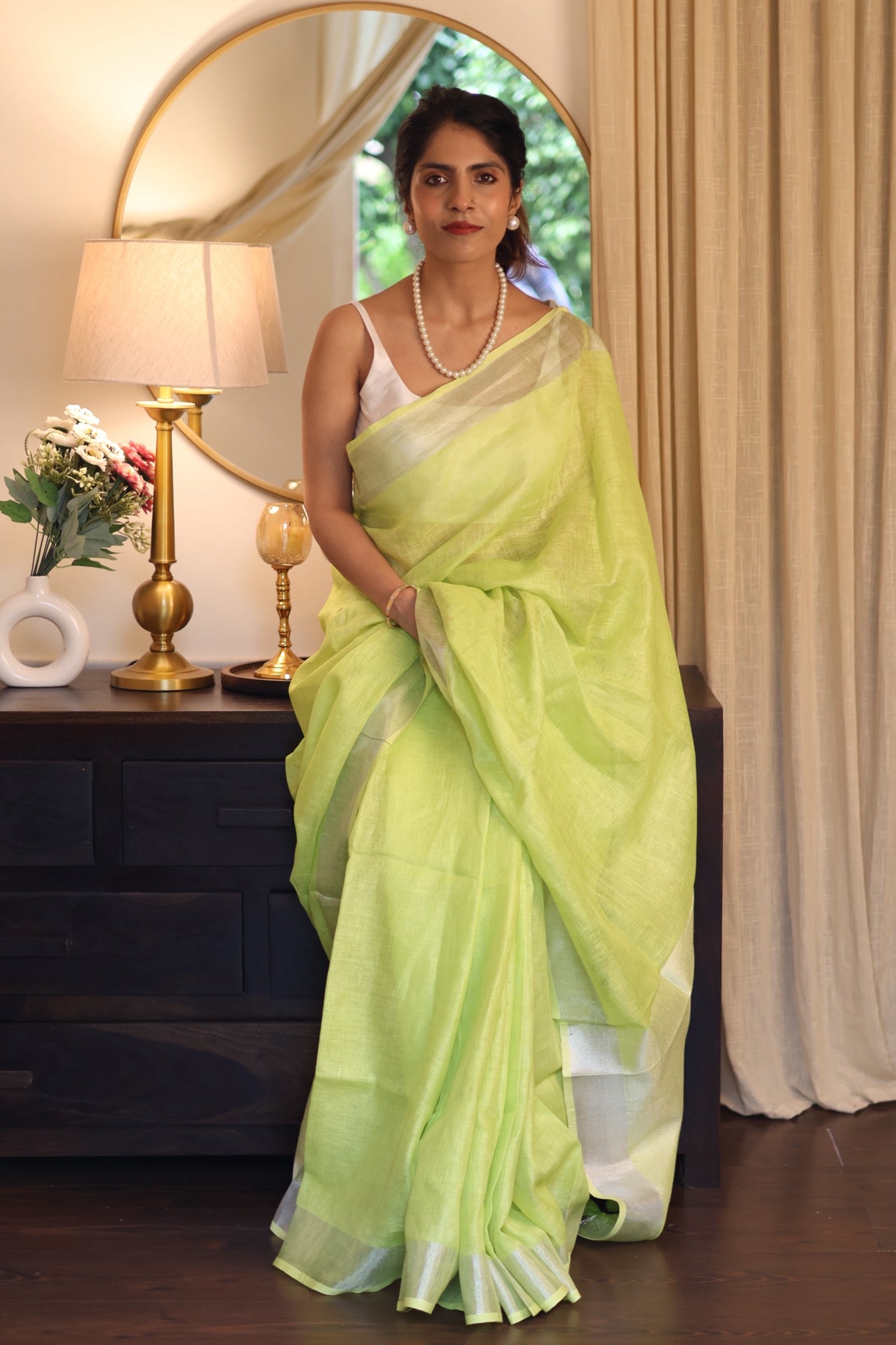 Like the first ray of sunshine after a monsoon drizzle, Keri is a burst of zest and freshness. In a vibrant lime green hue, this handloom pure linen saree is a statement in effortless grace. Accentuated with fine silver zari stripes on the pallu and delicate tassels, it's designed for the woman who brings her own sunshine to work. Lightweight and breathable, it’s a perfect pick for long office hours and post-work coffee catchups.