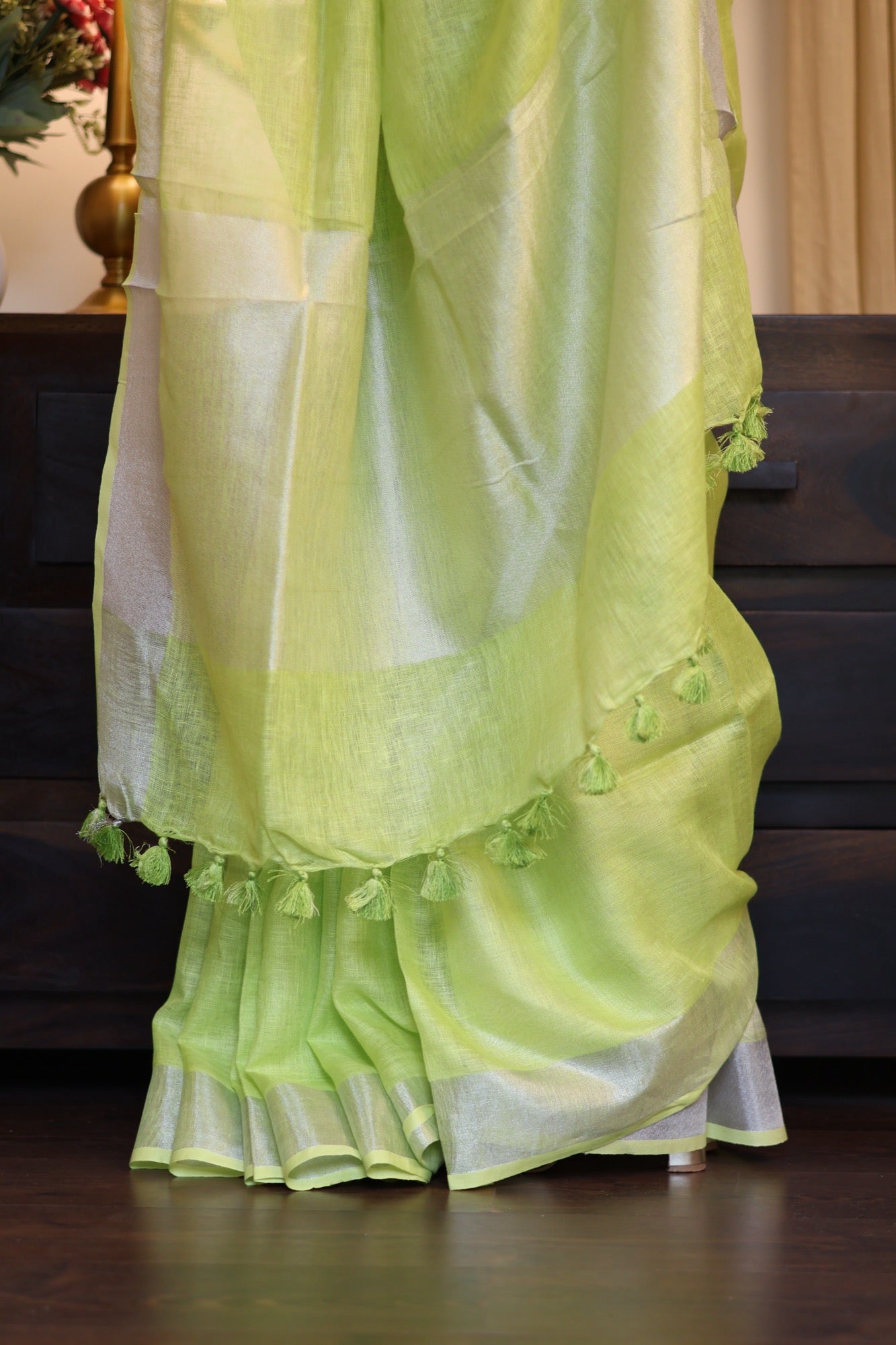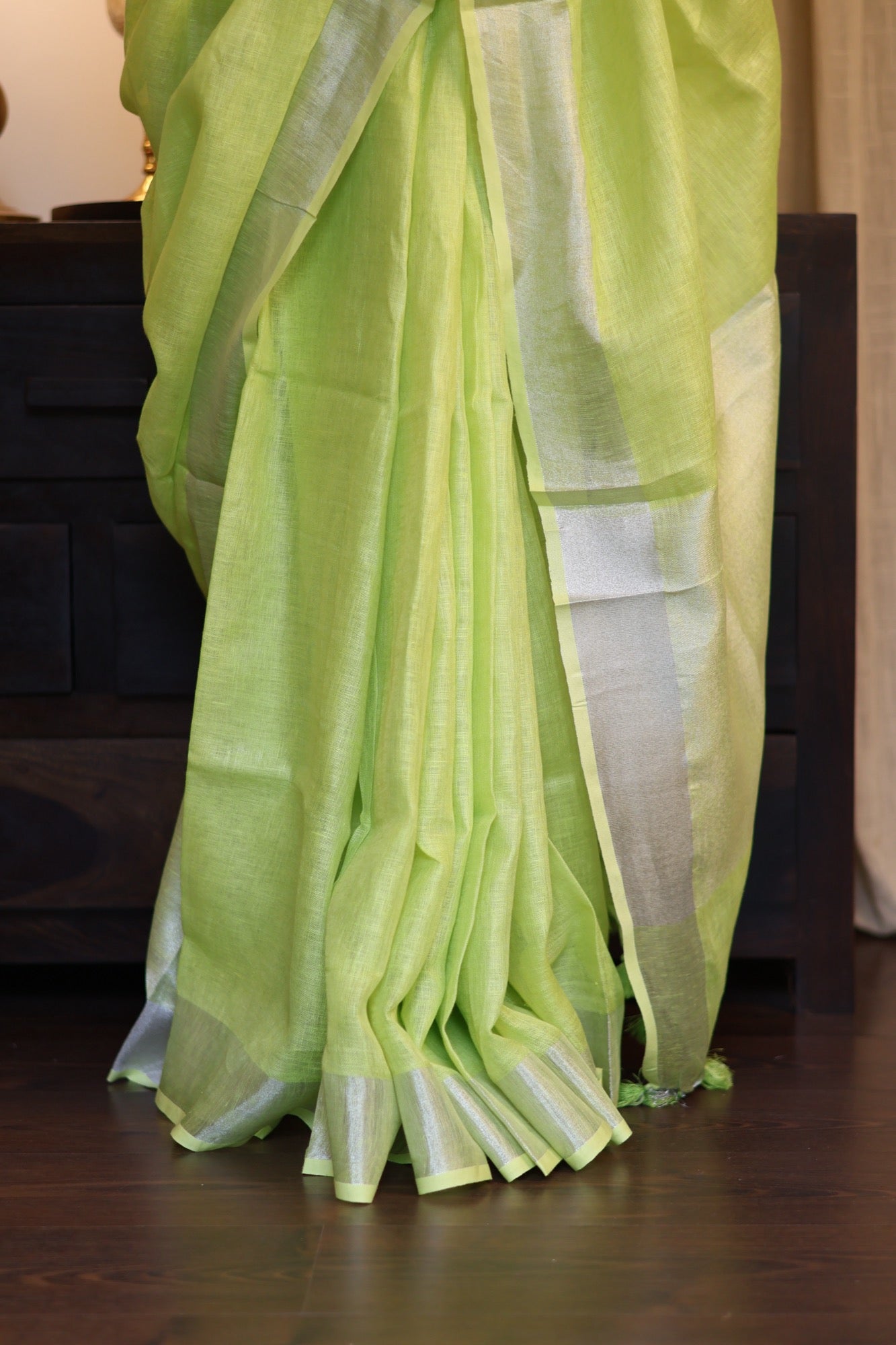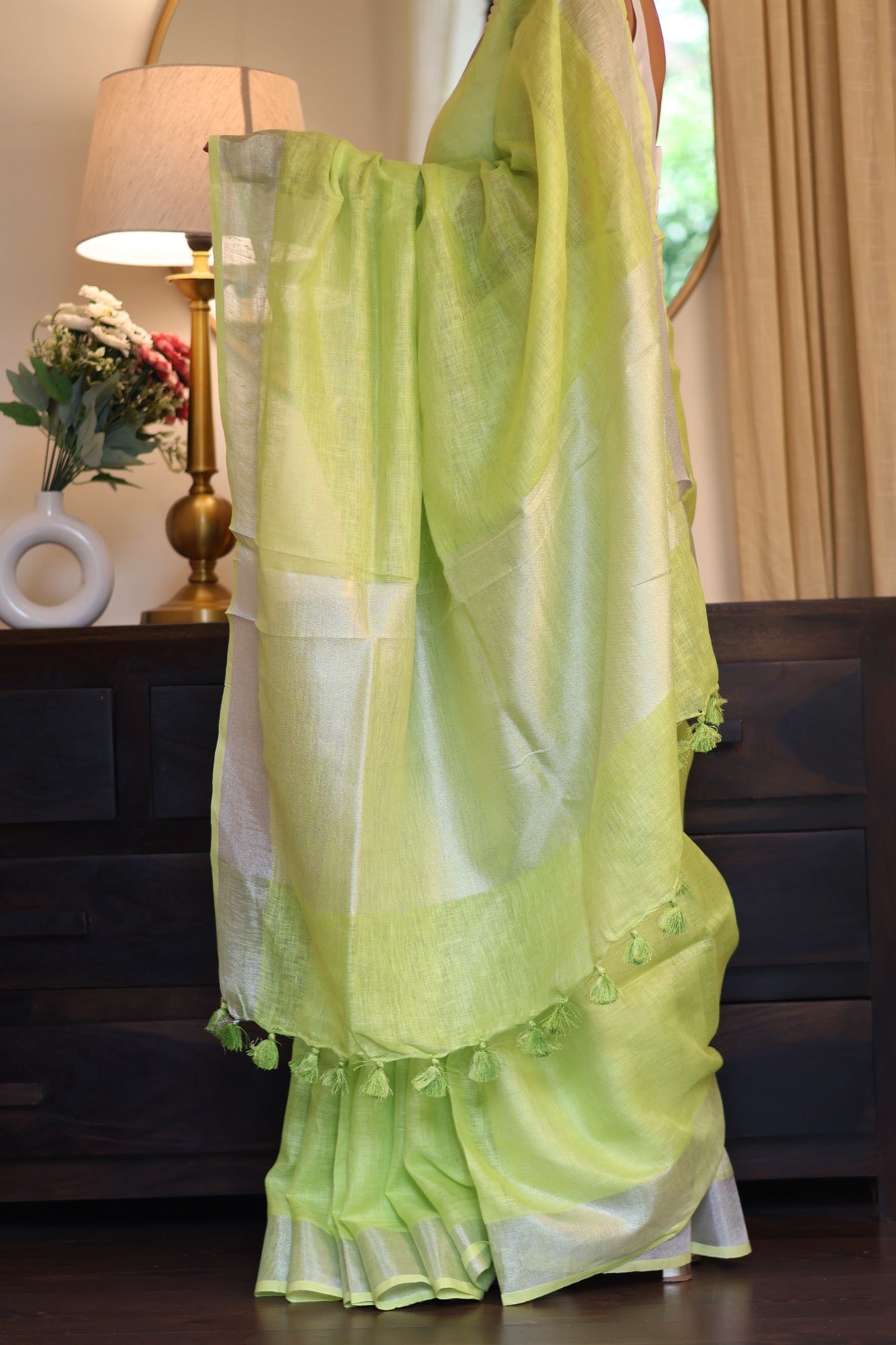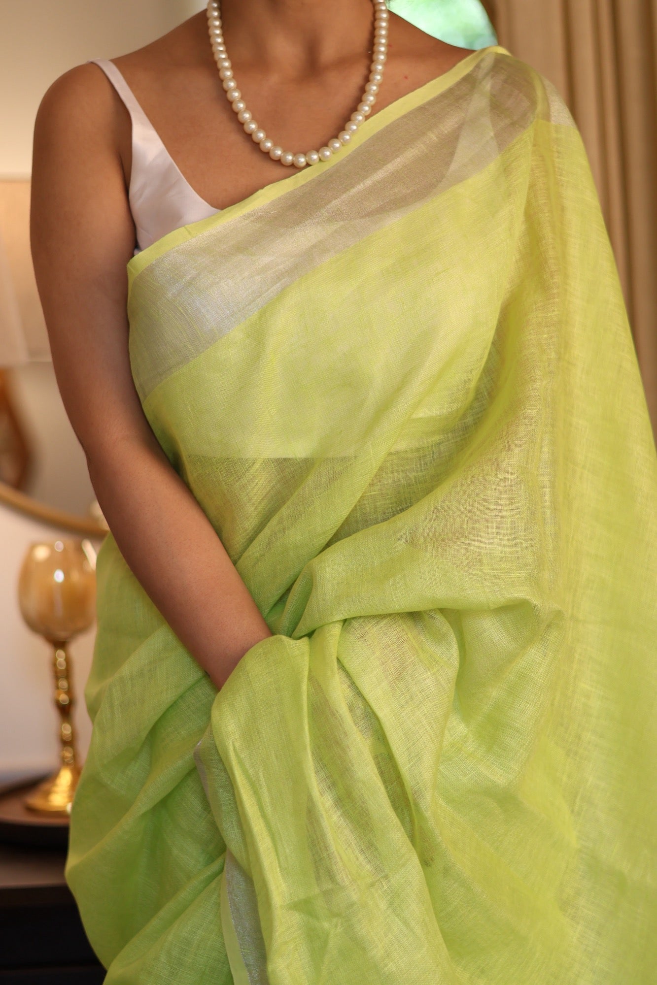 Like the first ray of sunshine after a monsoon drizzle, Keri is a burst of zest and freshness. In a vibrant lime green hue, this handloom pure linen saree is a statement in effortless grace. Accentuated with fine silver zari stripes on the pallu and delicate tassels, it's designed for the woman who brings her own sunshine to work. Lightweight and breathable, it’s a perfect pick for long office hours and post-work coffee catchups.