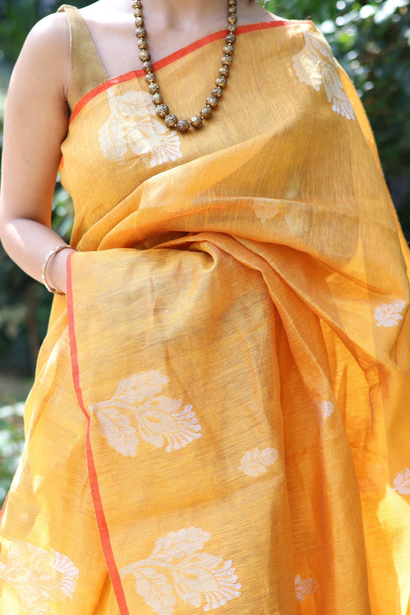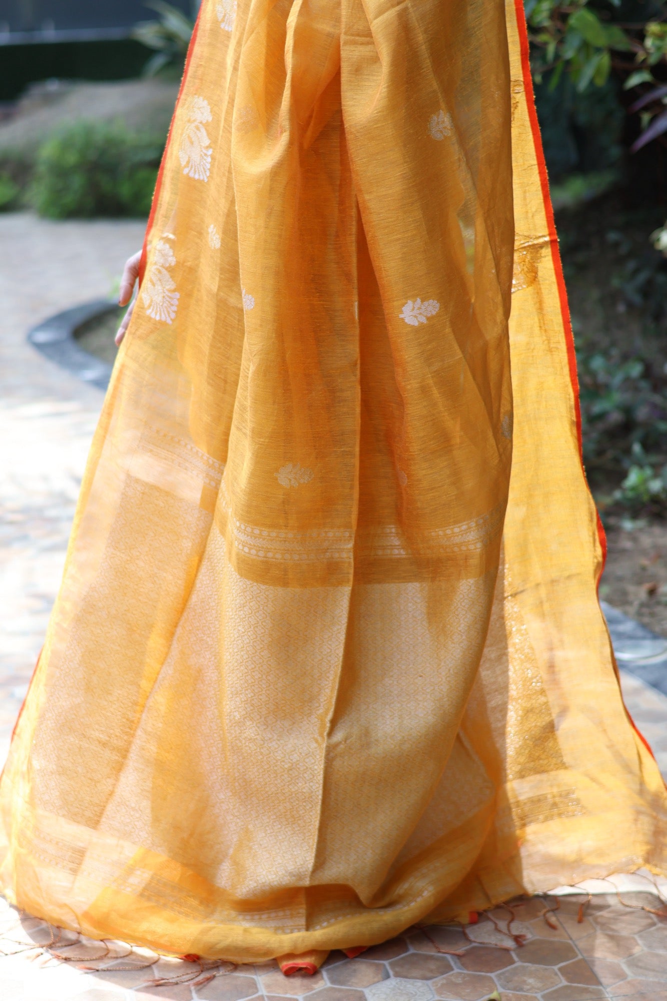Luminous and light as sunshine Kesar glows in pure Banarasi tissue linen, woven with soft zari motifs that shimmer with every step. Its golden hue and gentle red edging make it a festive favourite elegant, airy, and effortlessly striking.