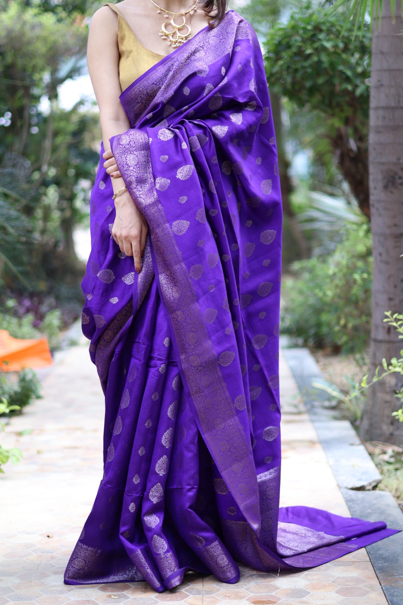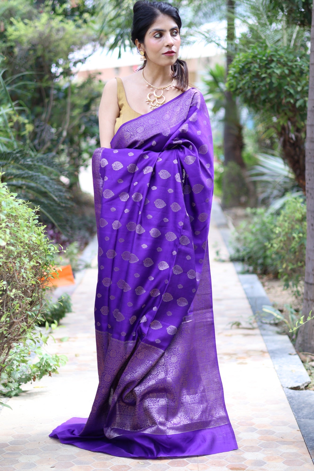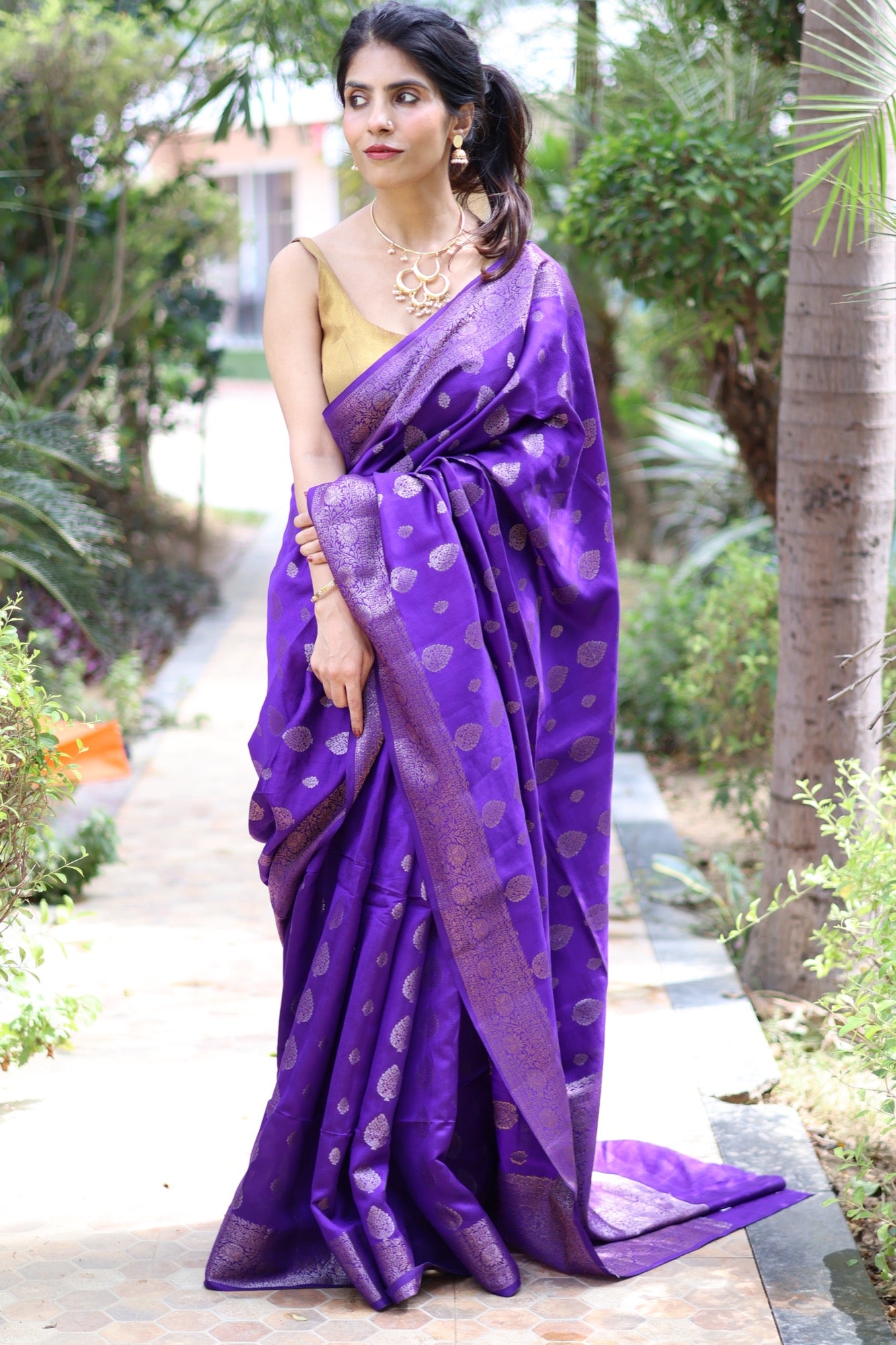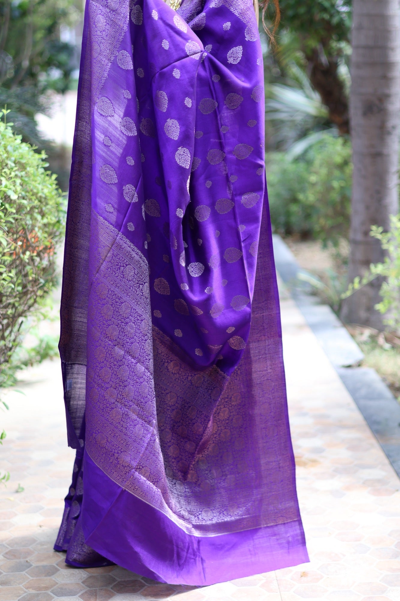 In the quiet glow of Chiniya silk, Mahveen unfolds like poetry in purple. The saree glimmers with woven zari motifs across its lustrous body, balanced by an intricate Banarasi border that adds depth and regality. Soft to touch yet rich in texture, it’s a drape that moves like liquid silk perfect for weddings, festive evenings, or any moment that calls for quiet splendour.