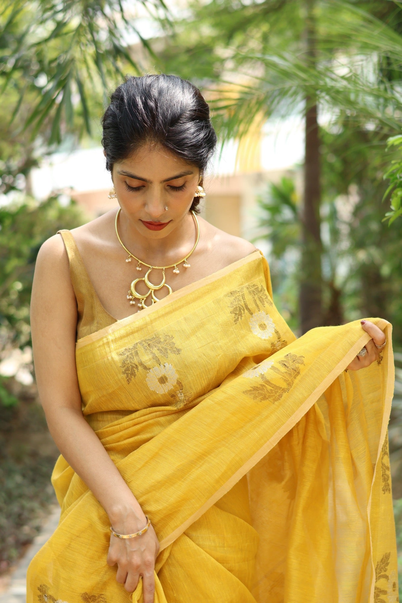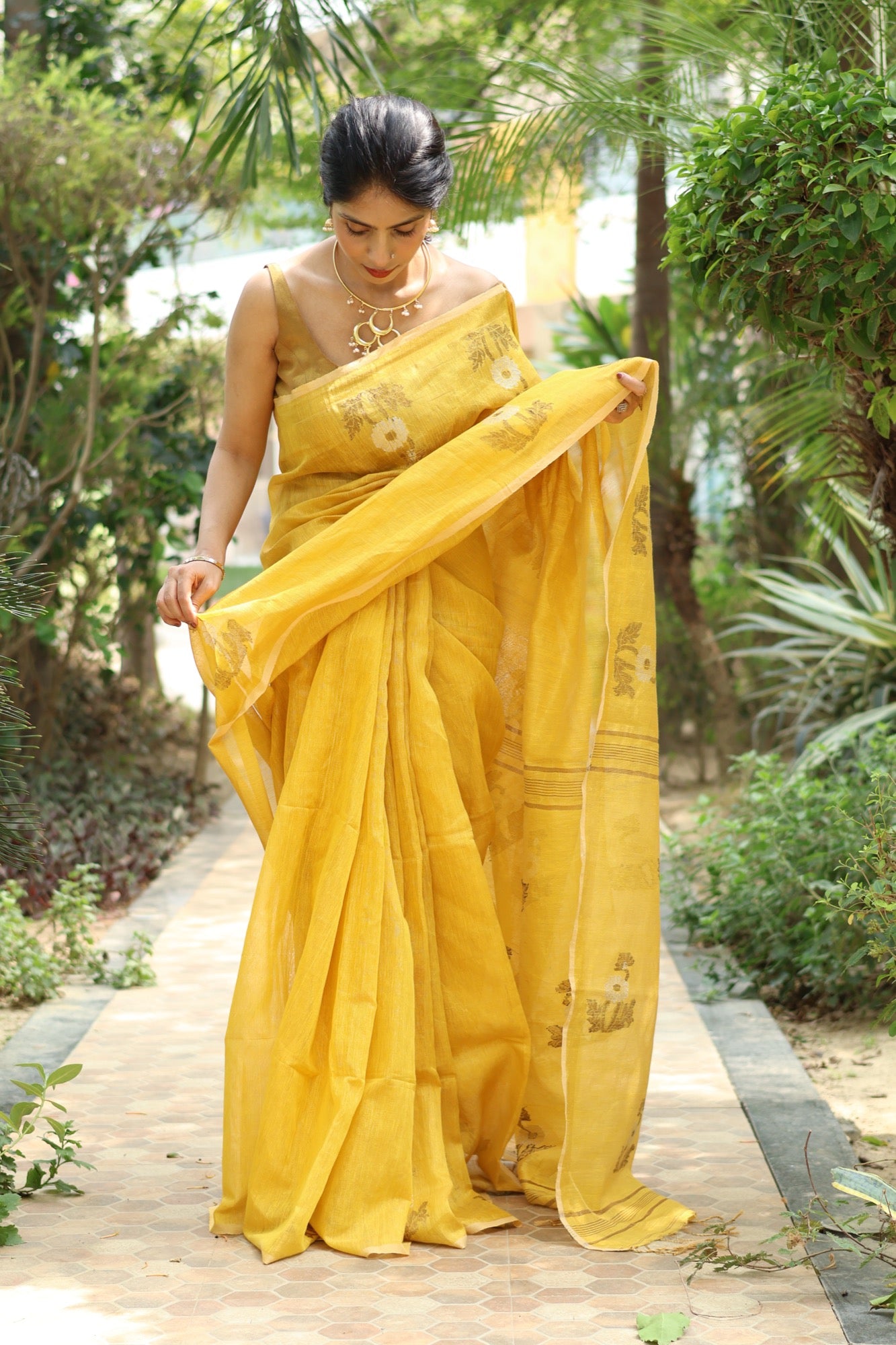 Like the first rays of morning light, Marigold glows with a soft golden hue that instantly uplifts. Woven in fine tissue linen, it carries delicate floral motifs that shimmer gently as you move. Lightweight, breathable, and effortlessly graceful — it’s perfect for festive mornings or days when you want to wear sunshine itself.