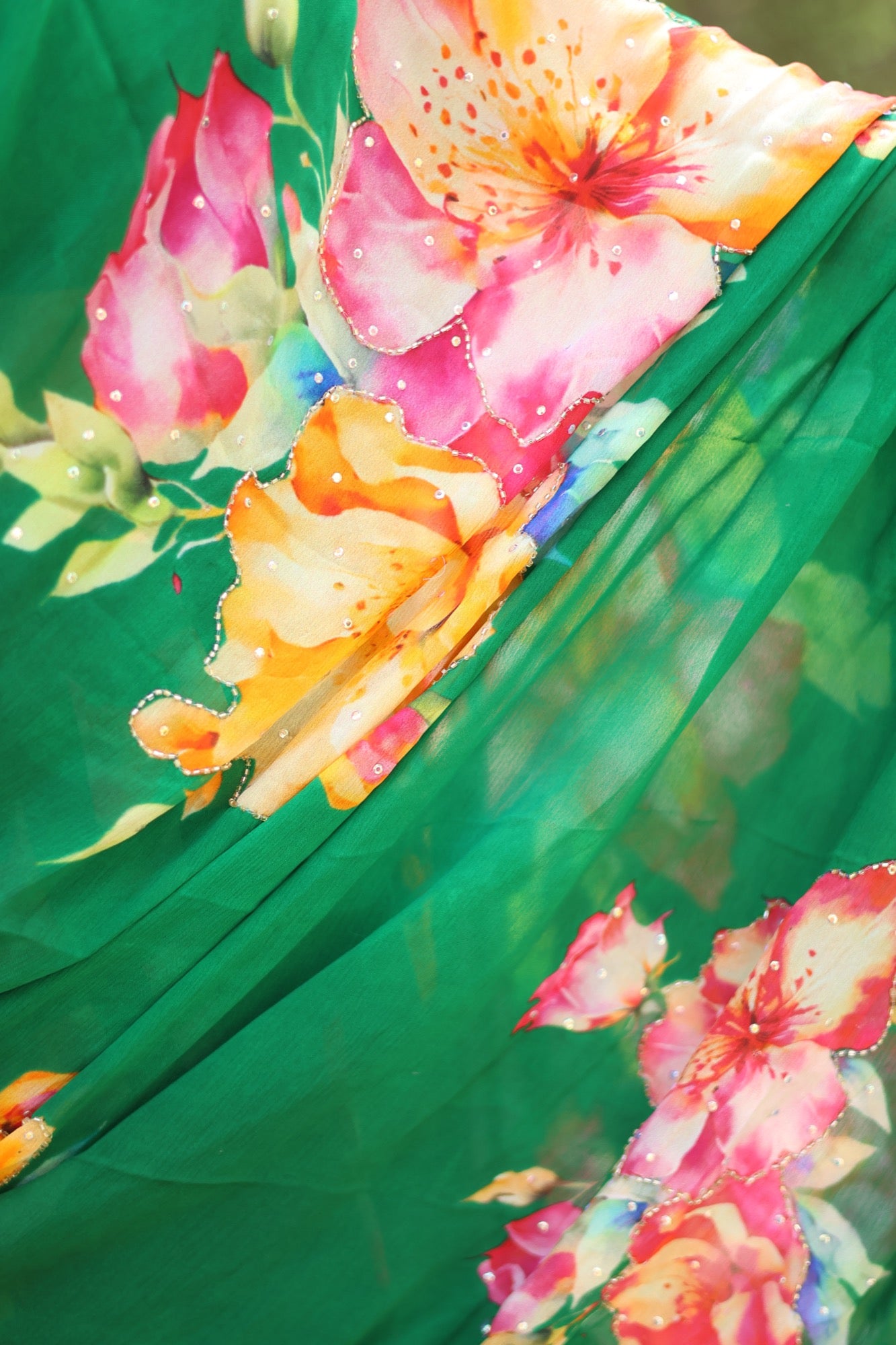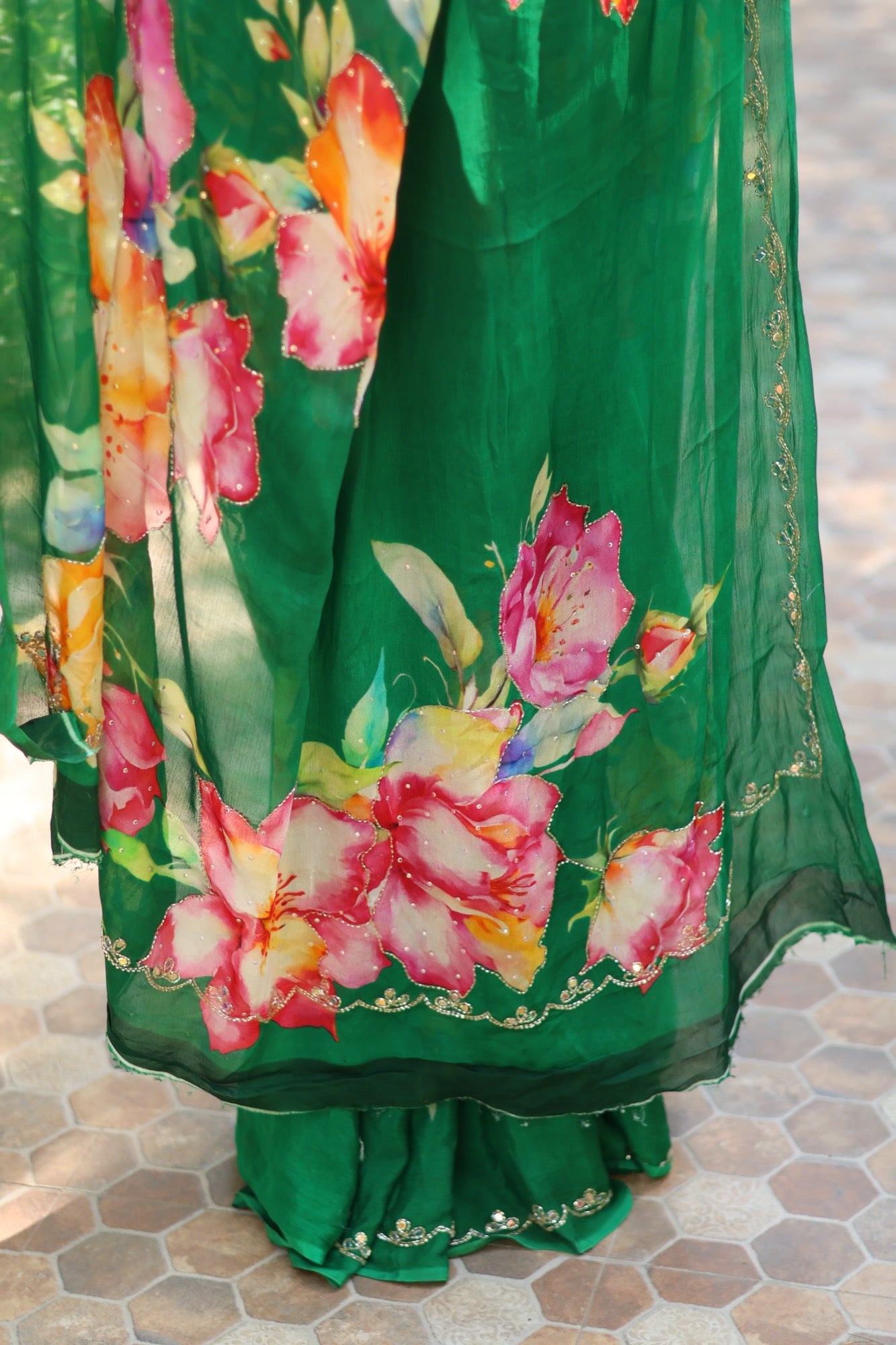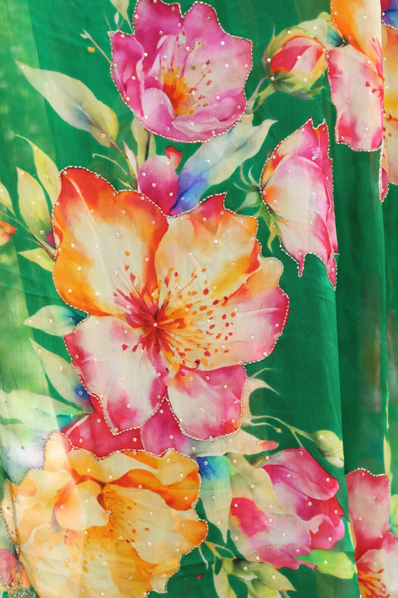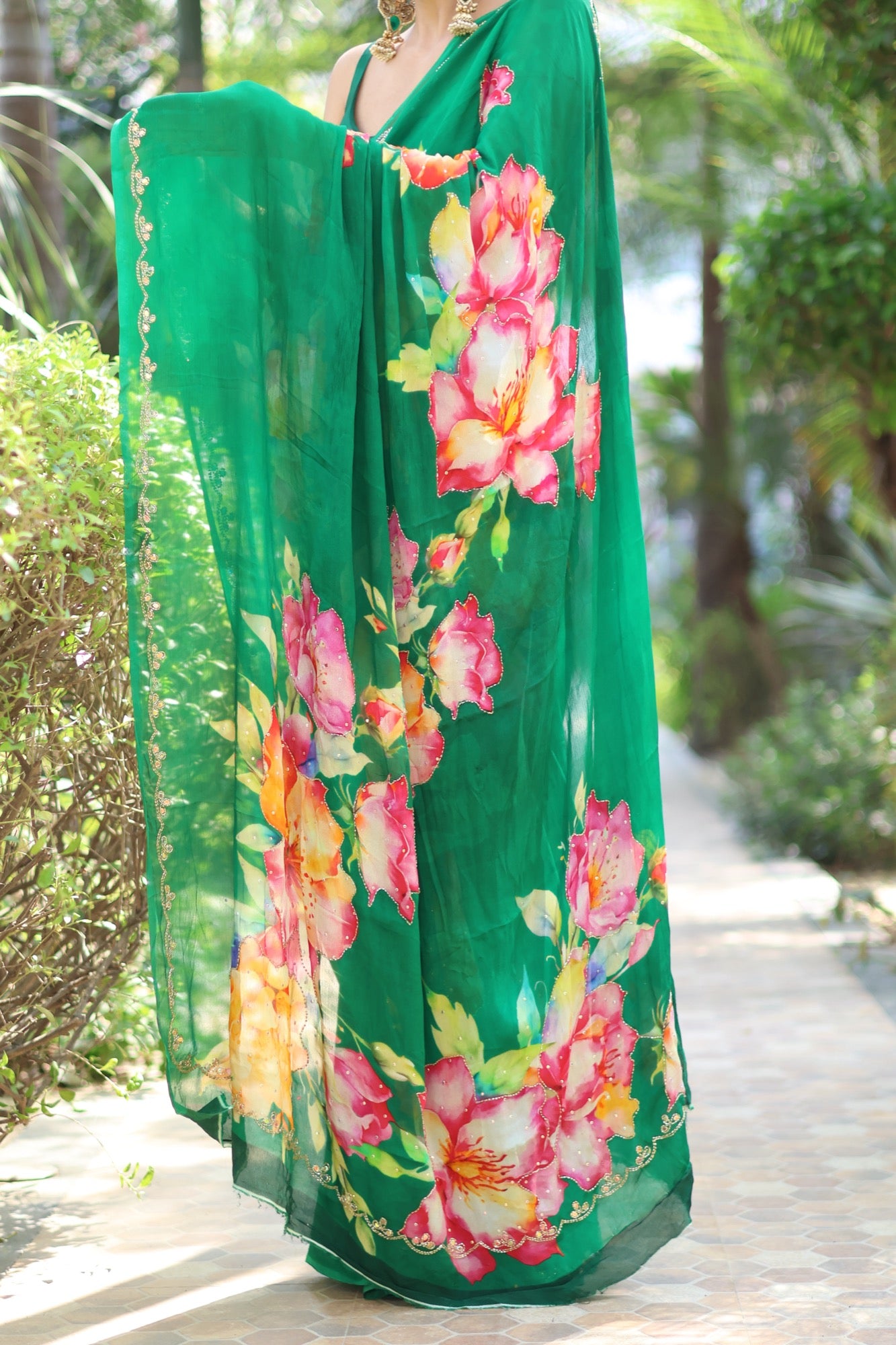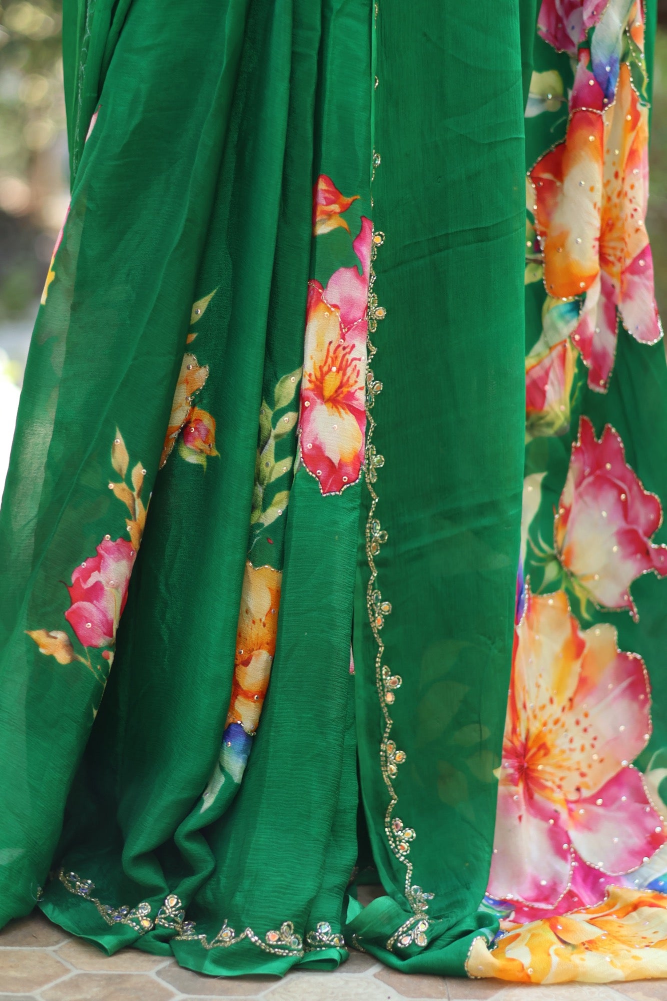 She’s calm yet full of color Meher is that soft smile after a storm, that quiet joy that fills a room. Crafted in pure Chinon silk with vibrant floral prints and delicate gotapatti and cutdana handwork, this saree is made for women who find grace in movement and beauty in the everyday.