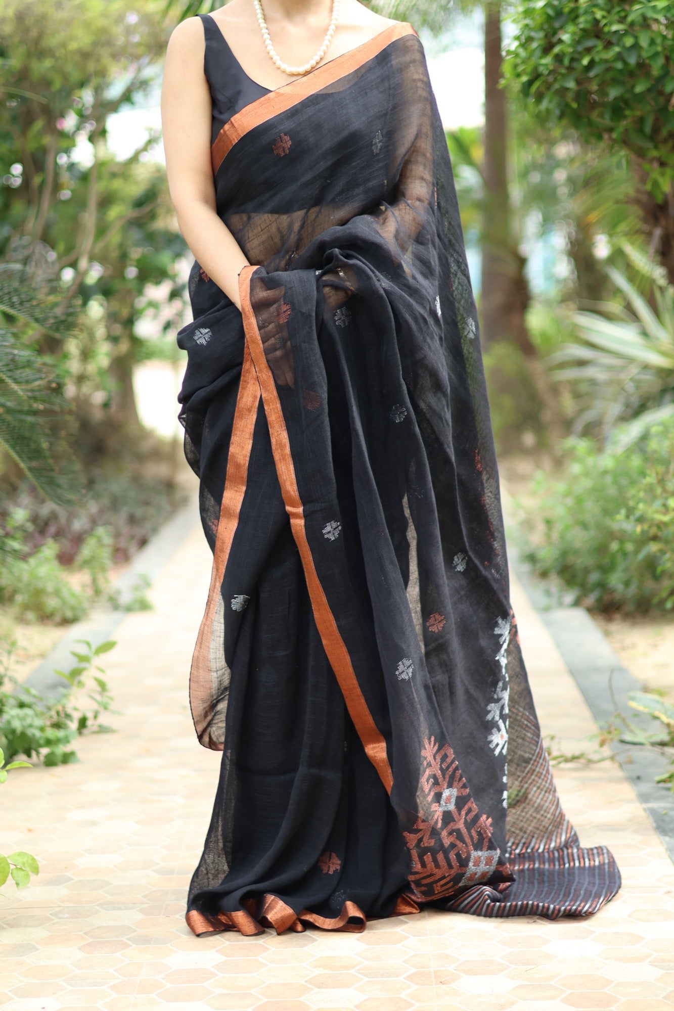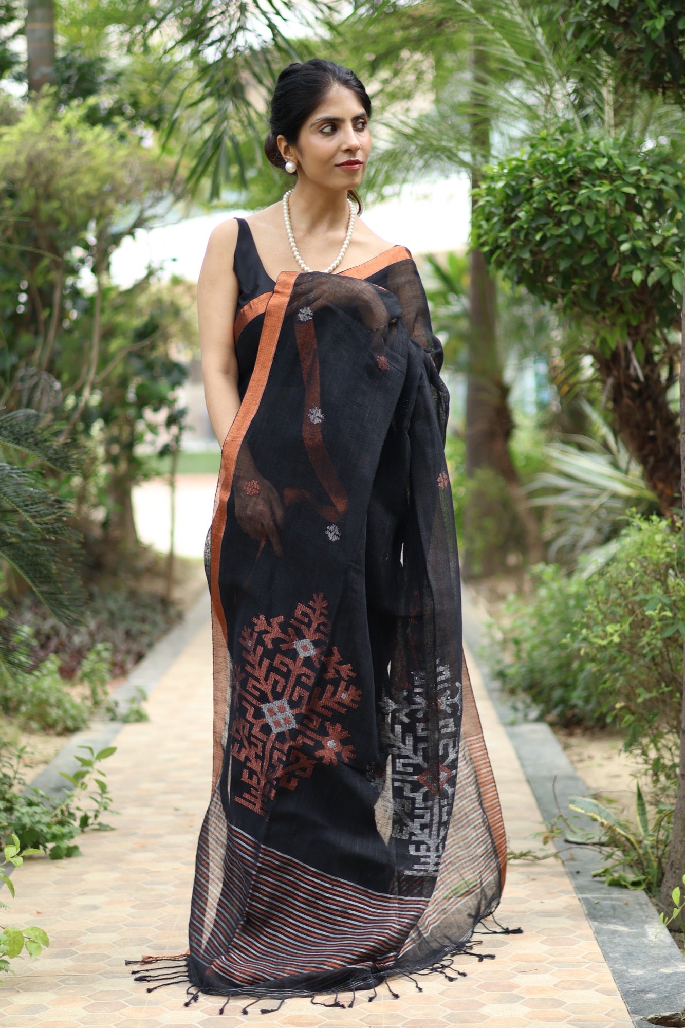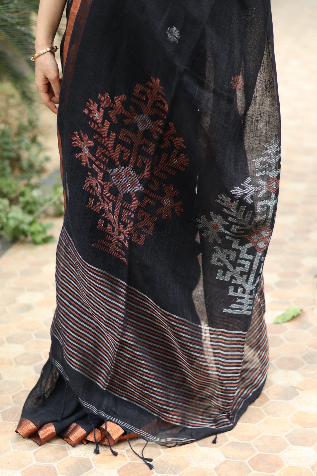 Bold yet beautifully balanced, Midnight Mosaic is a pure linen saree in a rich black base woven with copper and silver threads that create geometric floral patterns across the body and a striking striped pallu. It’s a quiet stunner, minimal yet magnetic, perfect for those who love making a statement without saying too much.