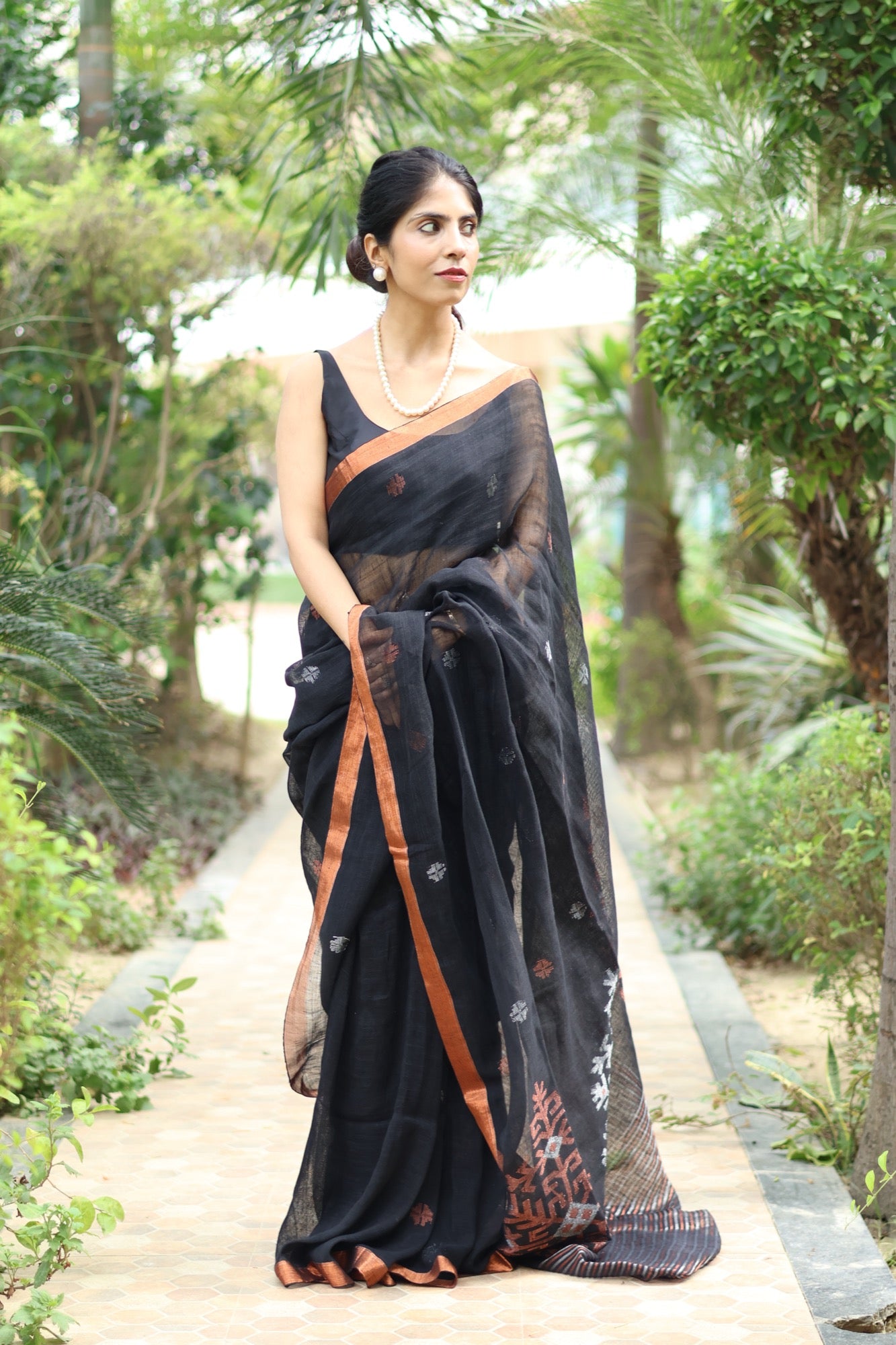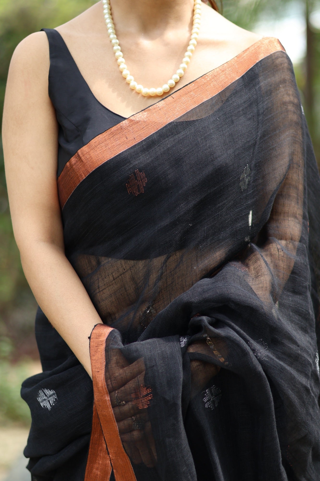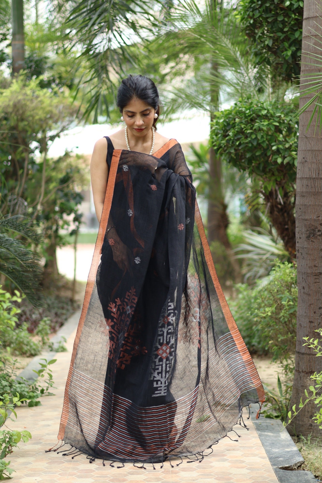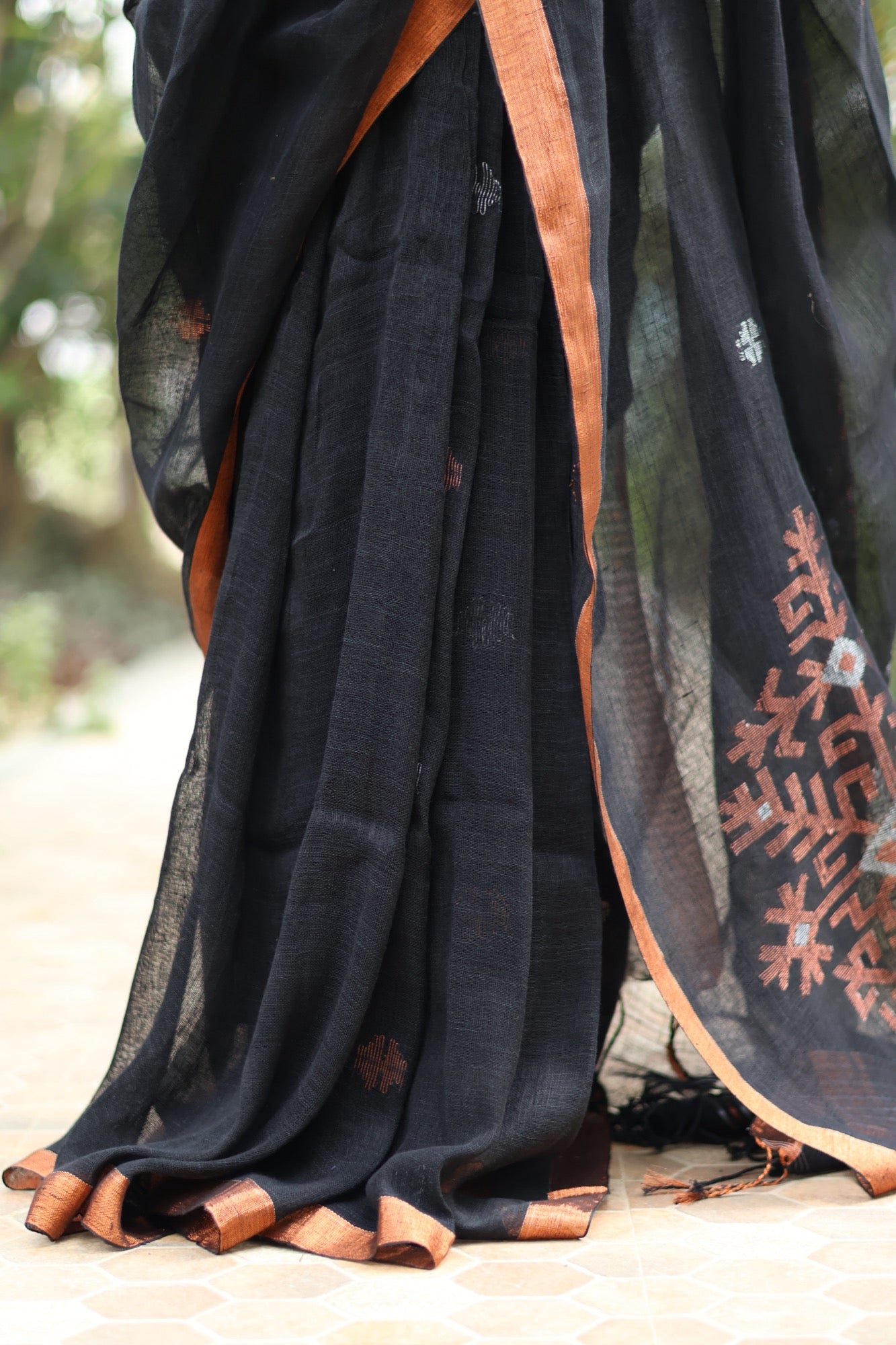 Bold yet beautifully balanced, Midnight Mosaic is a pure linen saree in a rich black base woven with copper and silver threads that create geometric floral patterns across the body and a striking striped pallu. It’s a quiet stunner, minimal yet magnetic, perfect for those who love making a statement without saying too much.