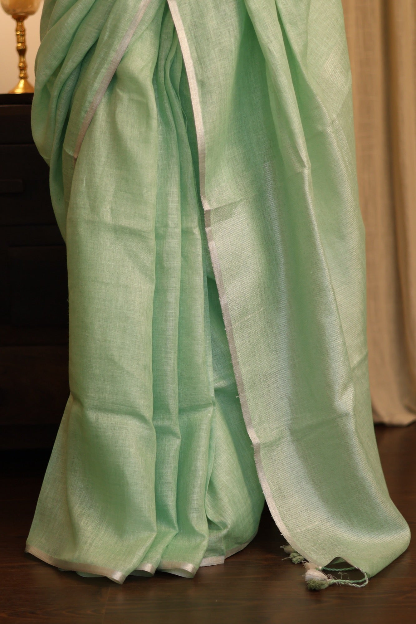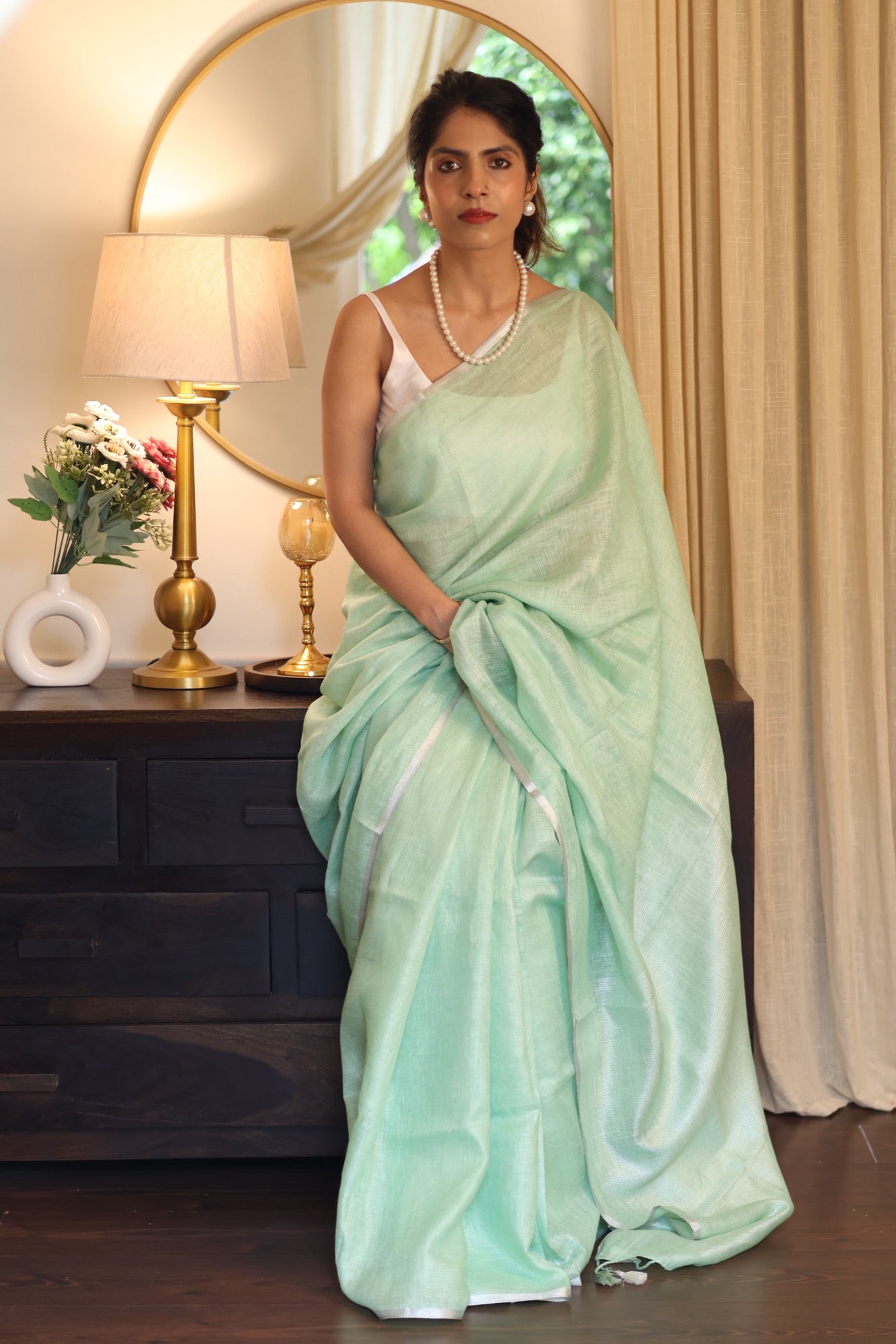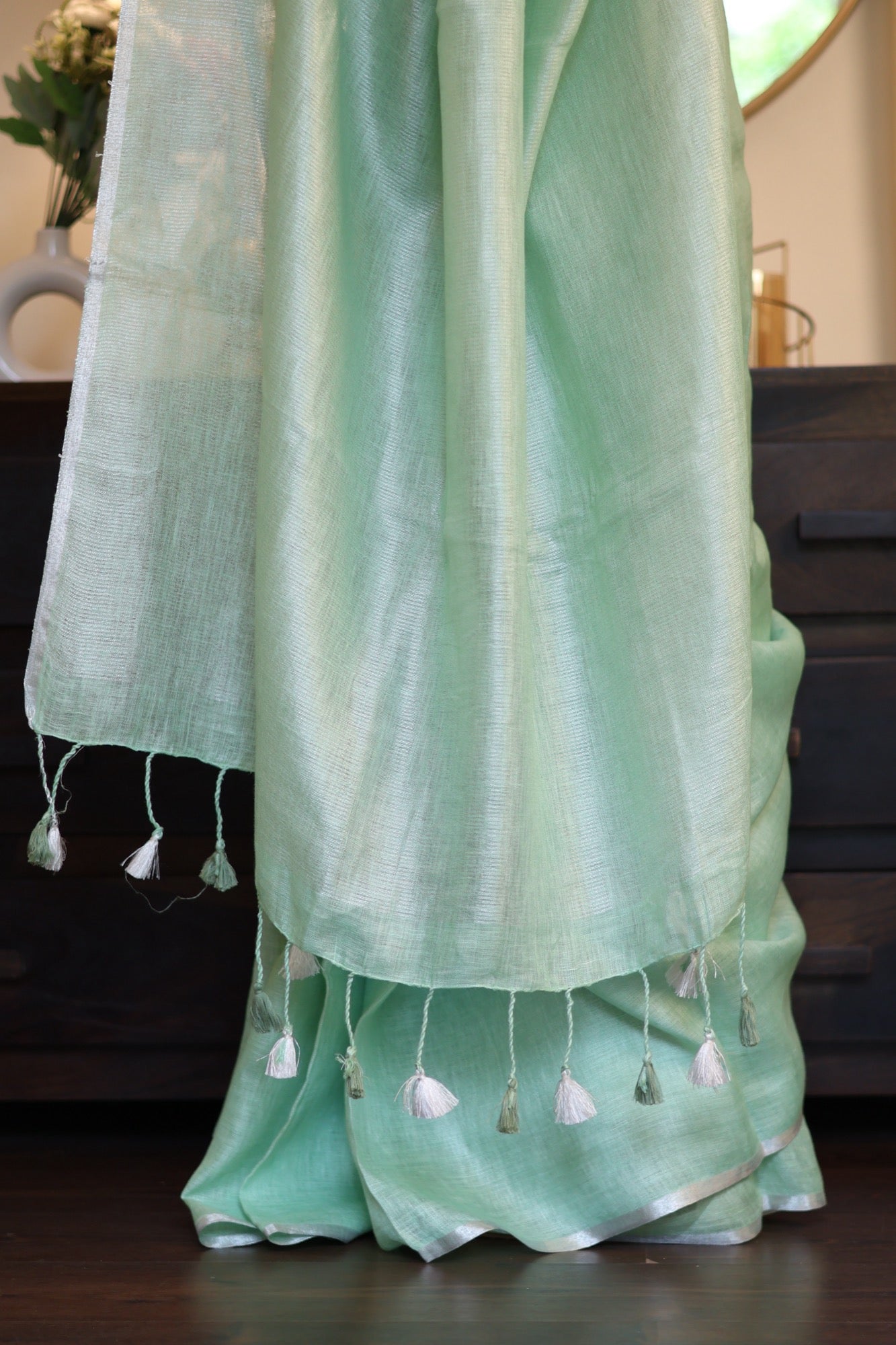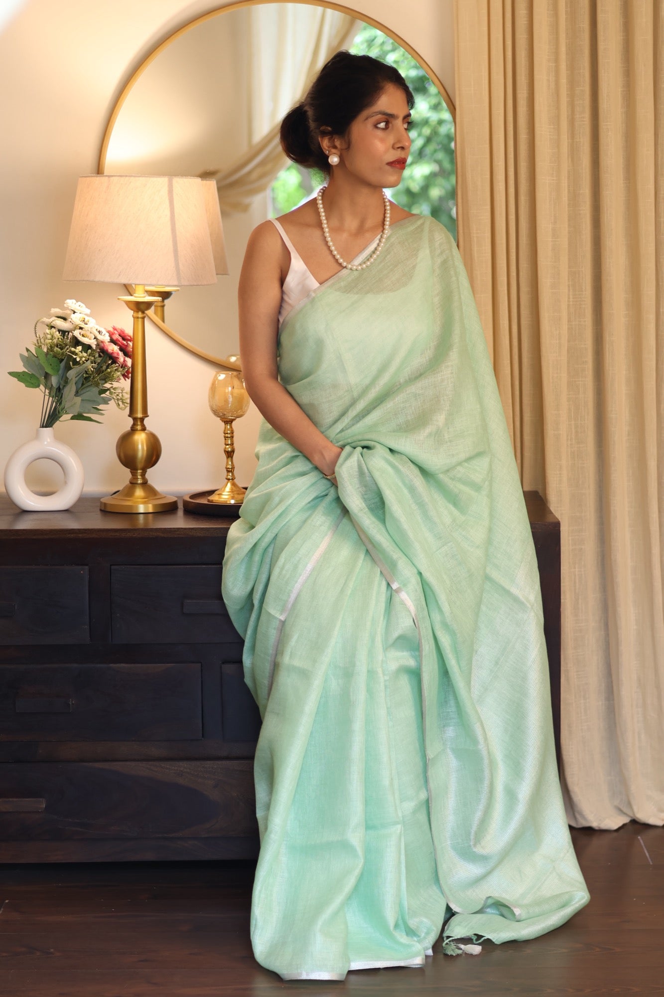 Like the soft embrace of an early morning mist, this mint green pure linen saree whispers elegance with every fold. Adorned with delicate tassels and finished with a fine zari border, it brings together lightness, grace, and quiet sophistication. Whether you’re headed for a brunch under the sun, a quiet work day or an intimate festive gathering, Mist wraps you in effortless charm and refreshing calm.