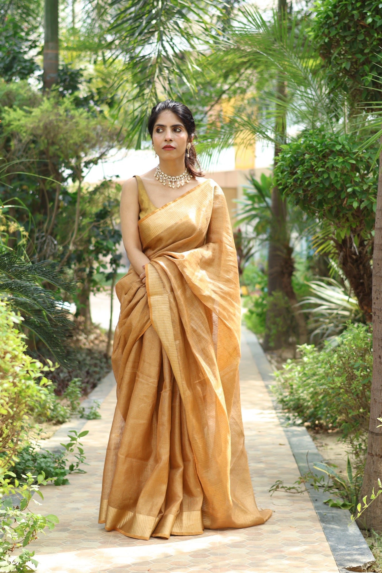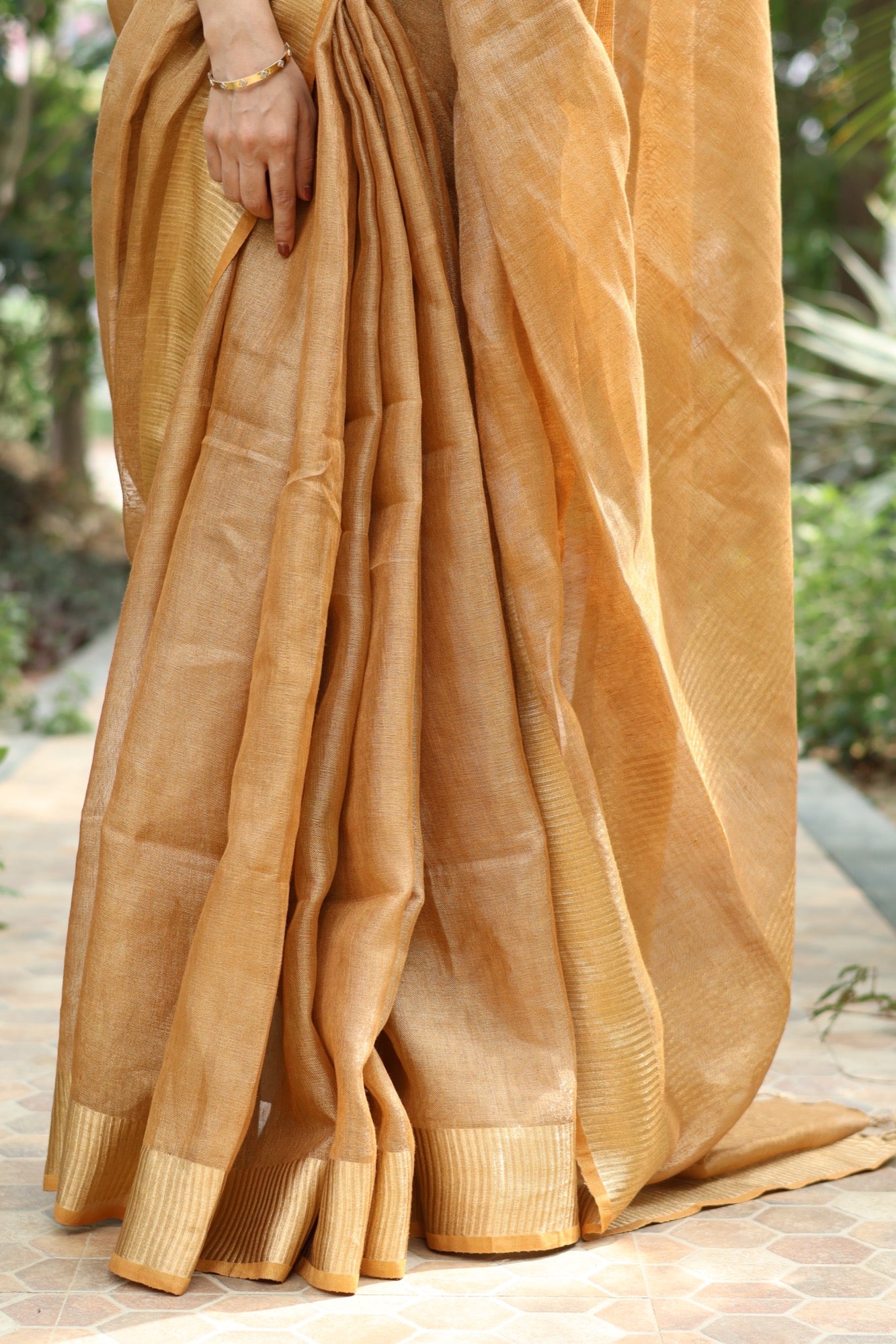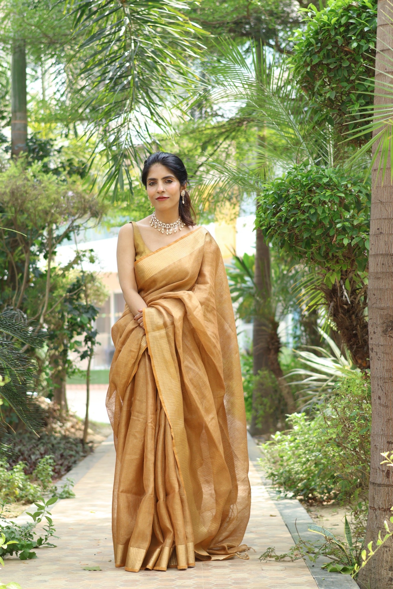 Like melted sunshine on a canvas of bronze, Molten is a luminous celebration of light and grace. This golden-beige tissue linen saree catches the glow of every movement, draping like liquid metal with a subtle shimmer. Its zari stripes and elegant finish make it perfect for festive evenings or intimate celebrations, where you want your style to speak in hushed, refined tones.
