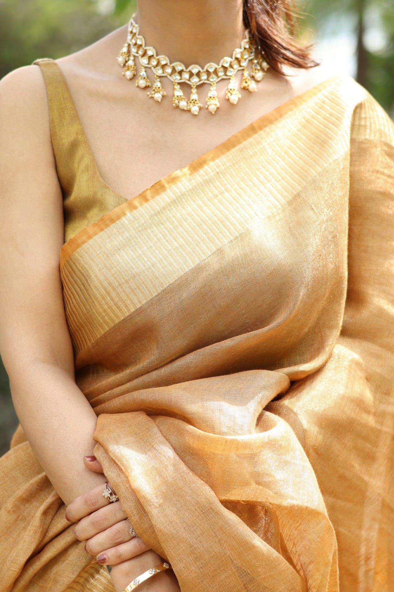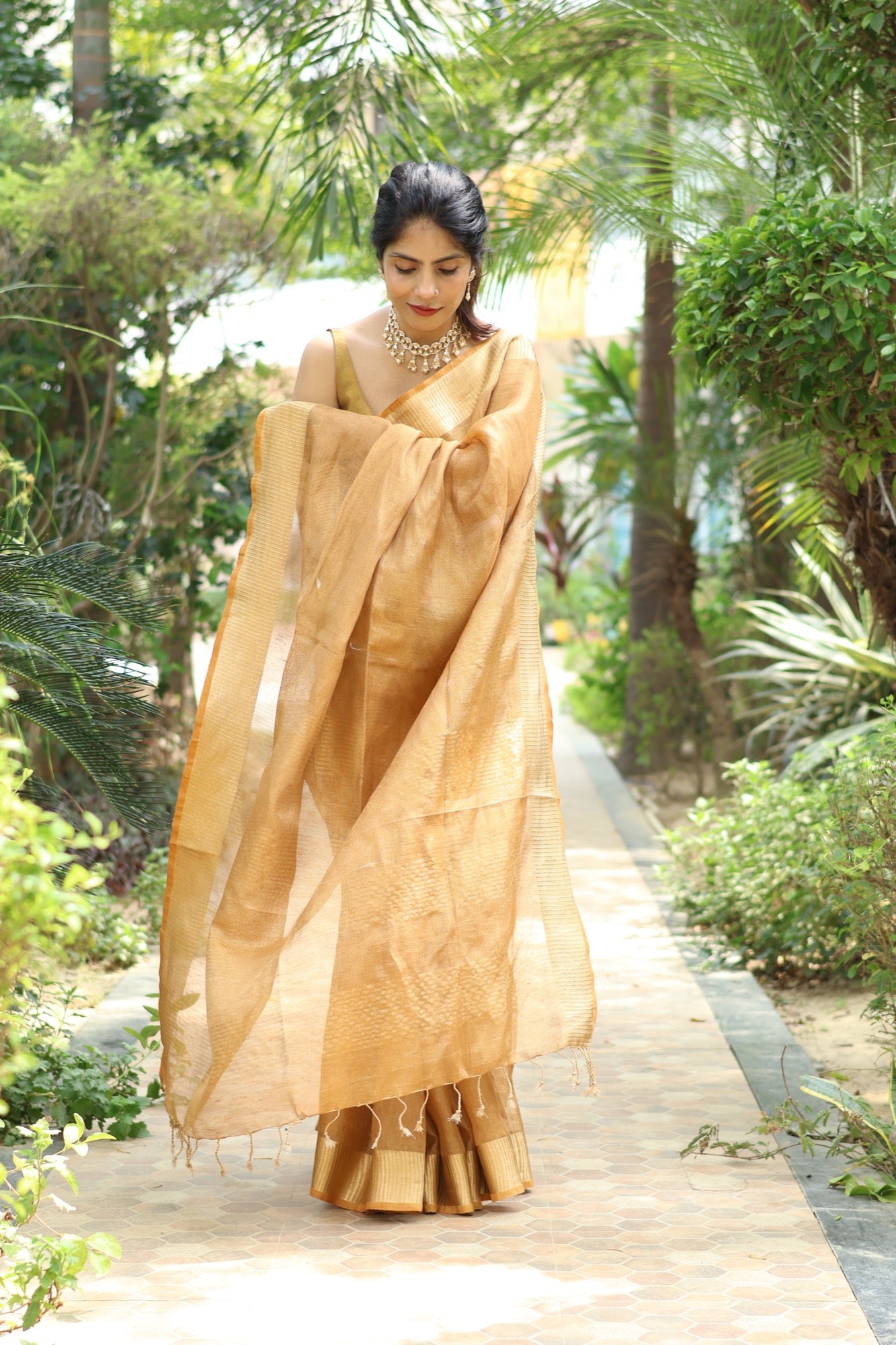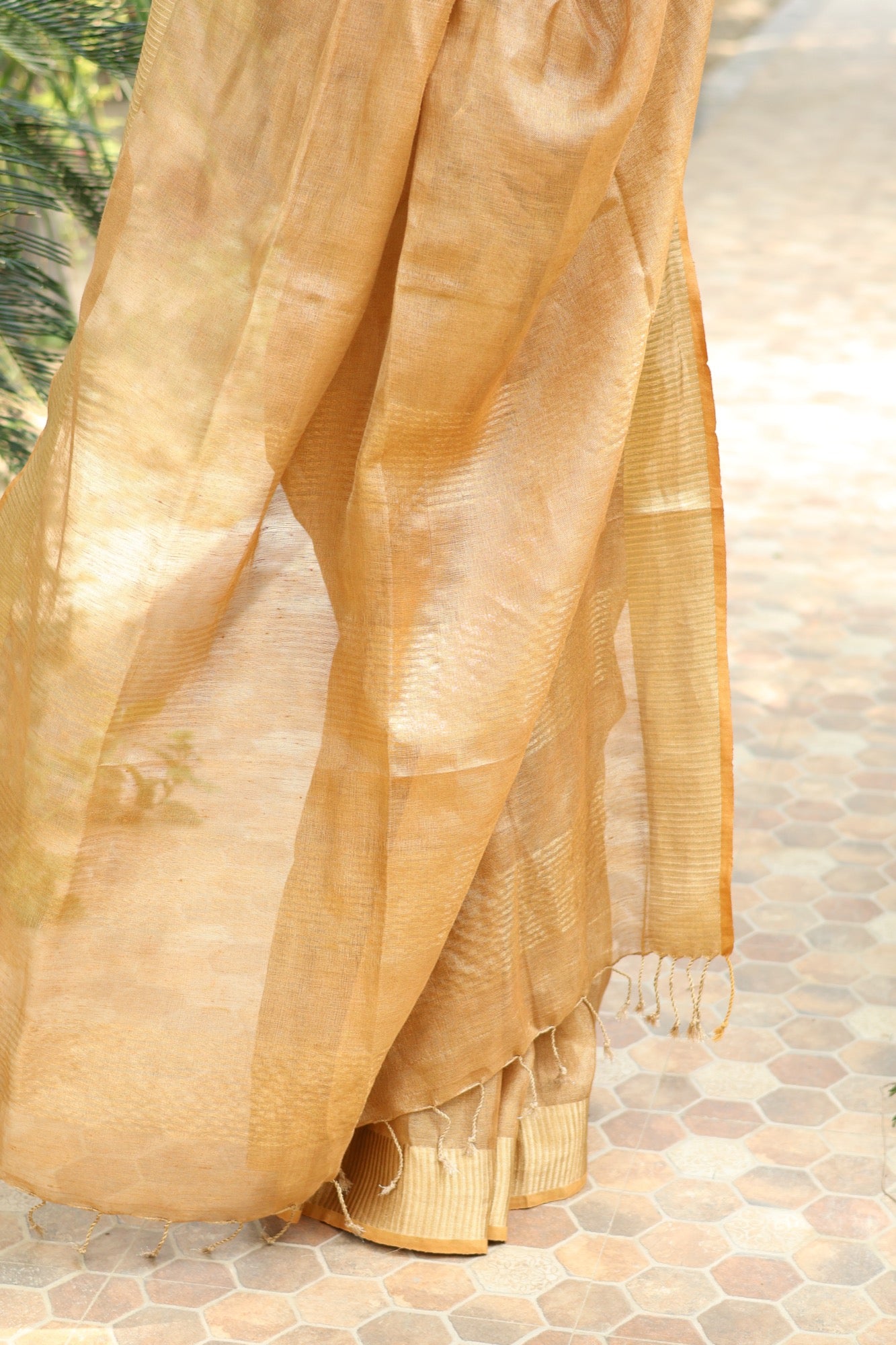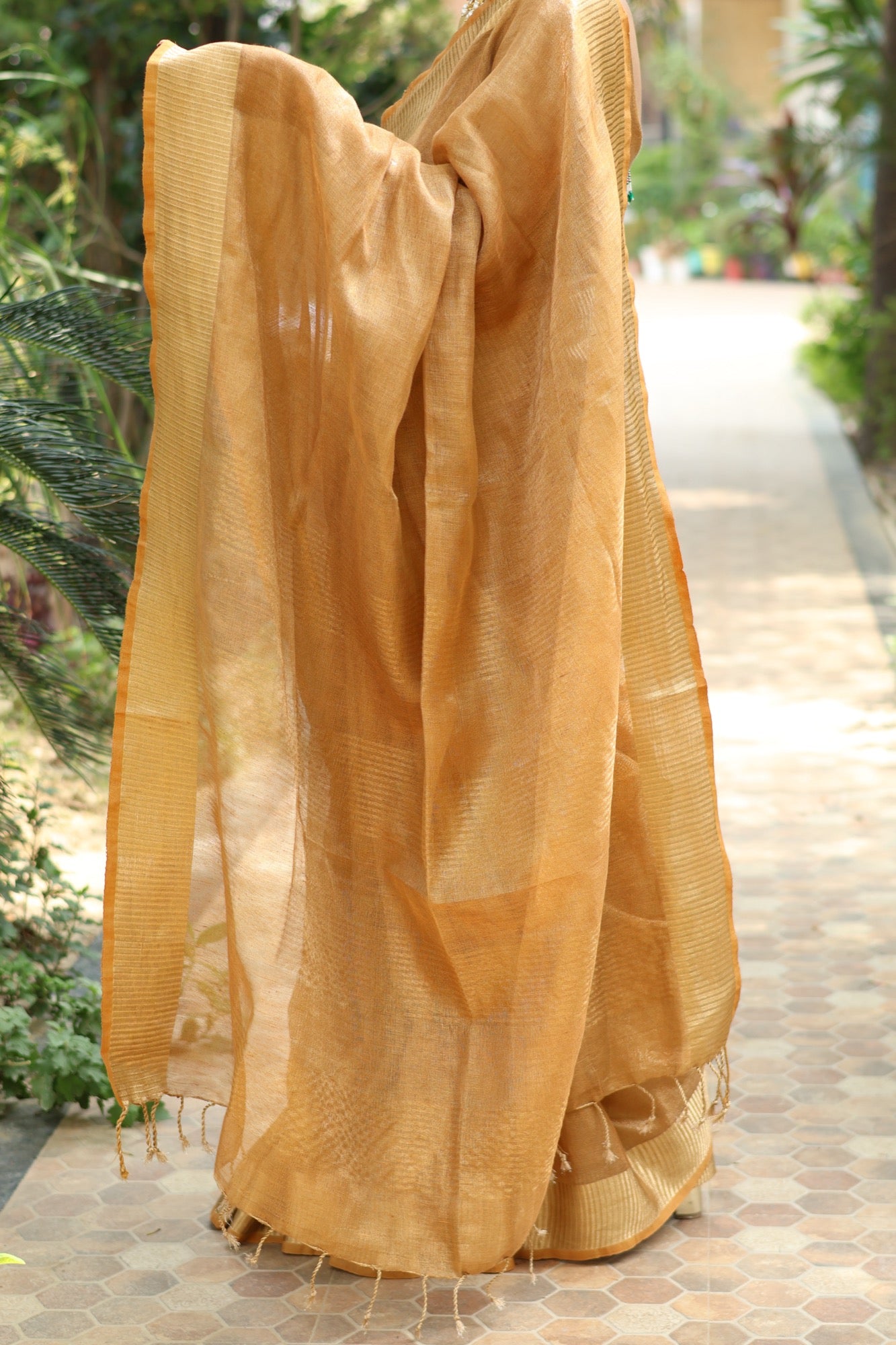 Like melted sunshine on a canvas of bronze, Molten is a luminous celebration of light and grace. This golden-beige tissue linen saree catches the glow of every movement, draping like liquid metal with a subtle shimmer. Its zari stripes and elegant finish make it perfect for festive evenings or intimate celebrations, where you want your style to speak in hushed, refined tones.
