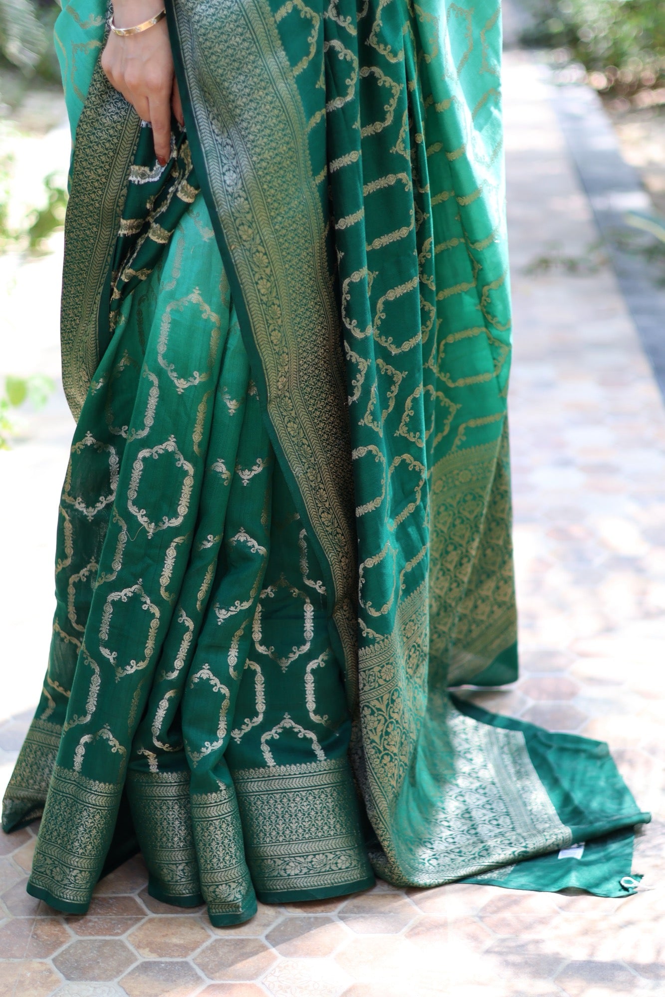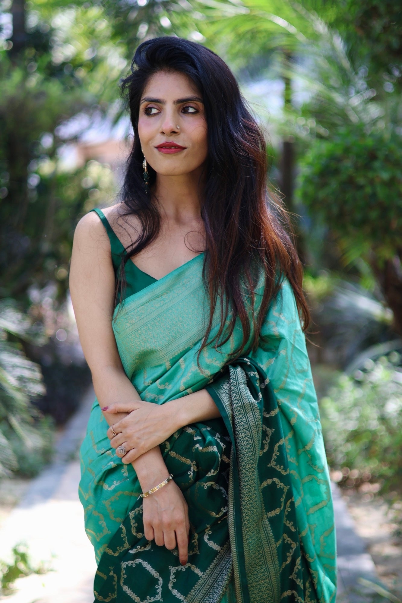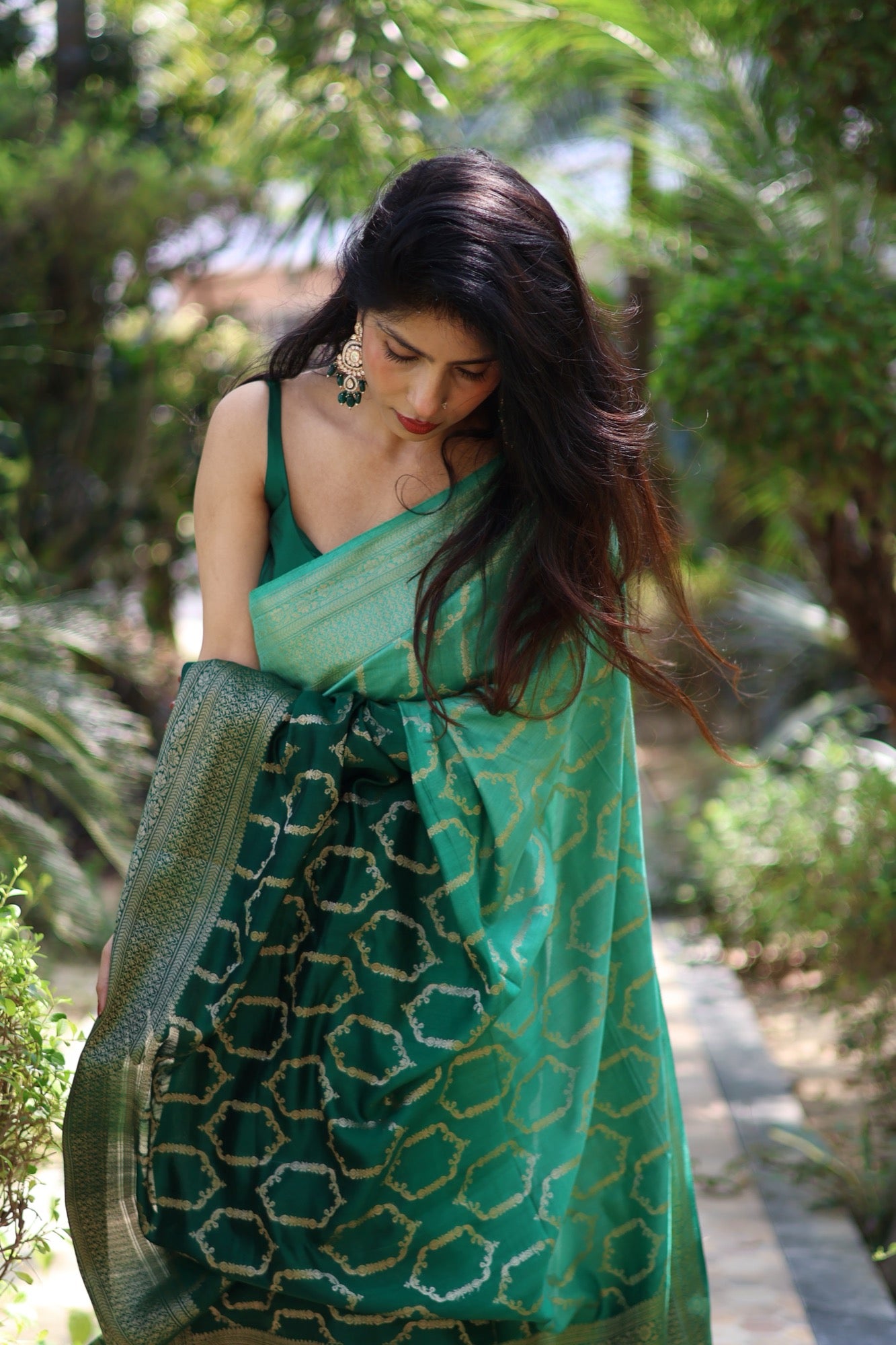 A colour that never tries too hard and a drape that speaks for itself, Morni, this pure Chiniya silk saree is woven in rich jewel-toned green with intricate zari work that catches the light just right. The body carries geometric buttas in a soft gold sheen, leading into a beautifully detailed pallu that feels equal parts festive and graceful.