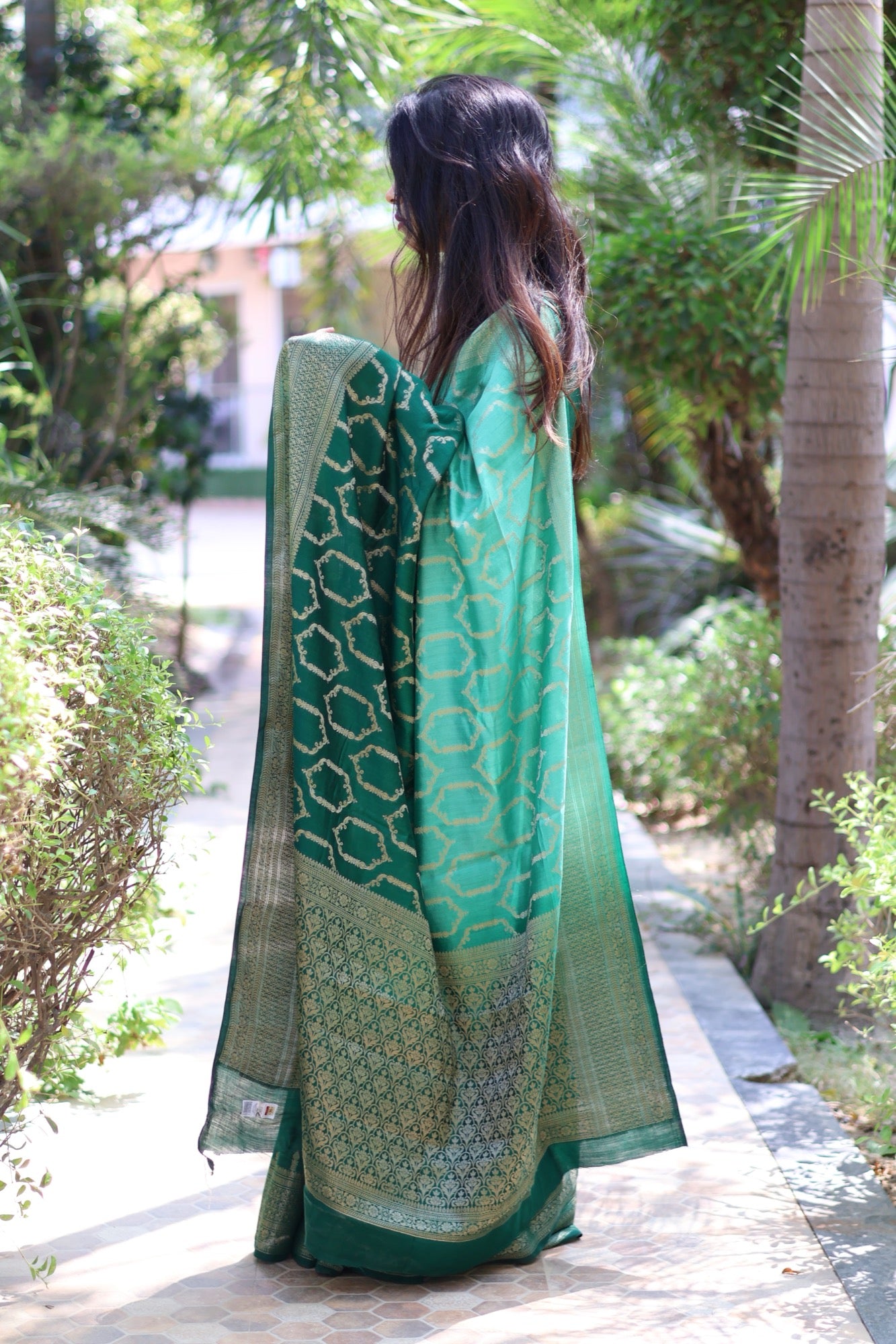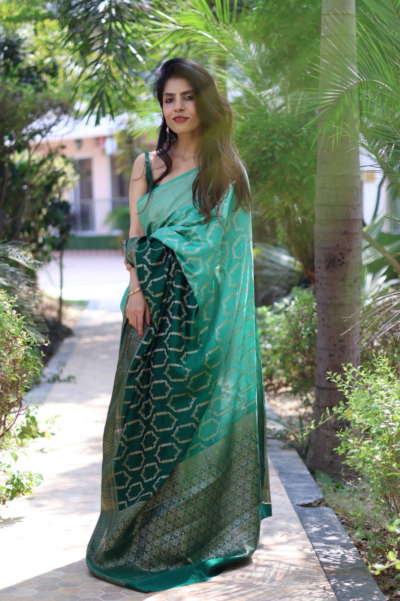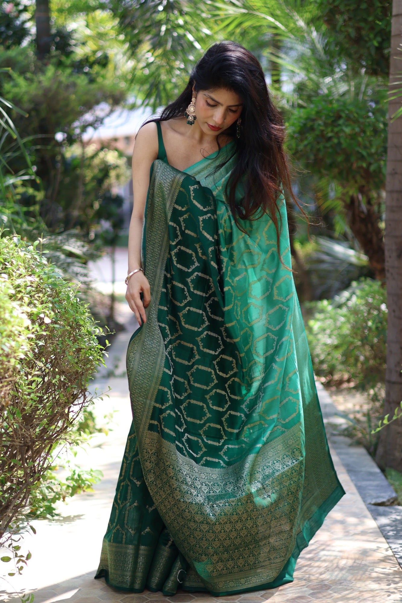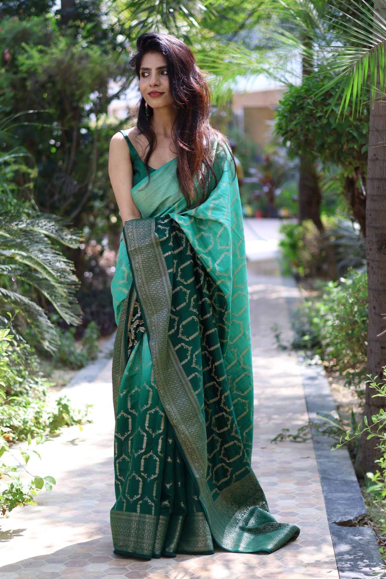 A colour that never tries too hard and a drape that speaks for itself, Morni, this pure Chiniya silk saree is woven in rich jewel-toned green with intricate zari work that catches the light just right. The body carries geometric buttas in a soft gold sheen, leading into a beautifully detailed pallu that feels equal parts festive and graceful.