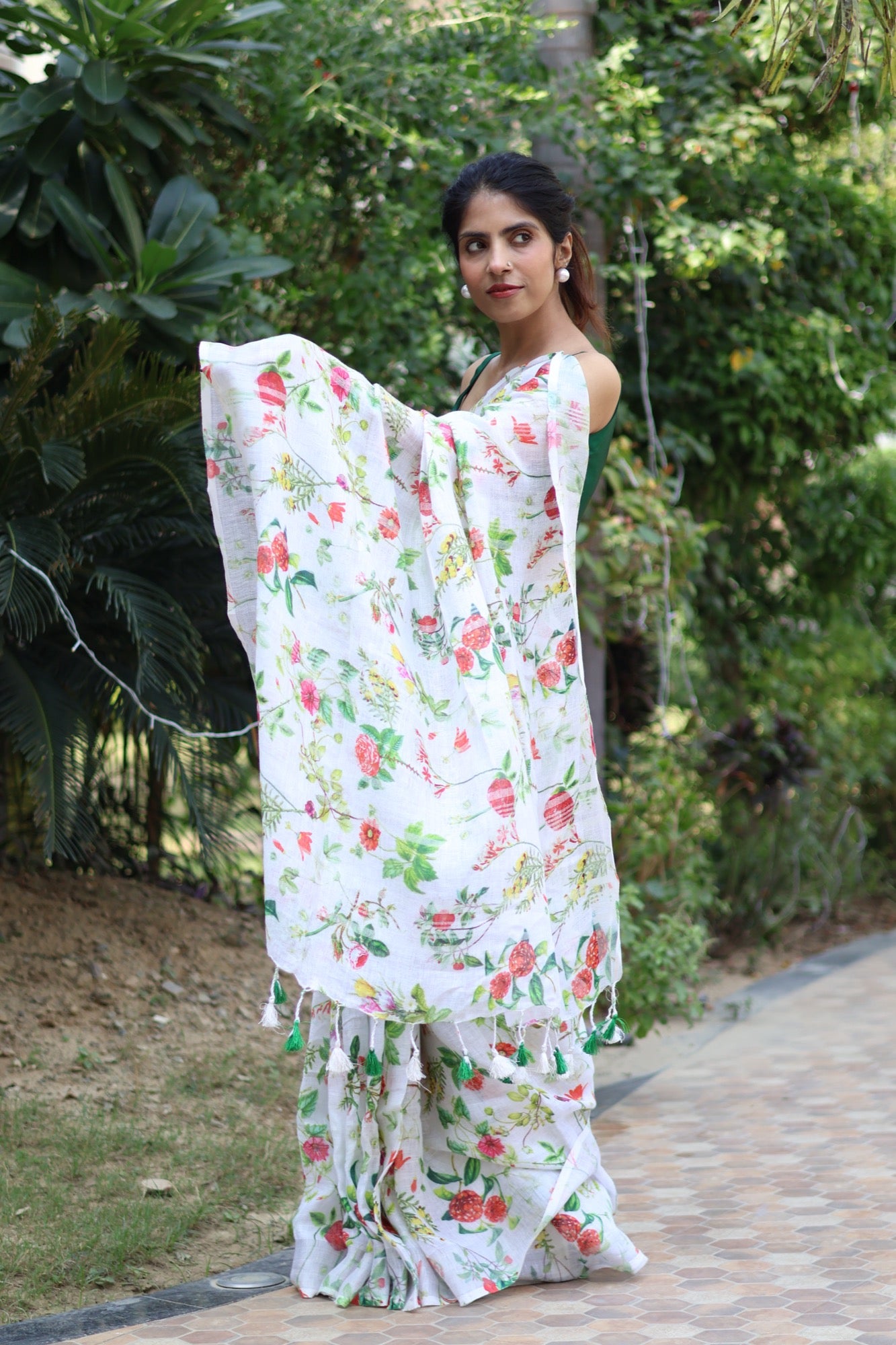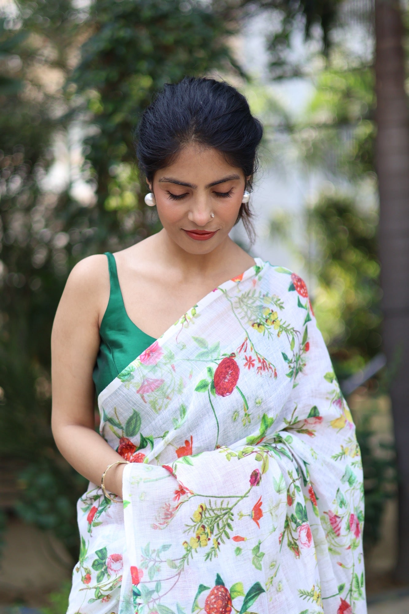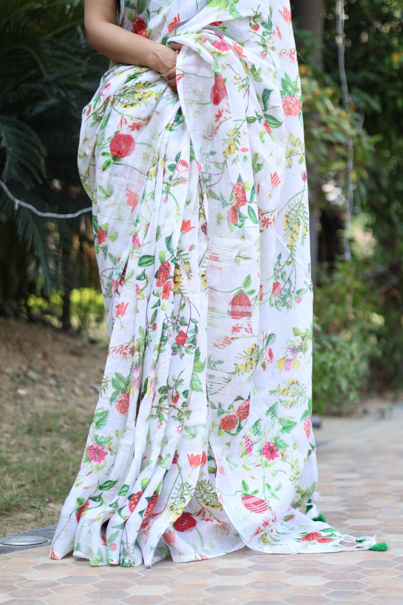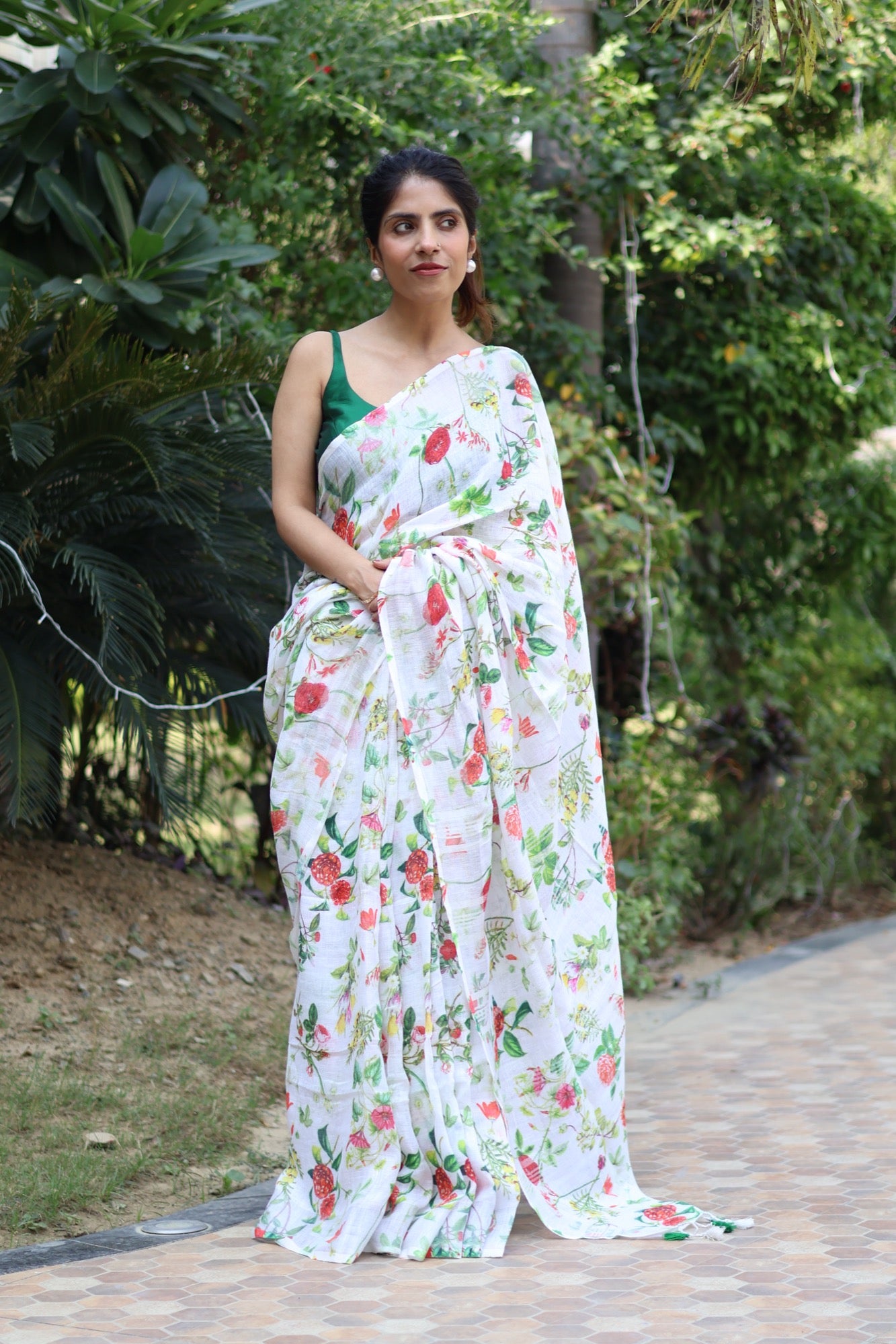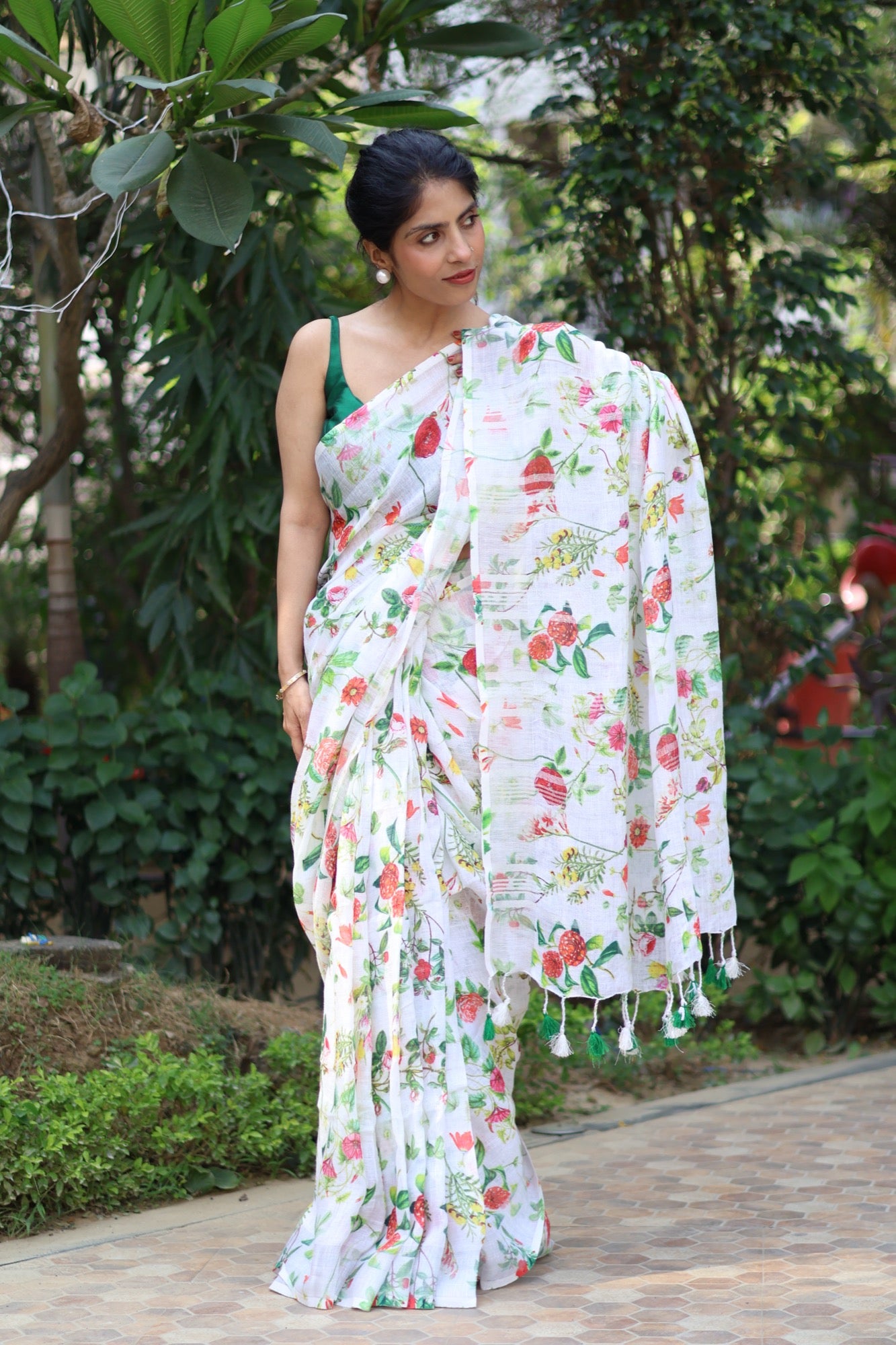 A canvas of colors, a tapestry of dreams. Mural captures the playful spirit of watercolor strokes splashed across pure linen, creating a mosaic of joy and vibrance. With hints of teal, olive, ochre, and pink, this saree is a celebration of art and life, perfect for days when you want to wear a painting and feel like a masterpiece.