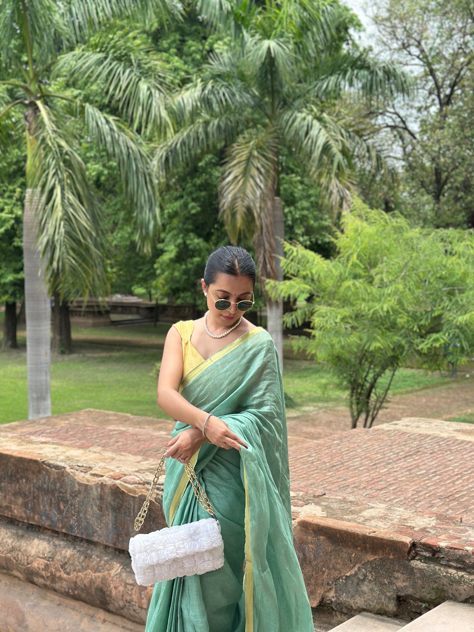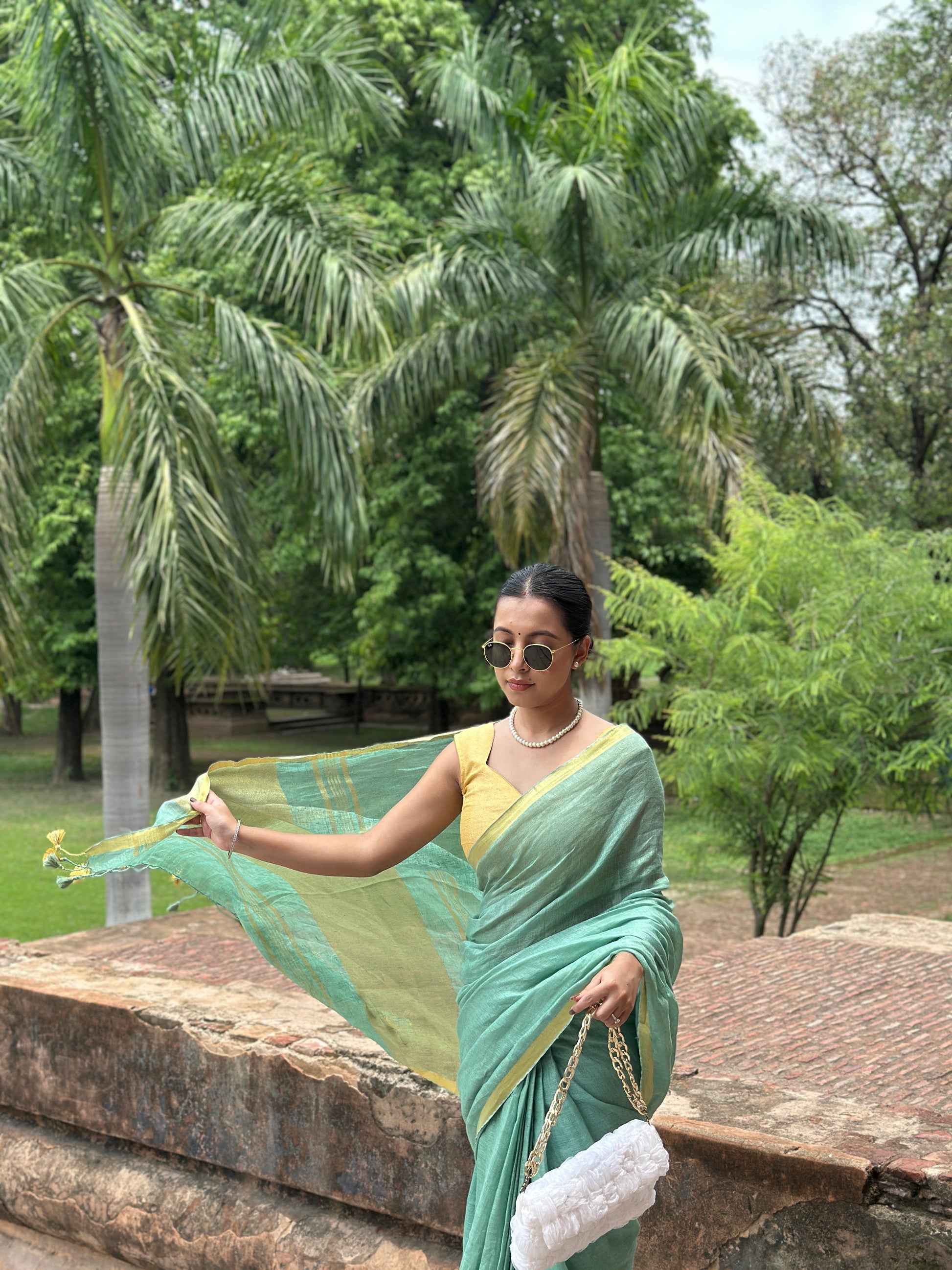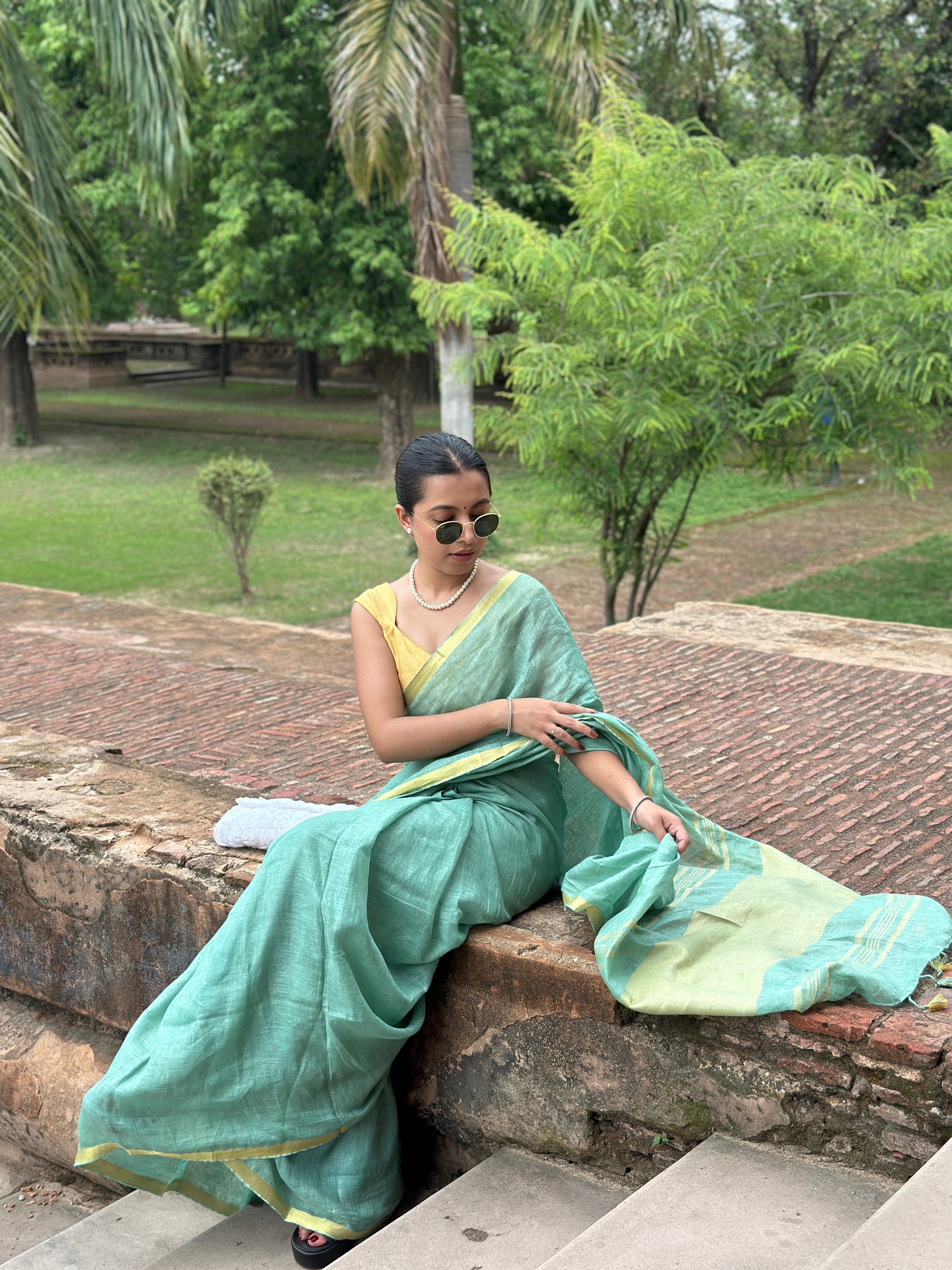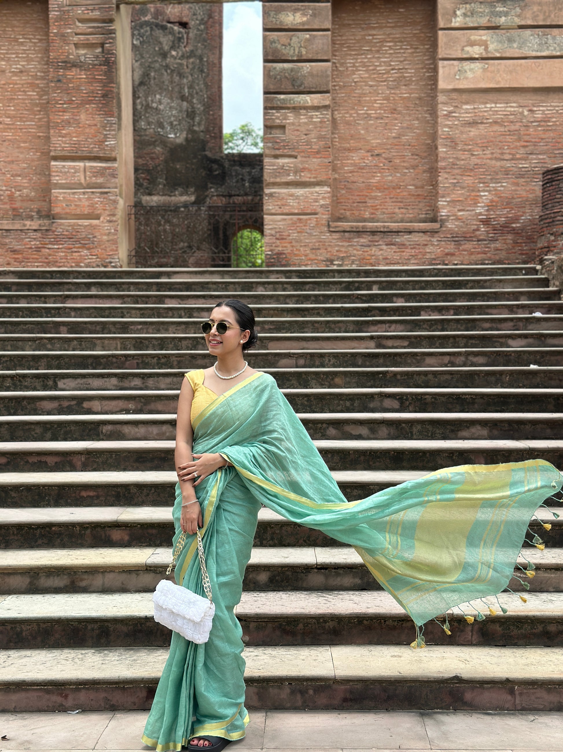 Soft as morning mist, this mint green pure linen saree carries a fresh, airy charm. Its subtle silver border and delicate tassels whisper elegance with every sway. Perfect for sunlit brunches, garden parties, or quiet days when you want to feel wrapped in serenity.