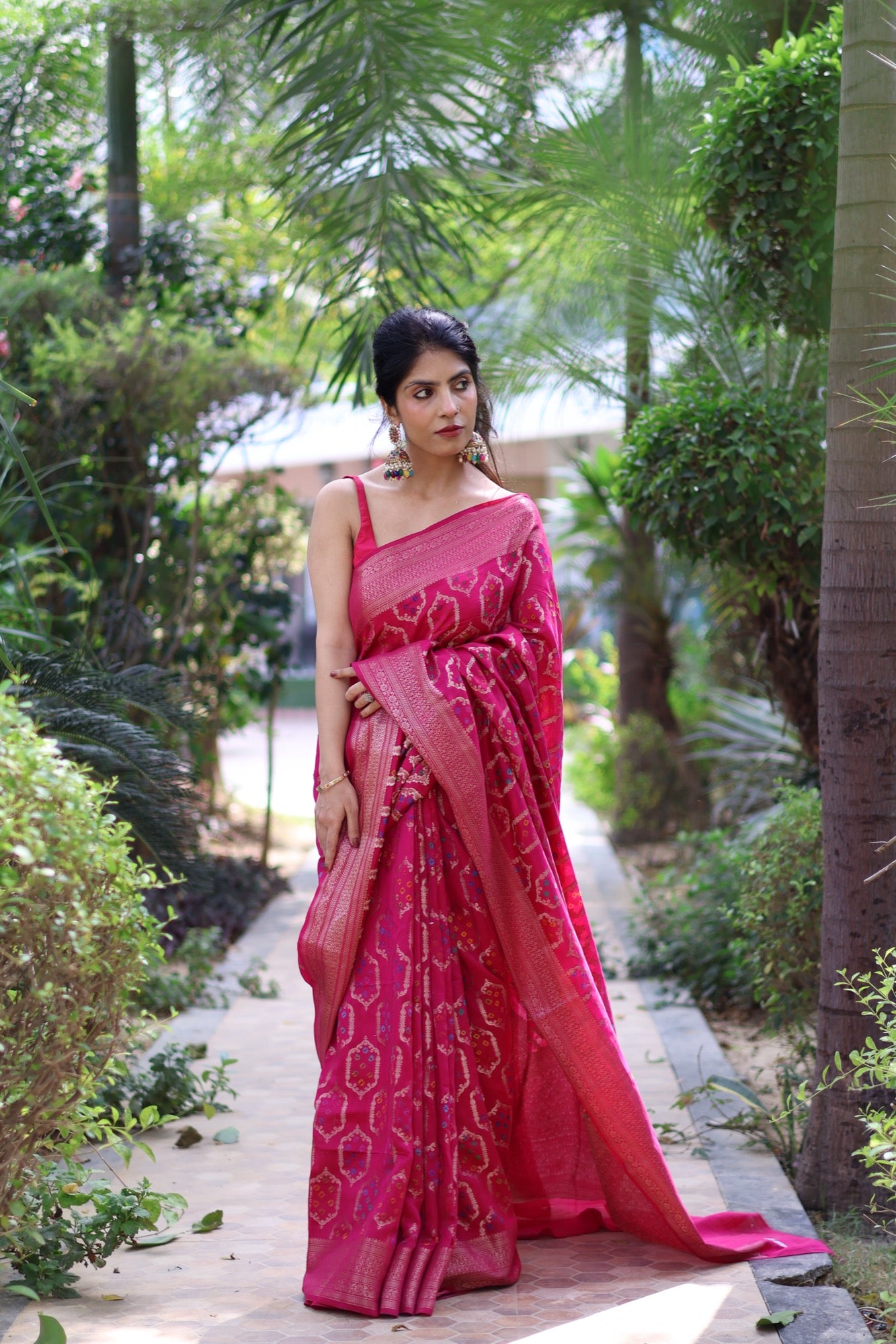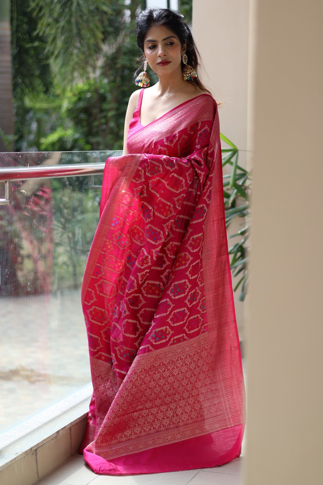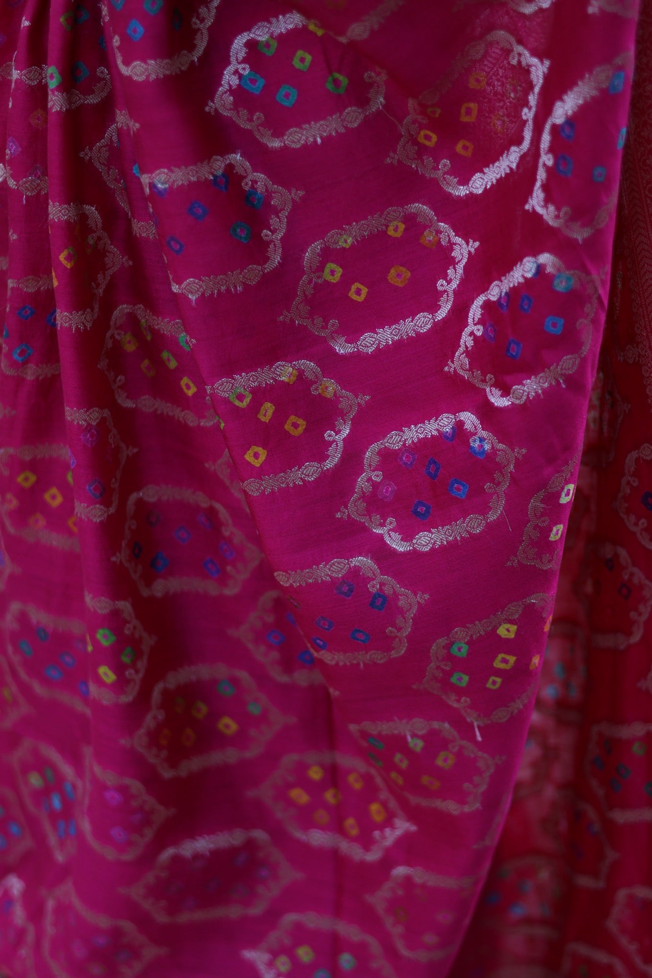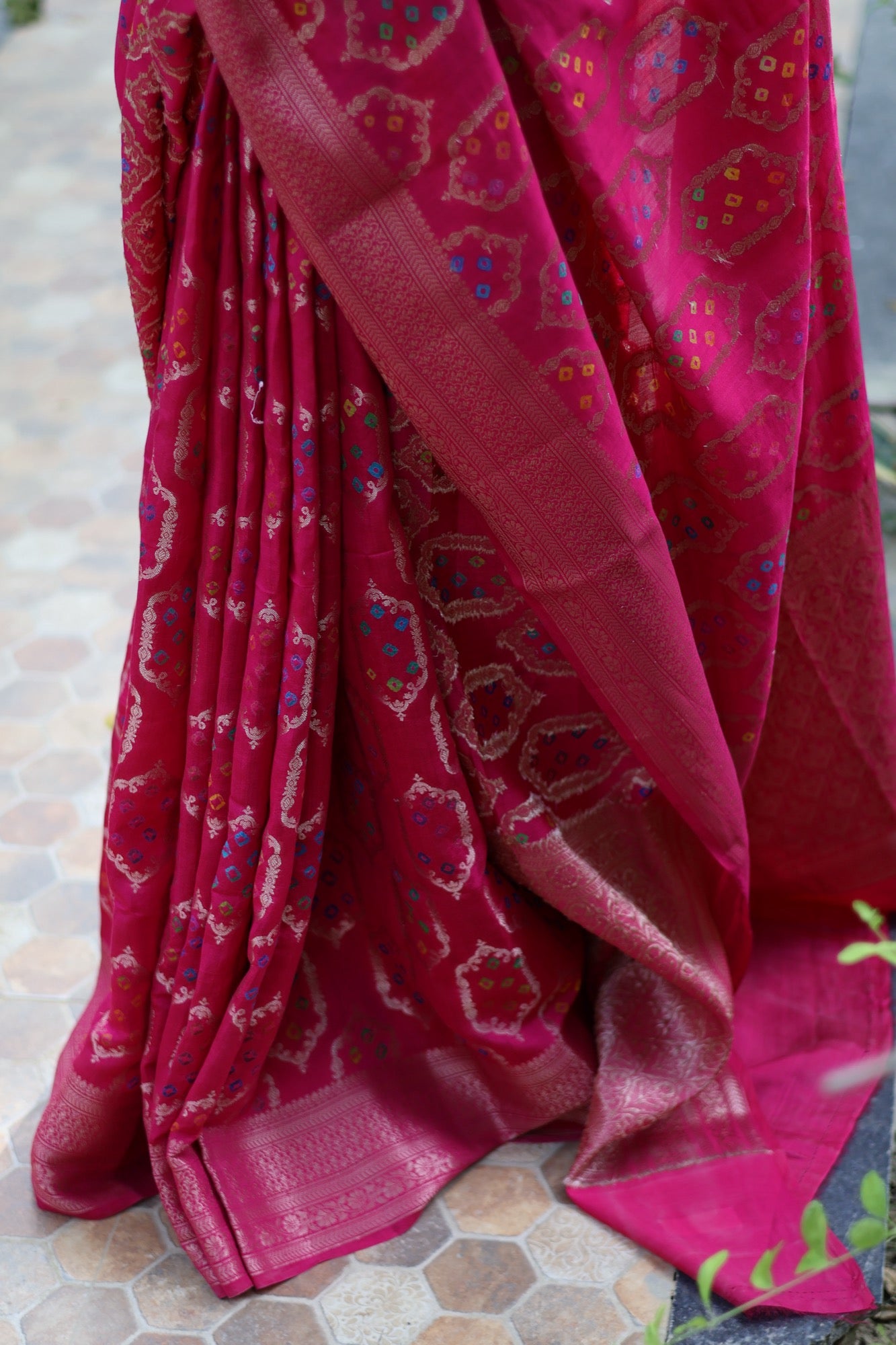 Where Banaras meets Bandhani Noorja celebrates the brilliance of Chiniya silk in a radiant rani pink hue. The saree features intricate Bandhani-inspired motifs woven into the fabric, framed by rich Banarasi zari borders that shimmer with every fold. Its soft yet structured drape makes it perfect for weddings, festive evenings, and moments that call for effortless opulence.