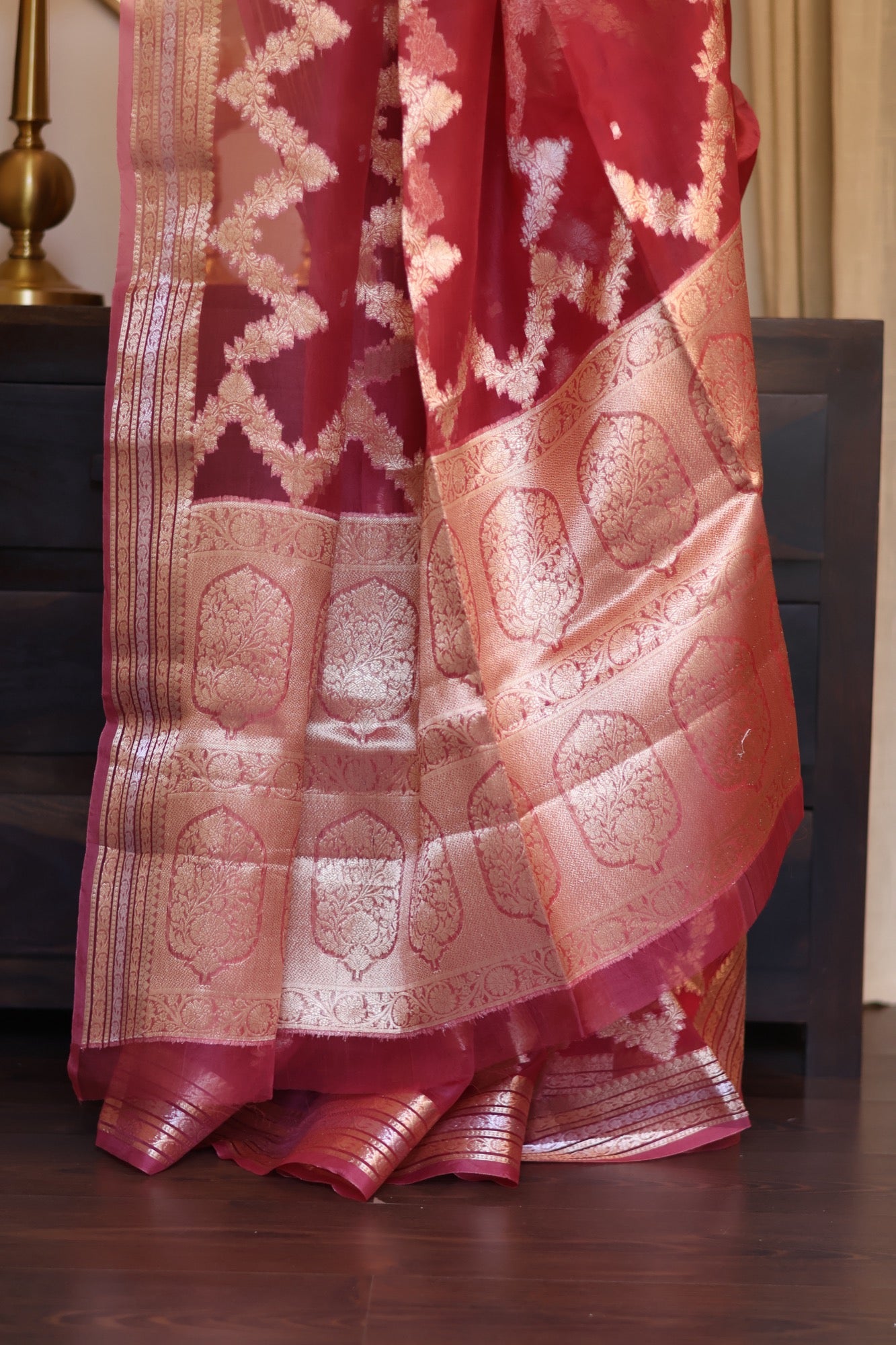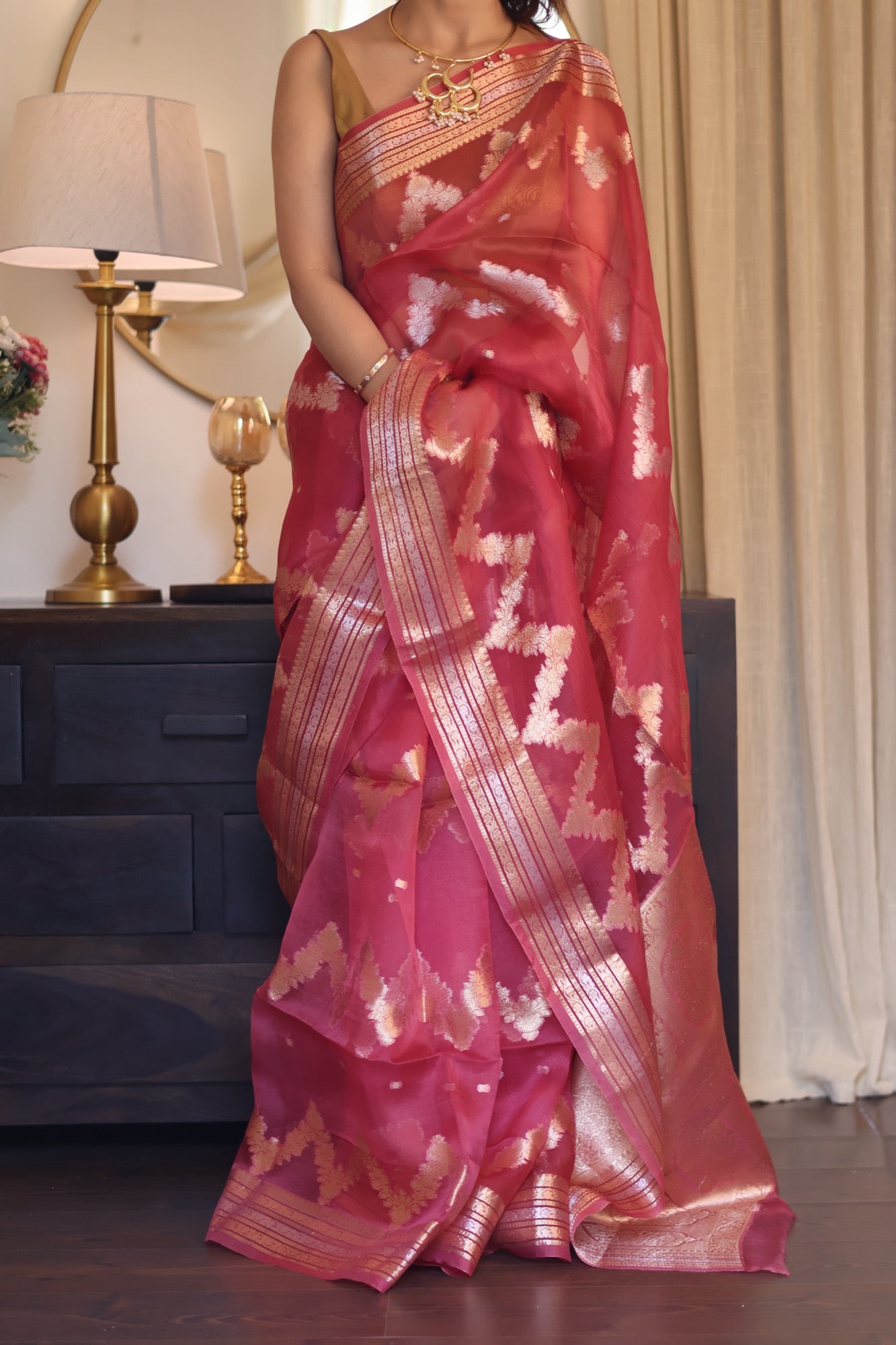 A saree that feels like a story from another Paan is woven in pure Banarasi kora silk, kissed with zari vines that shimmer like poetry on a rose canvas. Ethereal, weightless, and steeped in quiet opulence, it’s a piece that celebrates the grandeur of Banaras with the delicacy of a whisper.