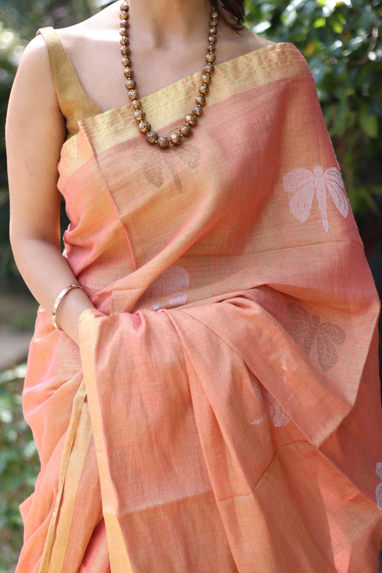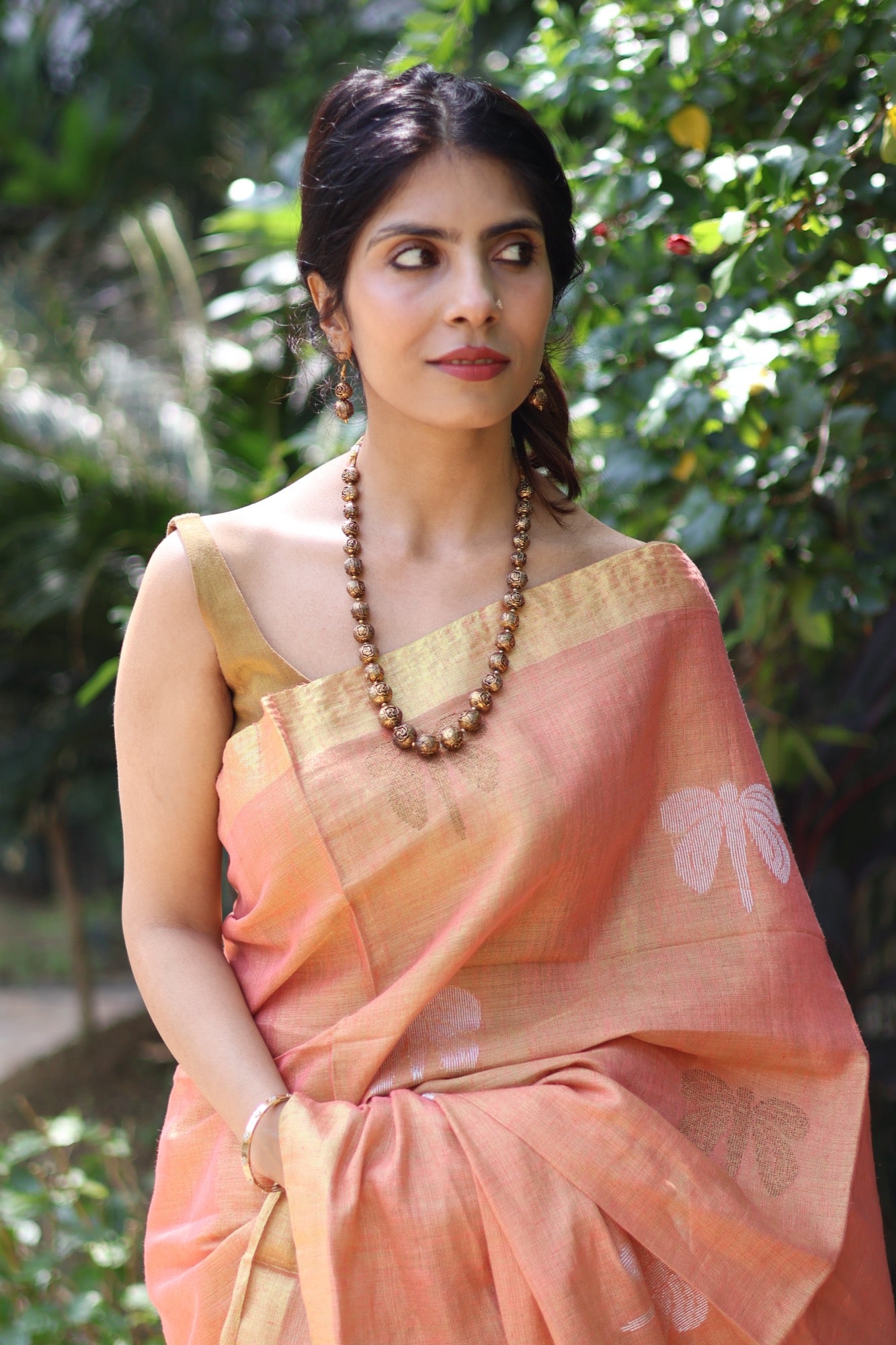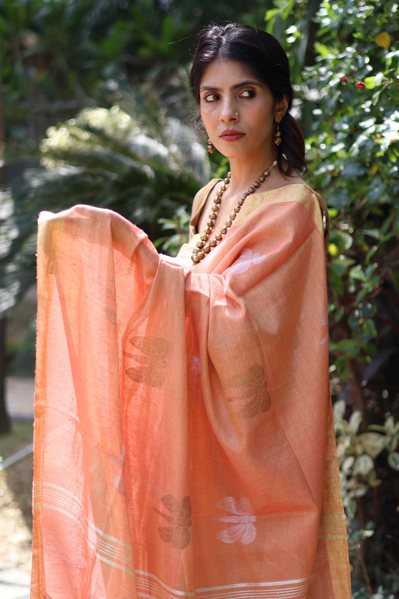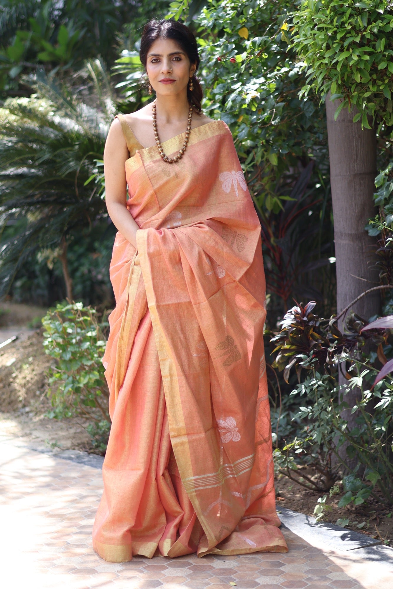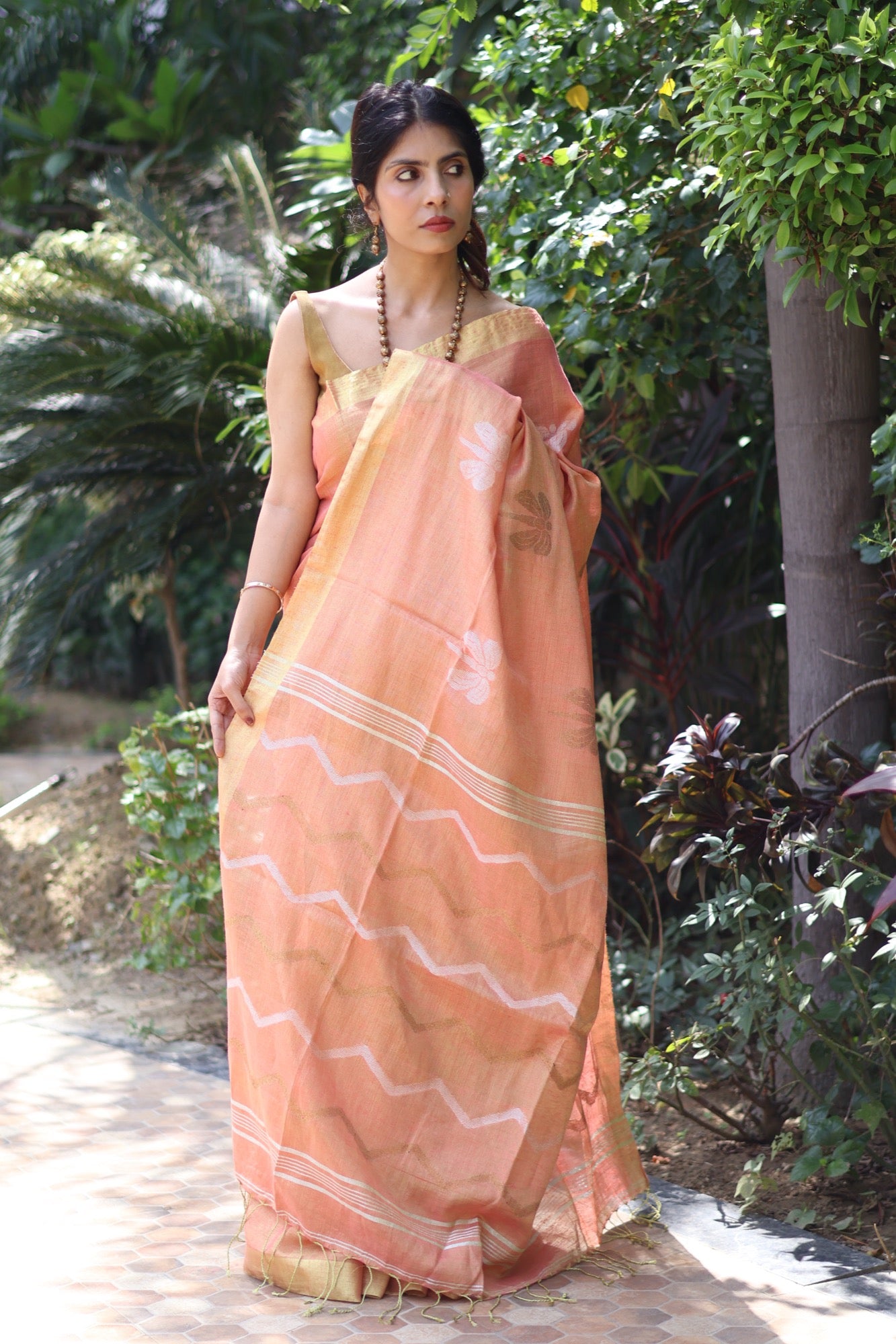 Soft as dawn and luminous as silk Papaya is a Banarasi tissue linen saree in a gentle peach hue, woven with zari motifs that glisten in sunlight. Its pastel warmth and featherlight drape make it perfect for day weddings, haldi mornings, or any moment that calls for effortless radiance.