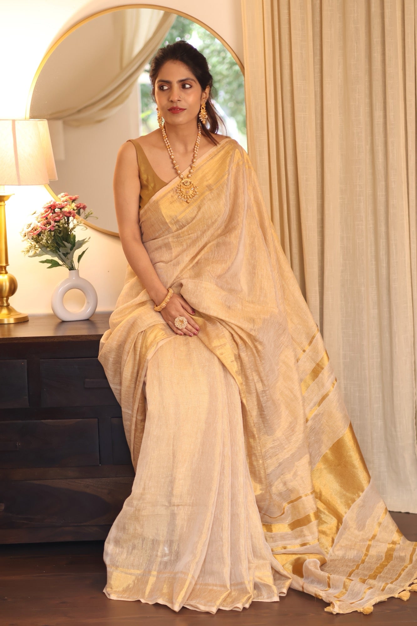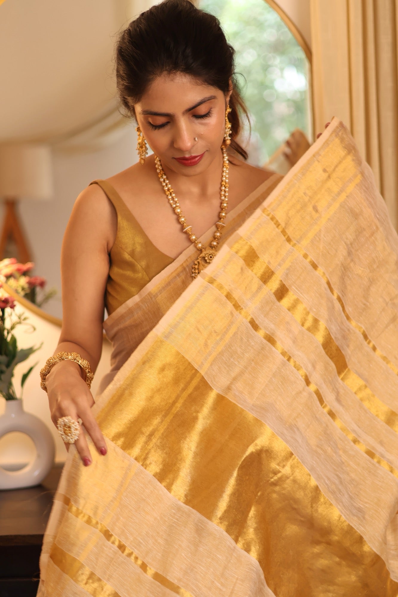 Soft ivory-beige tissue linen, brushed with warm gold, Umrao carries a kind of elegance that lingers rather than announces itself. Light, fluid, and finished with a delicate zari edge, this saree is for moments steeped in tradition — wedding mornings, intimate rituals, and evenings where silence speaks louder than sparkle.