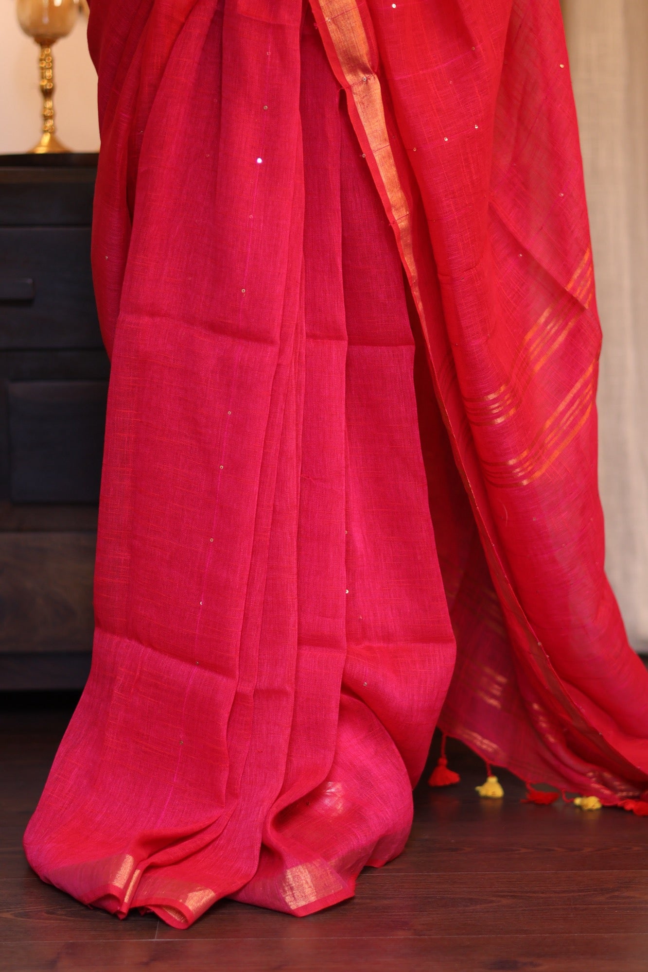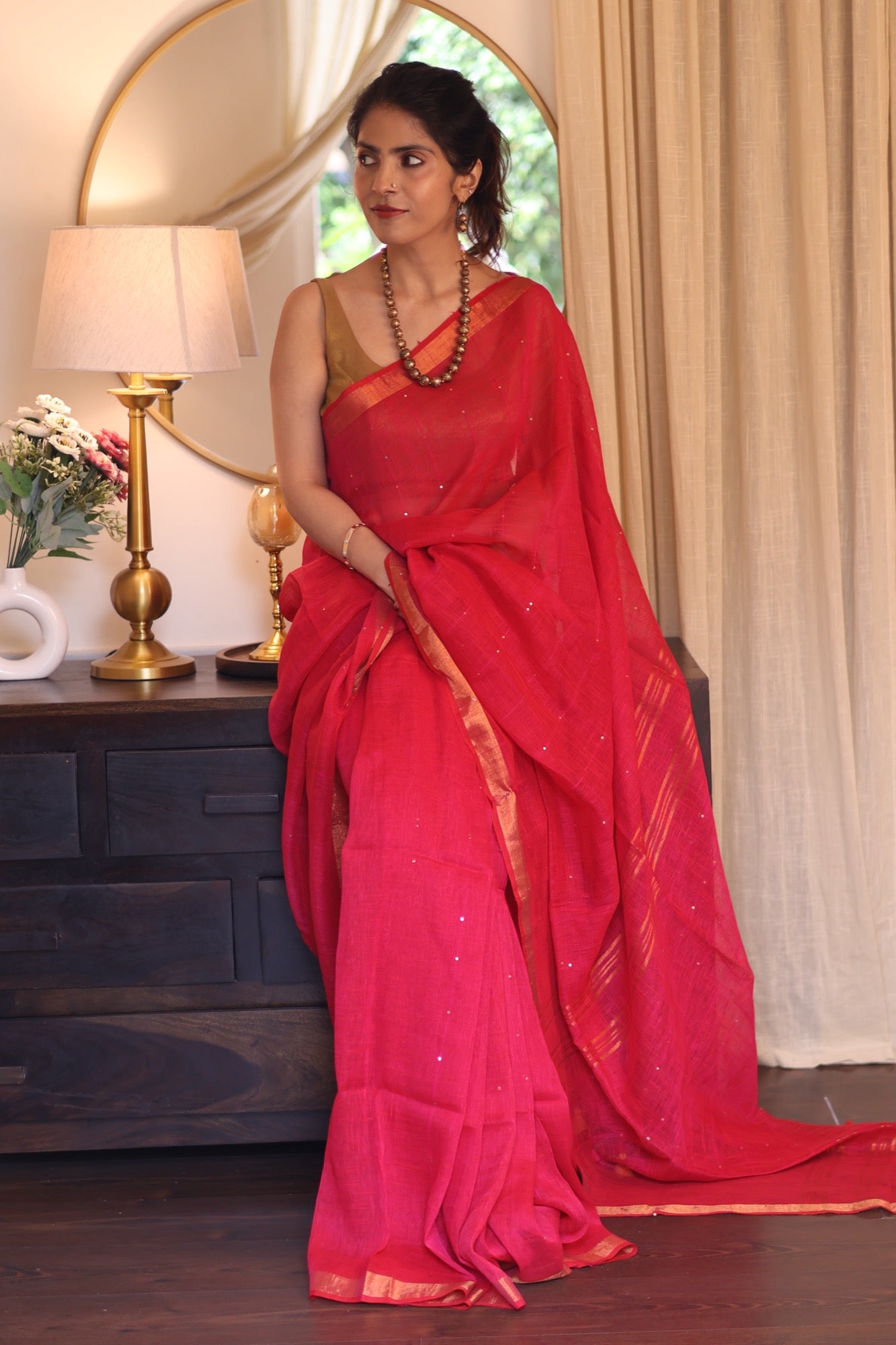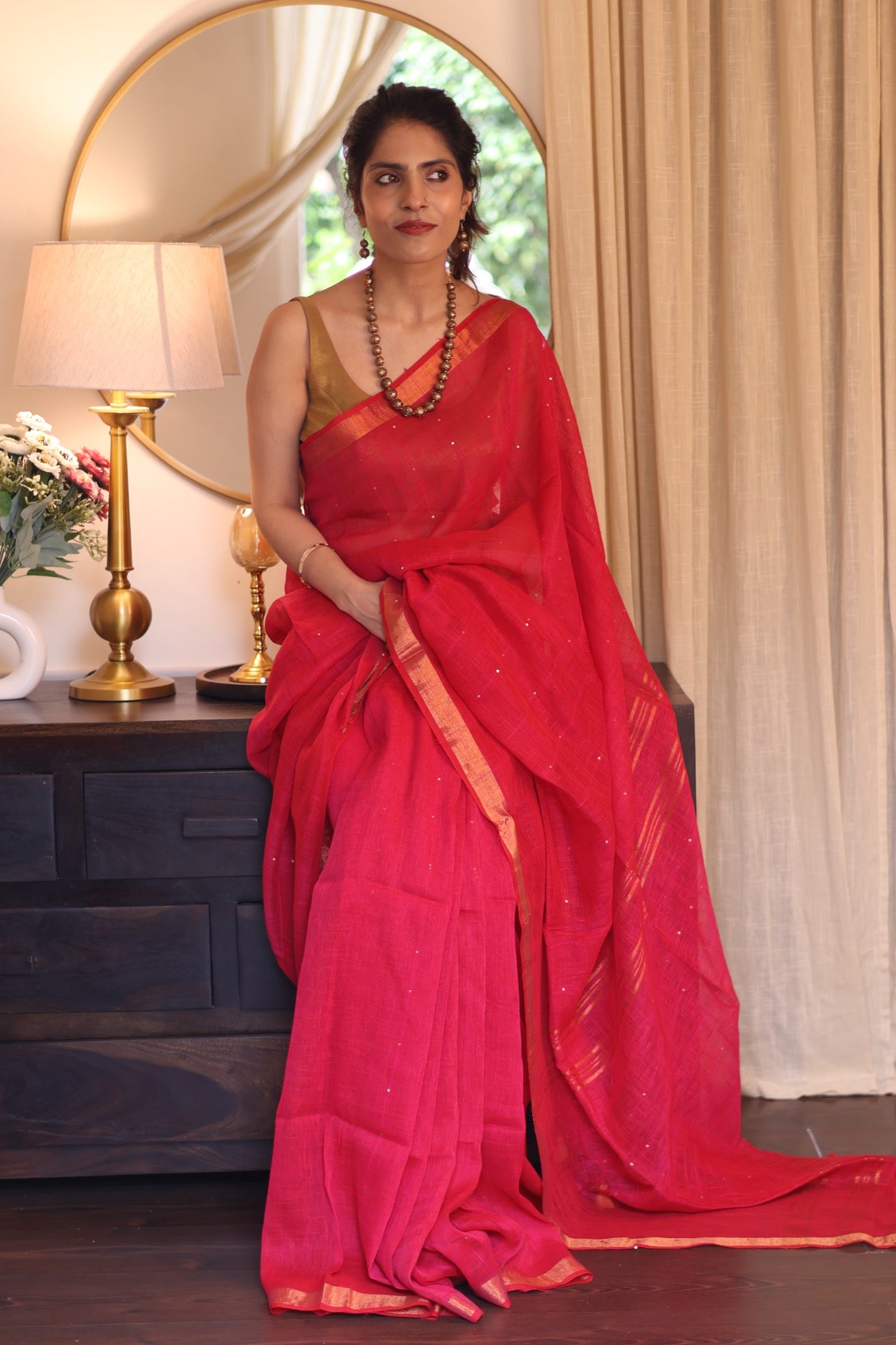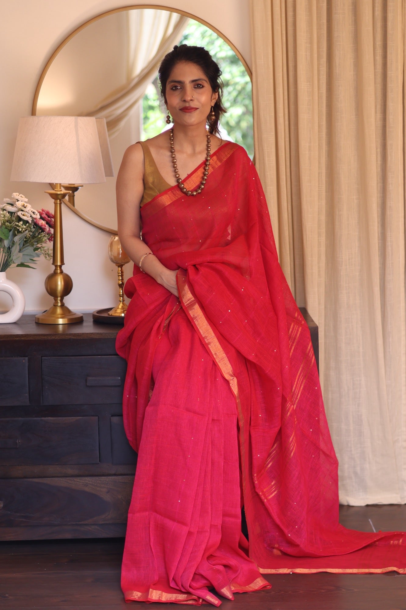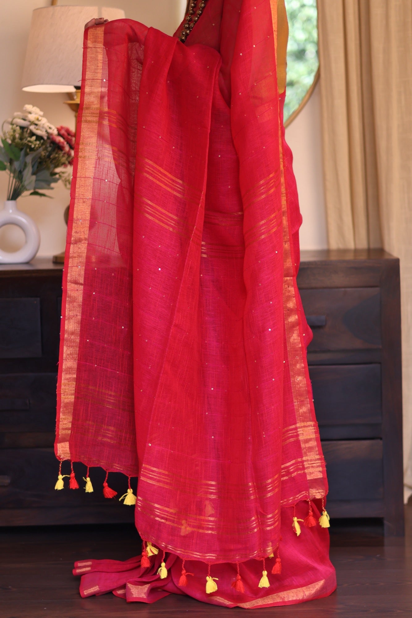 Fresh, fierce, and full of joy Pink Pulse captures the spirit of modern celebrations. This pure linen handloom saree comes in a lively pink hue, accented with delicate sequin work that adds a subtle shimmer with every move. The warm zari border lends a classic touch, while the playful red and yellow tassels bring in a dash of cheer.