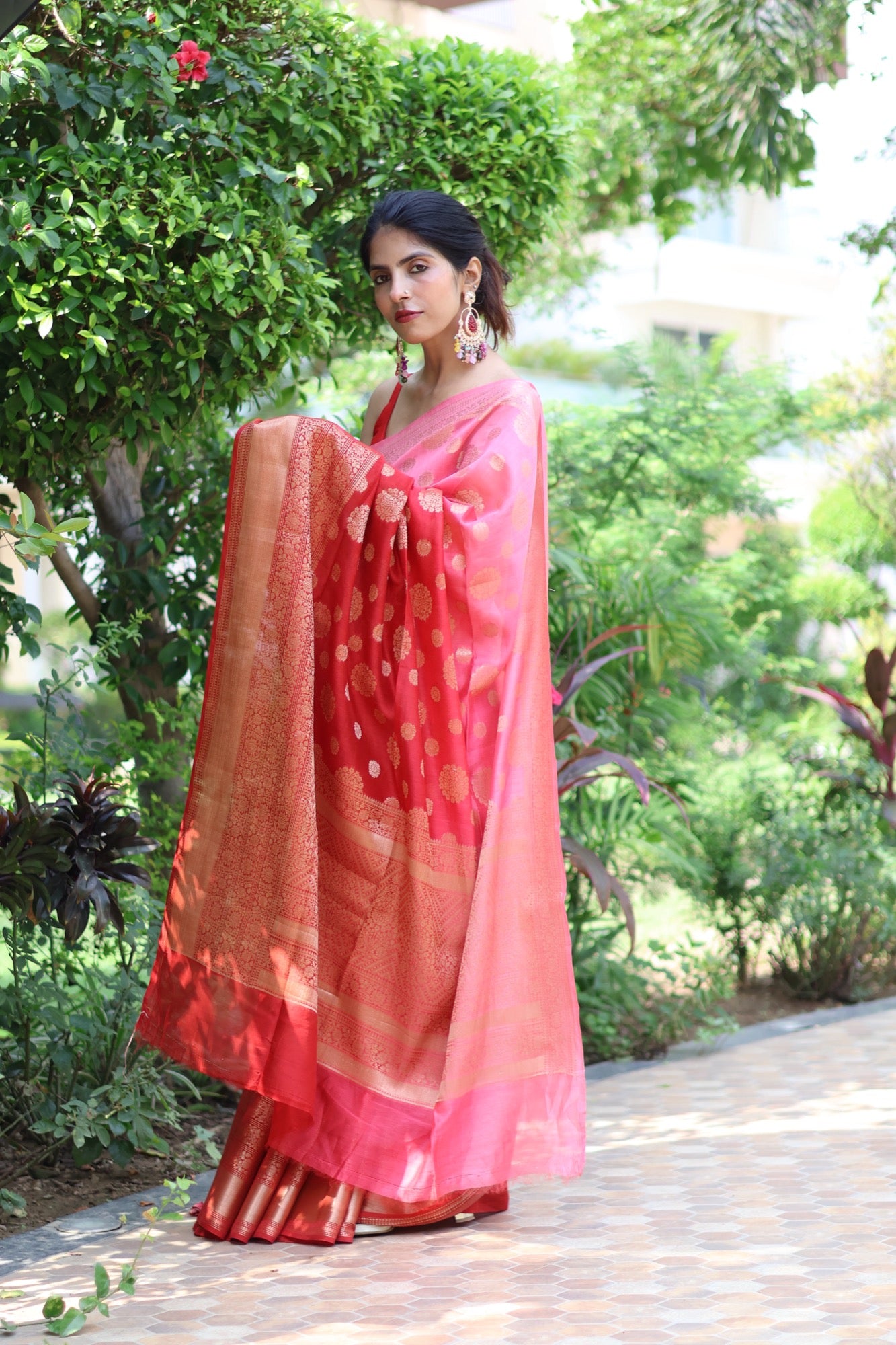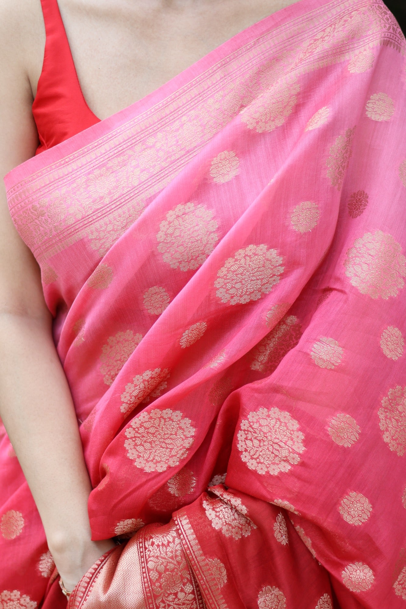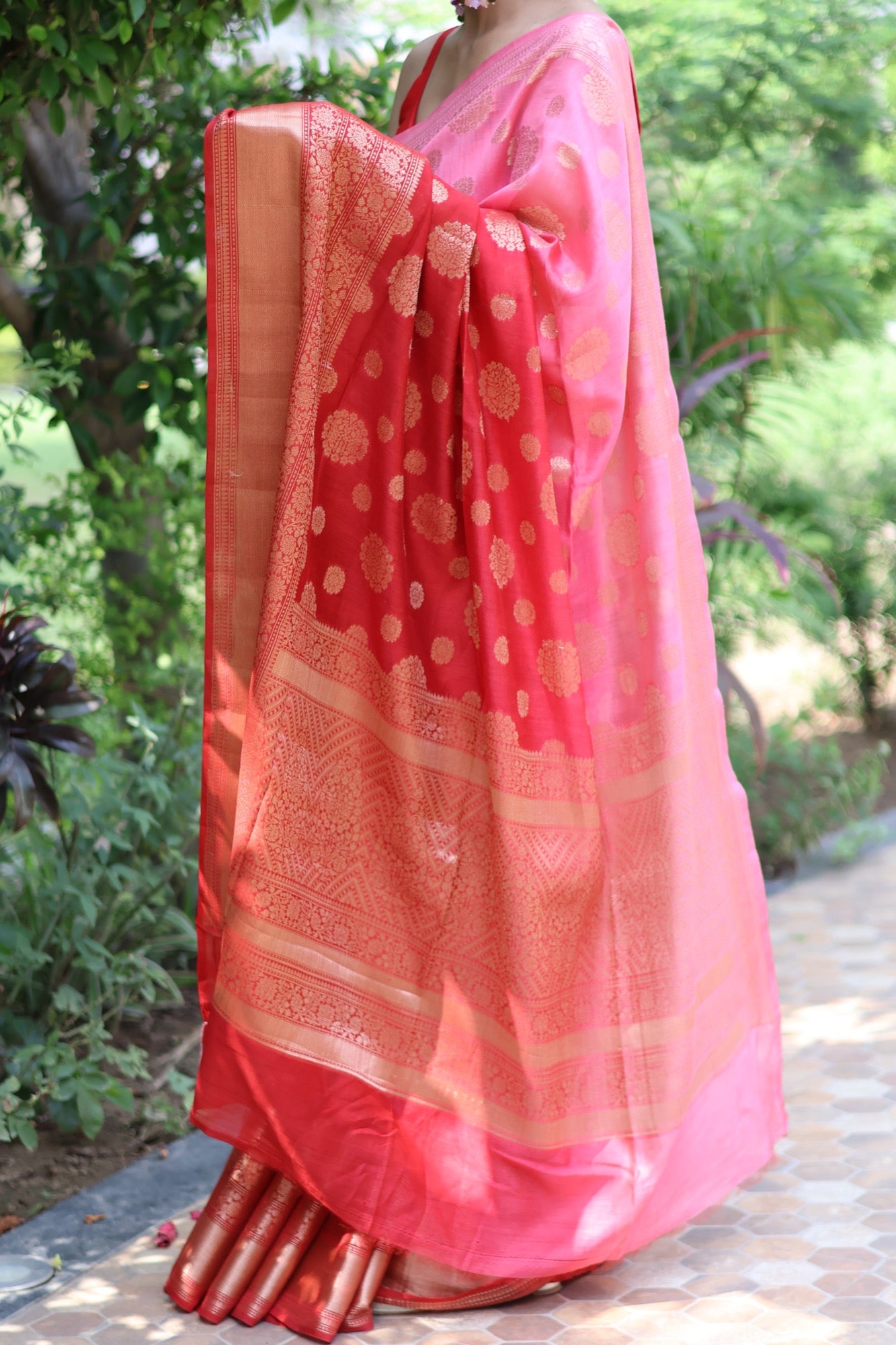 A saree that feels like a festive sunrise Raima is crafted in pure Banarasi Chanderi silk, merging the softness of pink with the depth of red. The fabric’s gossamer texture glimmers with delicate golden zari butis, while its sheen captures the play of light and celebration. Lightweight, breathable, and innately regal, Raima is perfect for wedding mornings, pujas, or family festivities that call for understated grandeur.