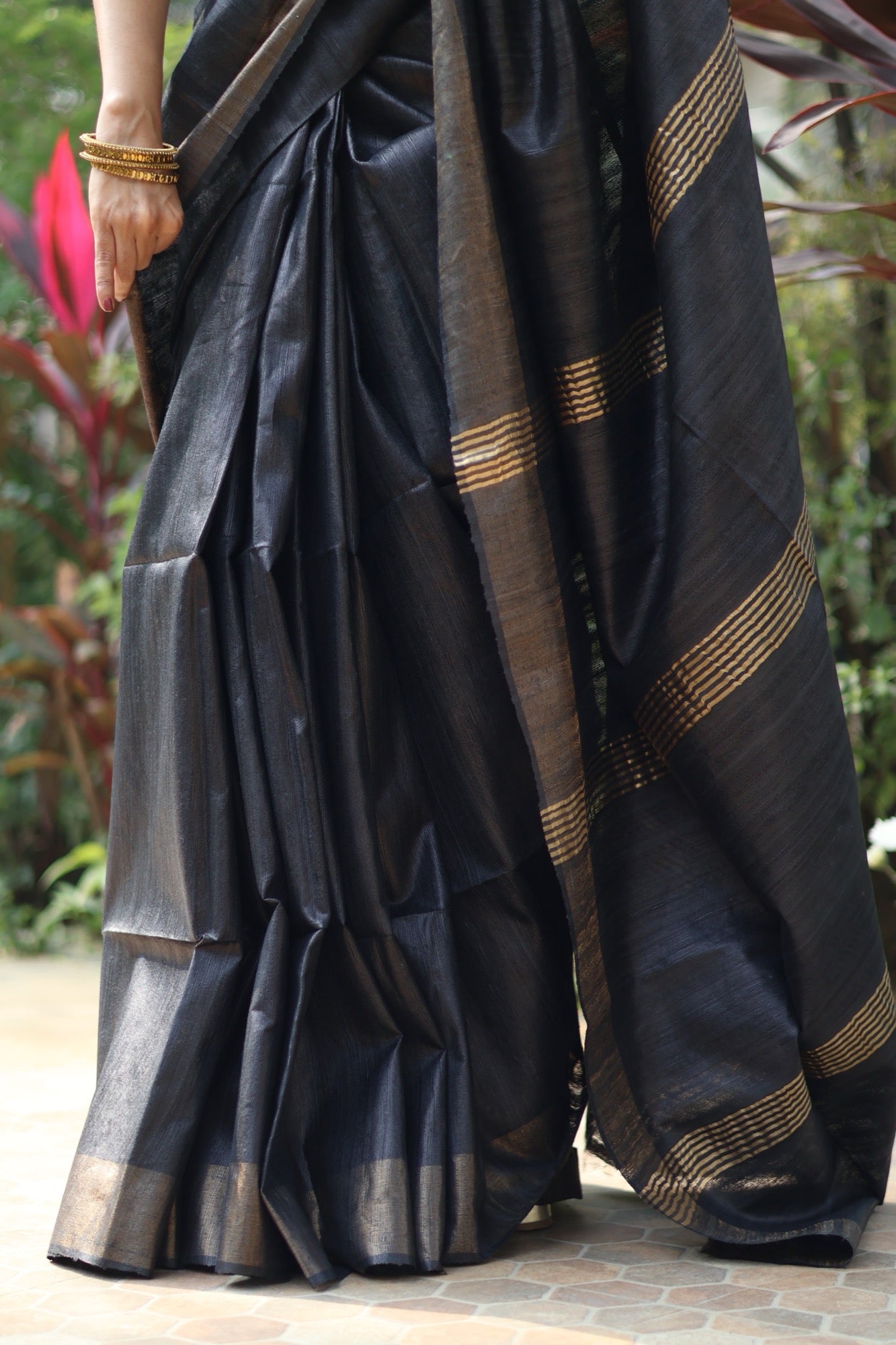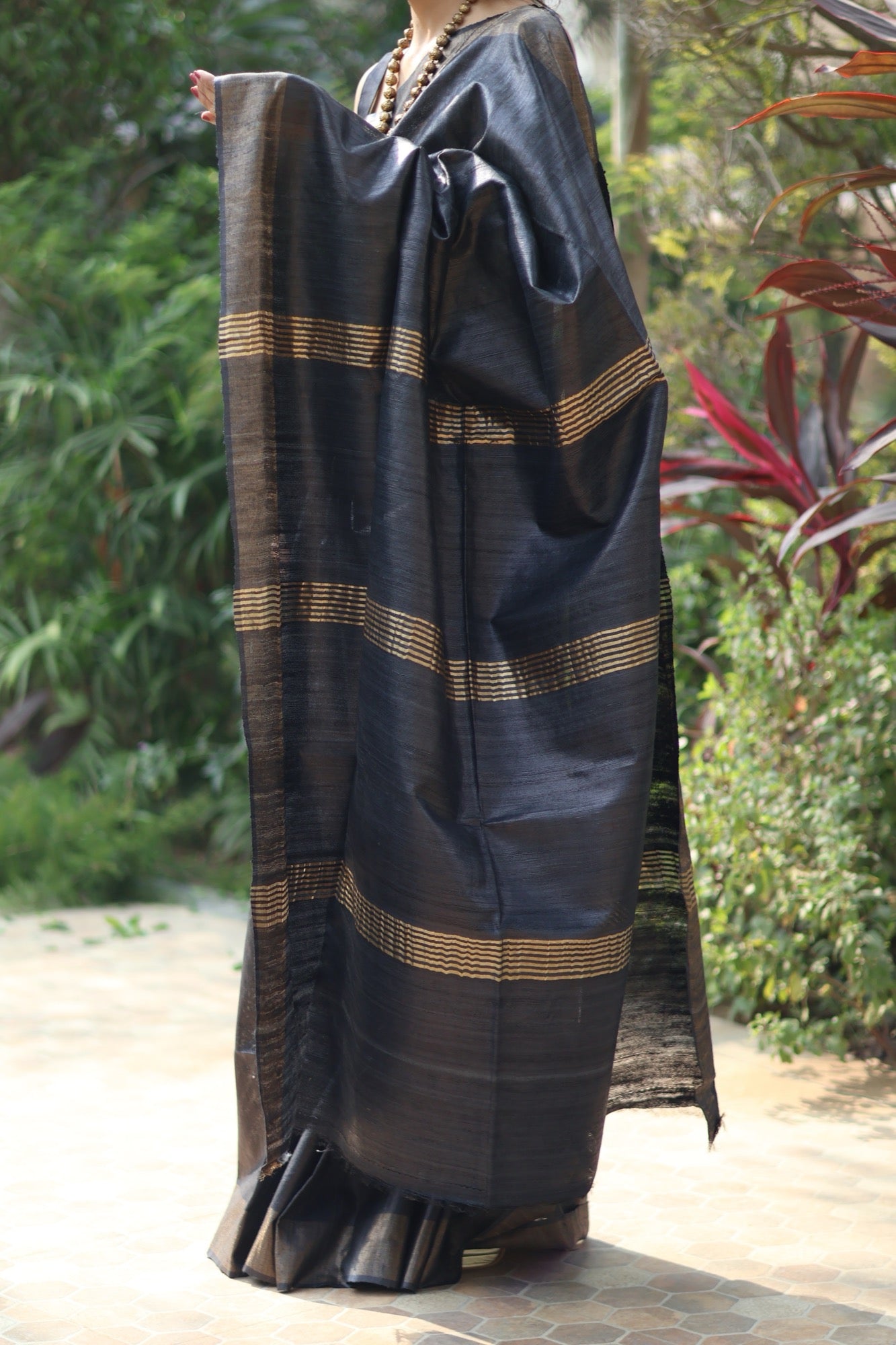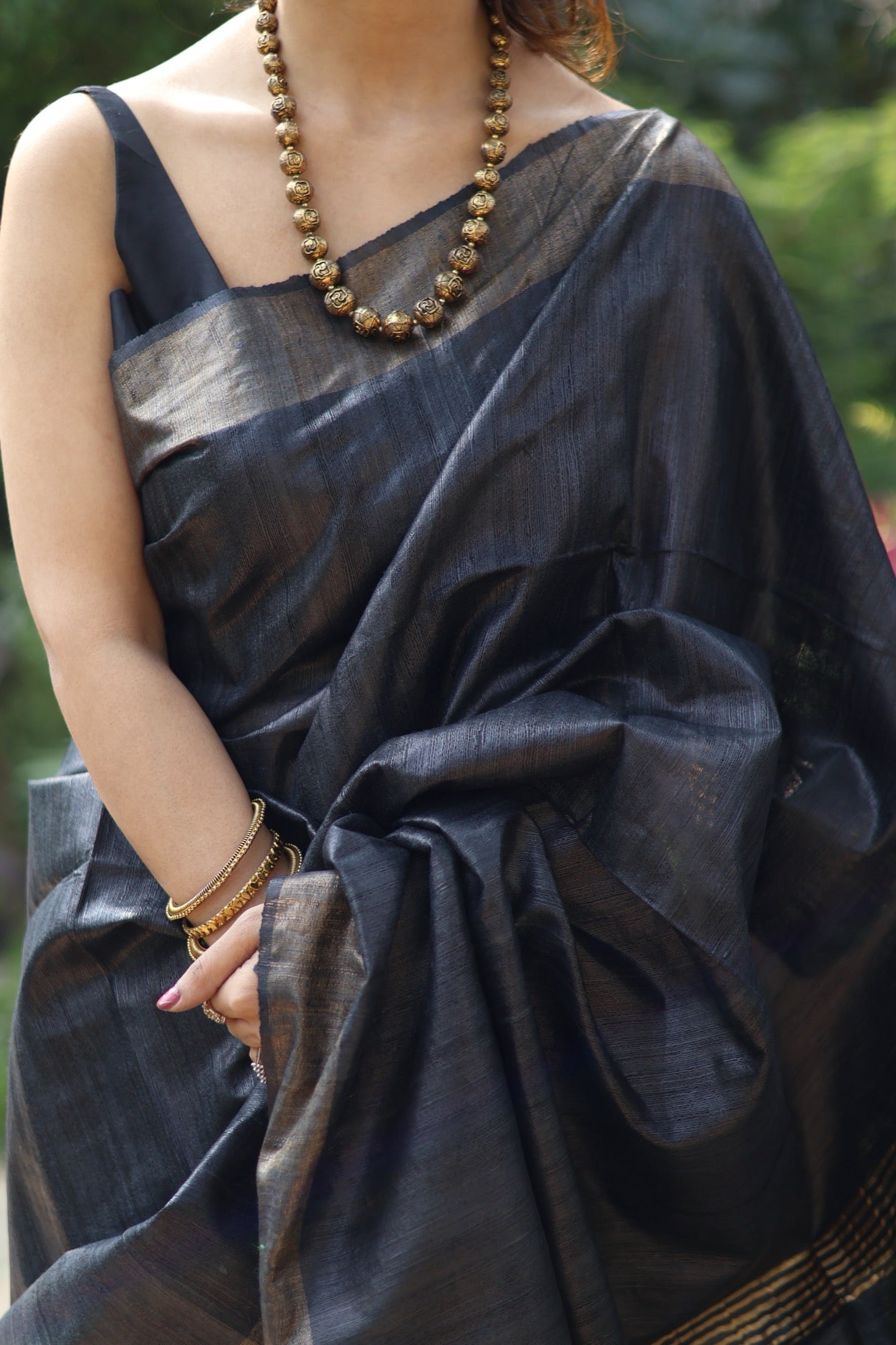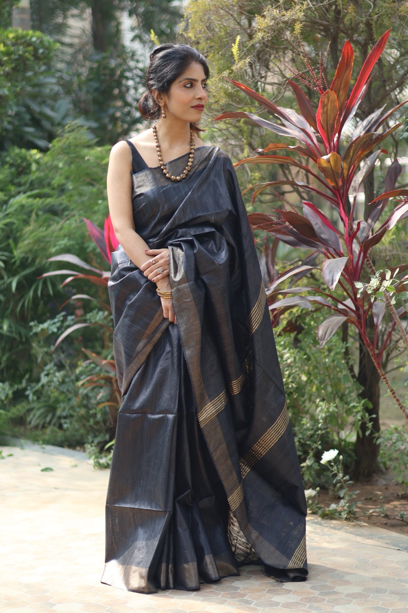 Vira is cut from a different space, bold graphite ghicha tussar, with a natural metallic lift that shapes your frame instead of flowing around it. It falls straight, carries weight, and feels like something you'd wear when you’re stepping into a room with a plan.