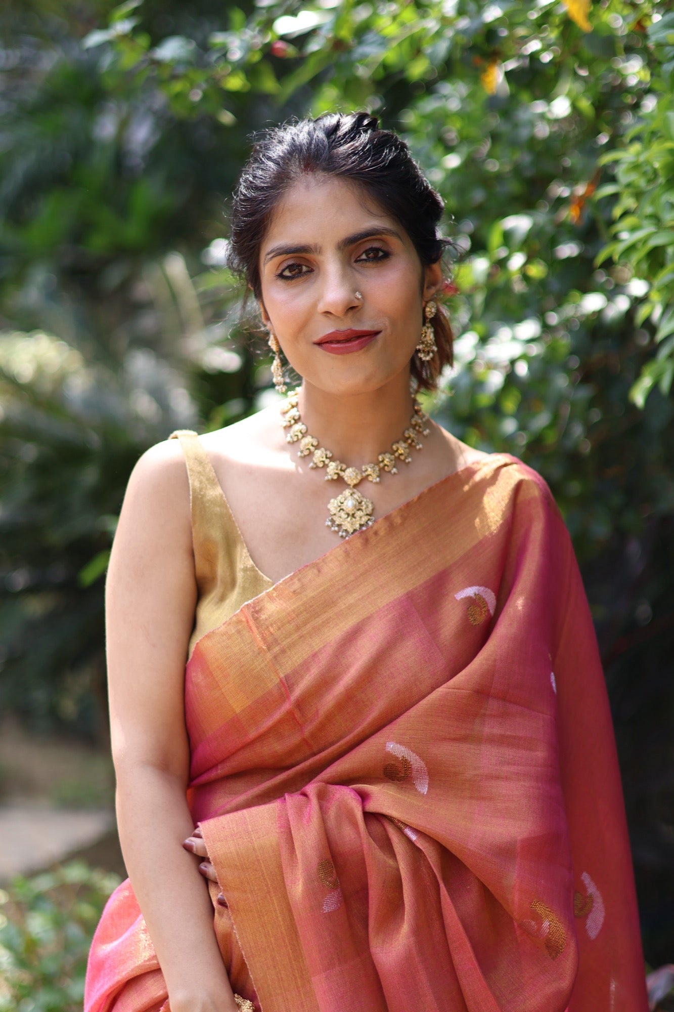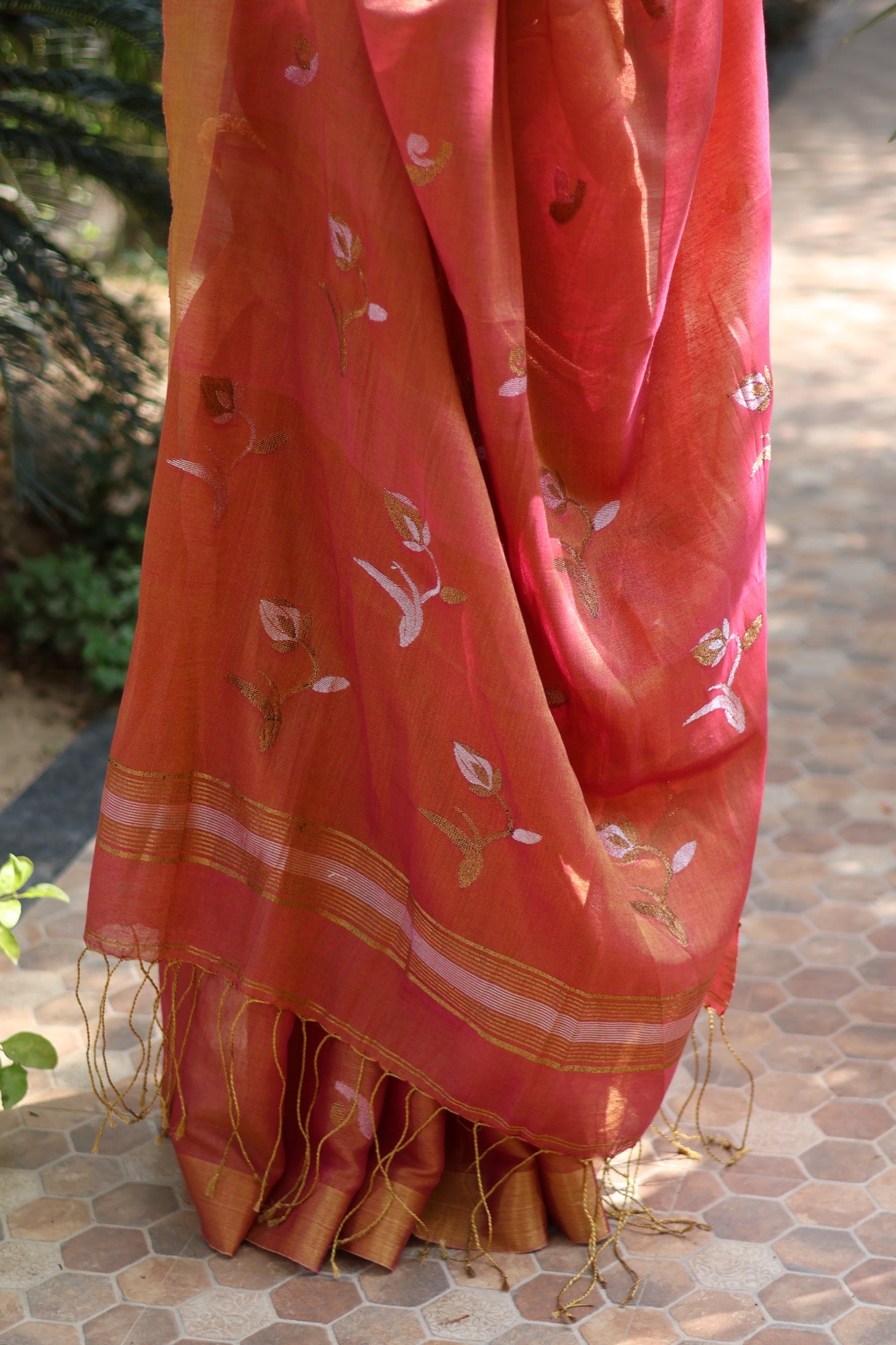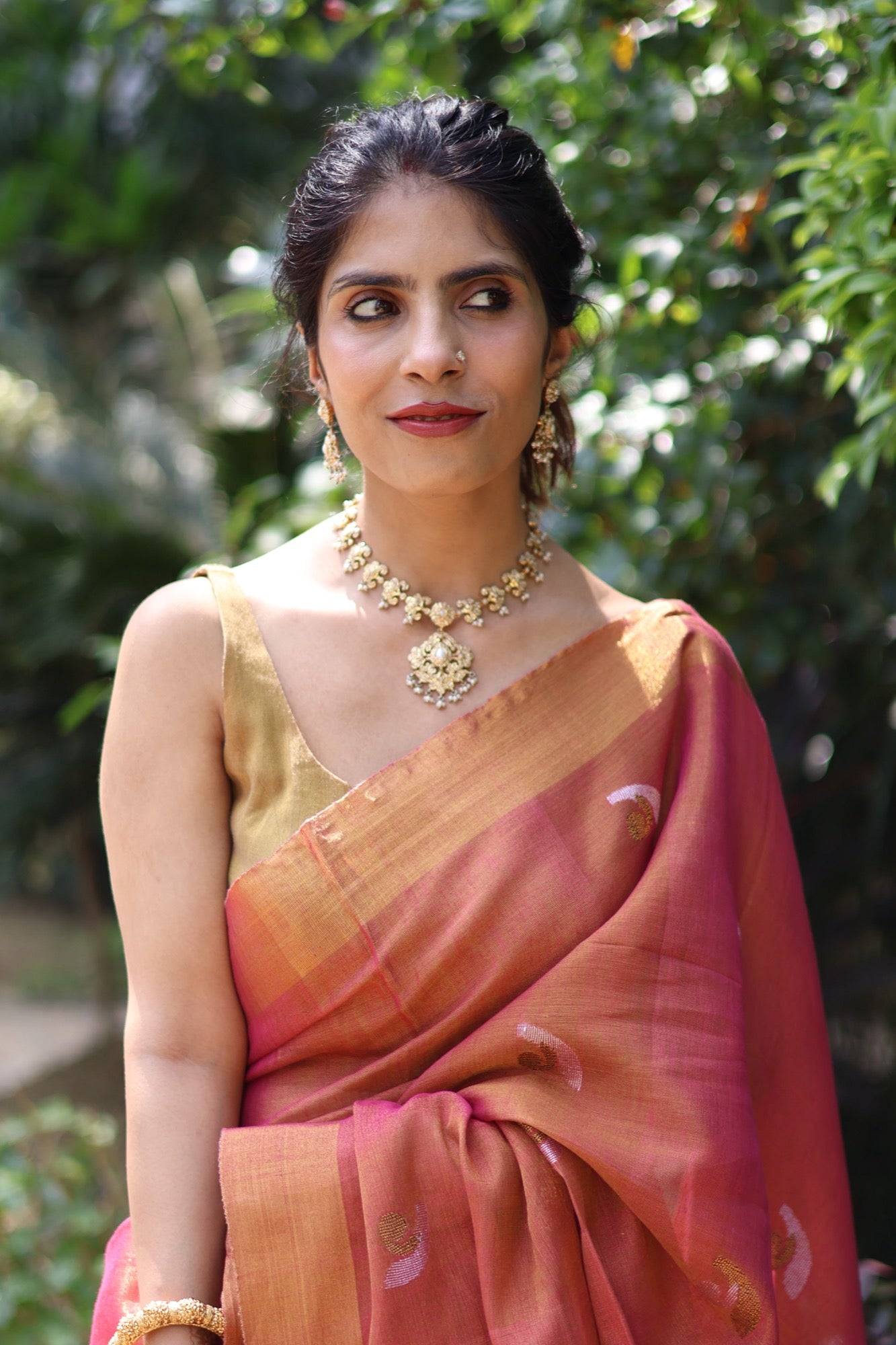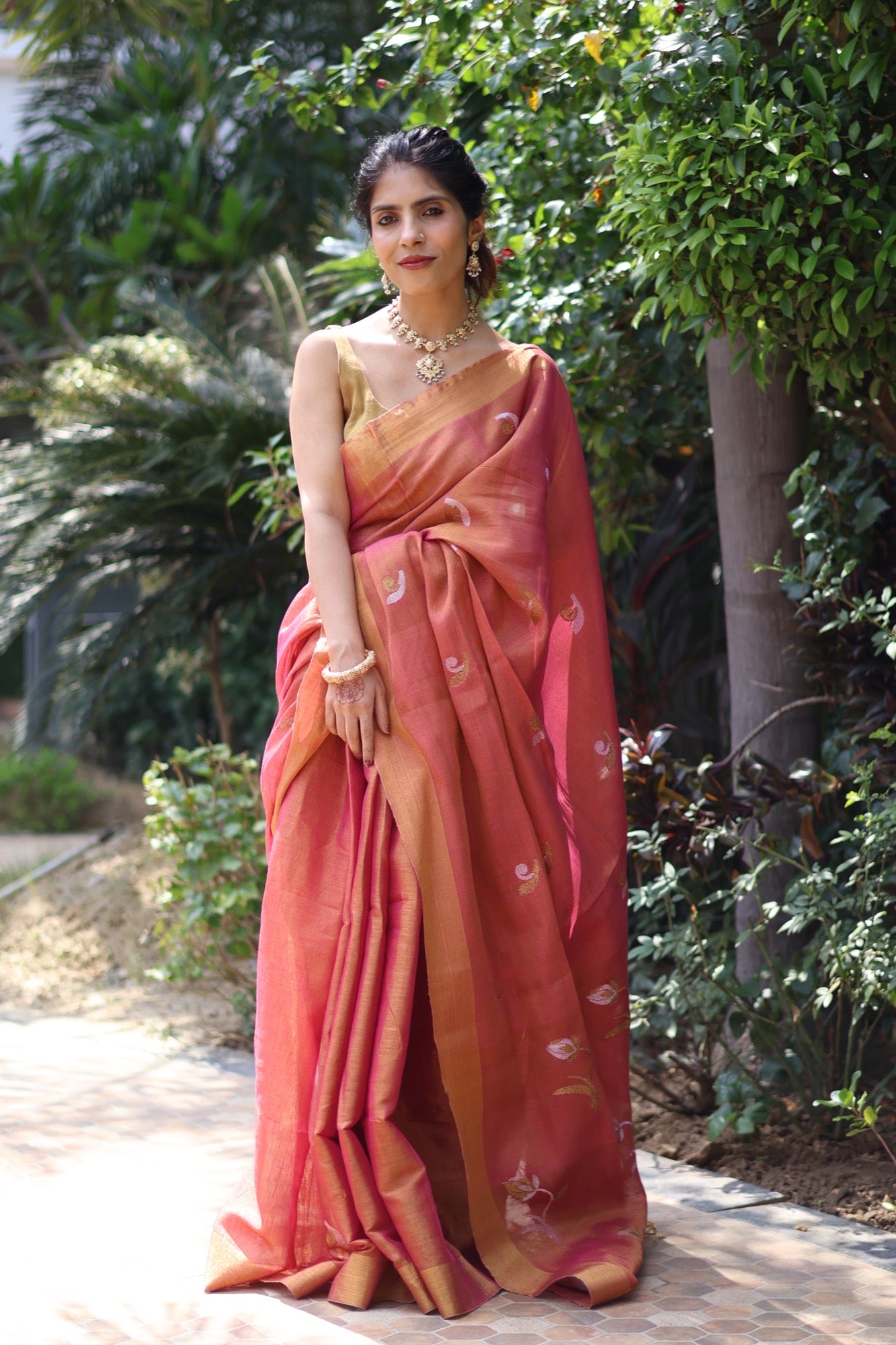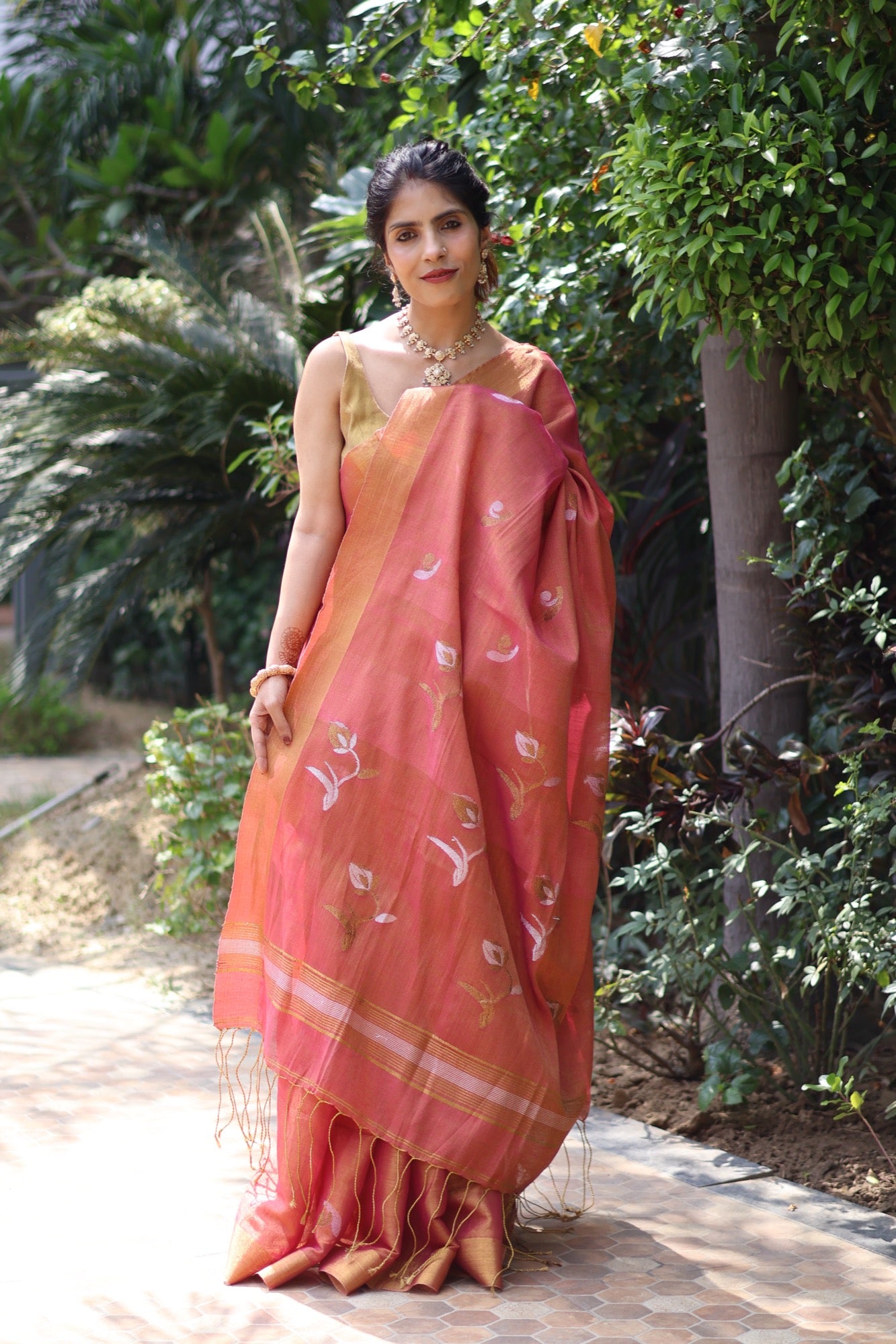 Rust Lotus is where golden hour meets handloom grace. In rich rust and soft pink tones with blooming woven buds and metallic stripes, this saree flows like a warm breeze. The subtle sheen and airy drape make it perfect for brunches, weddings, or just glowing through the day.