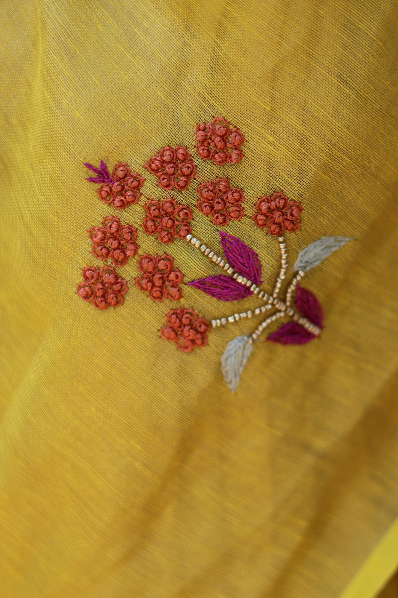 Bright, bold, and beautifully grounded Suhana captures the warmth of sunlight in silk. This golden-yellow tissue linen saree glows with a bronze-toned pallu, dainty sequin work, and soft thread embroidery that blooms gently across the drape. Finished with cheerful tassels, it’s that perfect festive pick for haldi mornings, lunches under the sun, or days when you simply want to feel radiant.